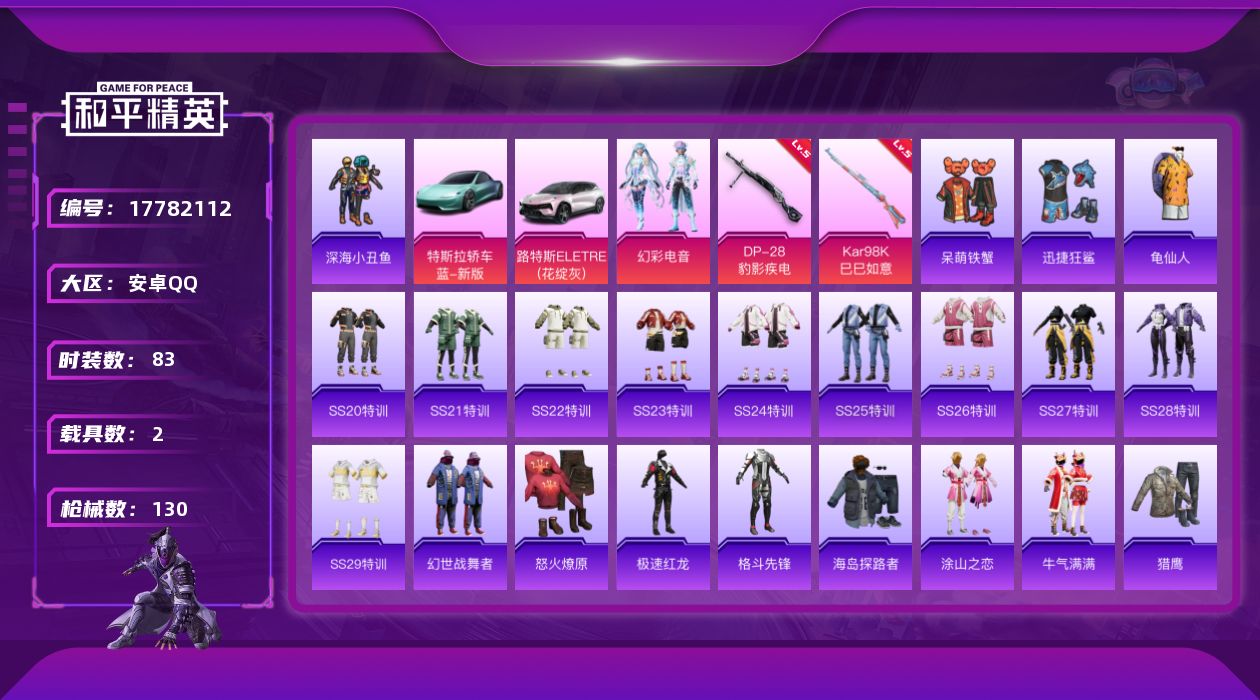 [17782112]安卓 手Q-1粉装-3特效枪-2载具-1粉色飞行器-39048热力值-3王牌印记-83套装-130枪皮 【热门品类】:套装-深海小丑鱼,套装-龟仙人 【粉色套装】:粉装-幻彩电音 【粉色枪皮等级】:Kar98K-巳巳如意(五级),Mk14-福马献瑞(一级),DP-28-豹影疾电(五级) 【粉色载具】:特斯拉Roadster(水滴蓝),路特斯ELETRE(花绽灰) 【粉色枪皮】:Kar98K-巳巳如意,Mk14-福马献瑞,DP-28-豹影疾电 【粉色飞行器】:炫彩糖果飞行器 【粉色降落伞】:梦之光华降落伞,黄族统领降落伞,炫彩糖果降落伞 【稀有套装】:套装-龟仙人,套装-炫彩糖果,套装-马上有钱,套装-雨过天青,套装-红釉青花,角色-幽雨猫猫 【稀有枪皮】:AUG-冰晶雪宝,AKM-破晓战魂,AKM-虎虎生威,AKM-龙的传人,M16A4-幻世战舞者,M16A4-红色方程式,M16A4-蓝色火焰,SCAR-L-炫彩节奏,SCAR-L-玉兔迎春,SCAR-L-红色方程式,M416-摩登王国,M416-糯团青竹,M416-红色方程式,M416-绯红前夜,M416-蓝色火焰,GROZA-2B战斗服款,GROZA-懵萌河马,AUG-天降萌叽,AUG-焰龙焚天,AUG-耀粉歌者,M762-天降萌叽,M762-瑞龙福将,M762-绯红前夜,M762-镭射皇者,M762-登顶巅峰,G36C-懵萌河马,G36C-时空追击者,AC-VAL-天降萌叽,UZI-啾咪啾咪,UZI-炫彩节奏,UZI-烈焰拳霸,UZI-红色方程式,UMP45-夜灯,UMP45-时空追击者,UMP45-涂山之恋,UMP45-蓝色火焰,UMP45-极意拳锋,汤姆逊-天降萌叽,汤姆逊-耀粉歌者,P90-巳巳如意,AWM-飒粉甜心,SKS-心之恋语,SKS-时空追击者,SKS-未来歌姬,SKS-炫彩节奏,Mini14-涂山之恋,Mini14-耀粉歌者,Win94-瑞龙福将,QBU-烈焰拳霸,莫辛纳甘-懵萌河马,M417-惊鸿侠骨,M200-惊鸿侠骨,S686-奇异狩猎者,S686-生命誓言,S12K-玩趣呆呆,S12K-瑞龙福将,S12K-破晓战魂,S12K-幻世战舞者,S12K-极意拳锋,DBS-时空追击者,M249-彩虹符号,M249-破晓战魂,M249-糯团青竹,DP-28-彩虹符号,MG3-幻世战舞者,MG3