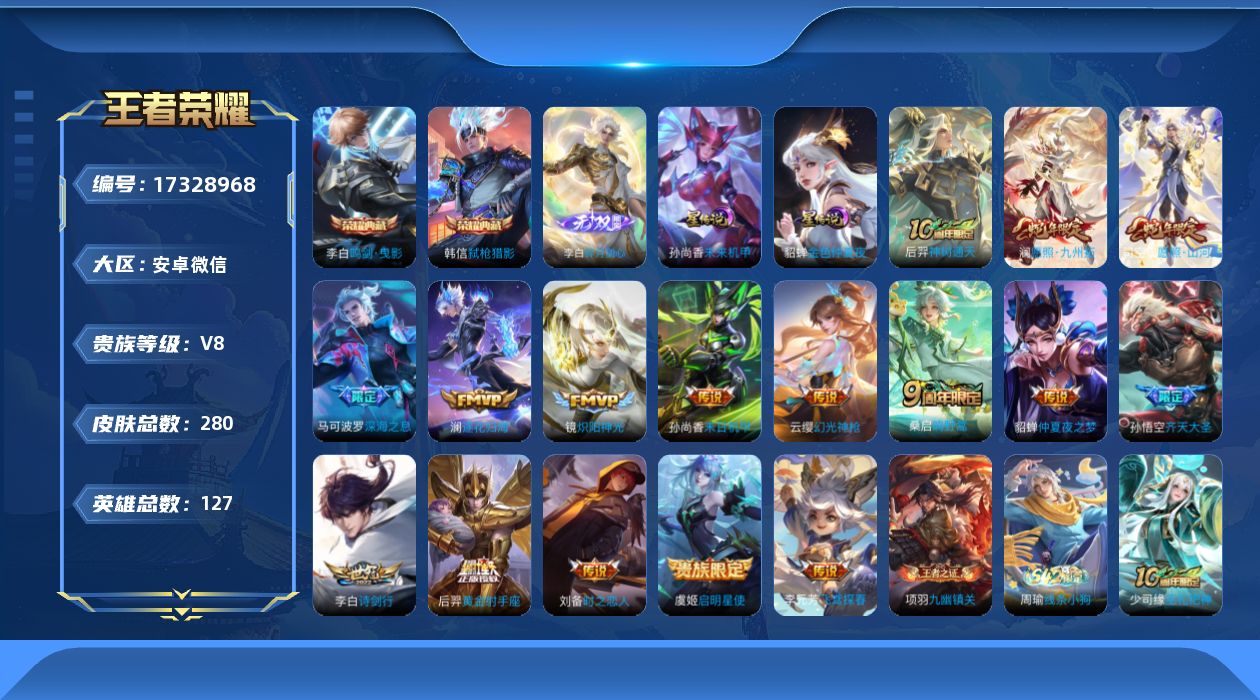 [17328968]安卓WX-V8-最强王者段位-127英雄-280皮肤-2典藏皮肤-1无双-16传说-79史诗