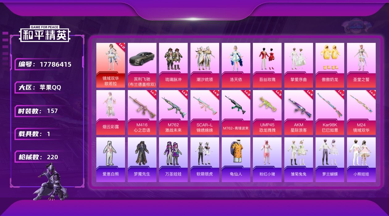 [17786415]苹果 手Q-1神装-10粉装-9特效枪-1载具-2粉色飞行器-77325热力值-11王牌印记-157套装-220枪皮【红色神装等级】:镜域双华-欧若拉(二级)【红色角色神装】:镜域双华-欧若拉【热门品类】:套装-龟仙人,套装-粉红小猪【粉色套装】:粉装-琉璃脉冲,粉装-潮汐统领,角色-洛天依,粉装-苔丝玫瑰,粉装-挚爱序曲,粉装-傲傲奶龙,角色-圣堂之誓,角色-烟云彩露,角色-旋星之夜,人物-小舞·恋语【粉色枪皮等级】:AKM-星际浪客(四级),SCAR-L-锦绣绵绵(五级),M416-心之恋语(七级),M762-激战未来(六级),M762-青锋波束(五级),UMP45-恐龙拽拽(五级),Kar98K-巳巳如意(三级),M24-镜域双华(三级),PKM-萌骑夺宝(二级)【粉色载具】:宾利飞驰(布罗德盖棕双色)【粉色枪皮】:AKM-星际浪客,SCAR-L-锦绣绵绵,M416-心之恋语,M762-激战未来,M762-青锋波束,UMP45-恐龙拽拽,Kar98K-巳巳如意,M24-镜域双华,PKM-萌骑夺宝【粉色飞行器】:镜域双华-灵镜之阶,云梦轻舟飞行器