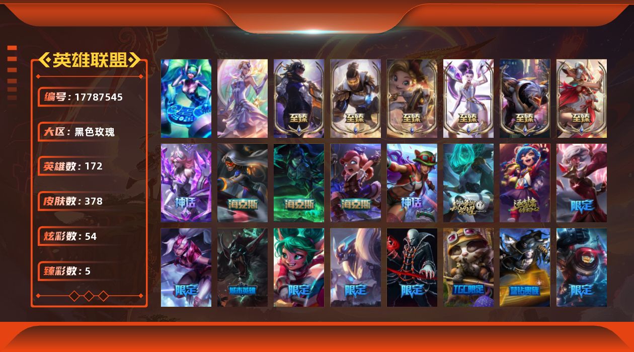 未定级段位-172英雄-378皮肤-54炫彩-2终极-13神话-56限定-38传说-83史诗