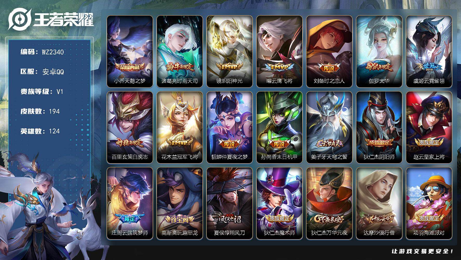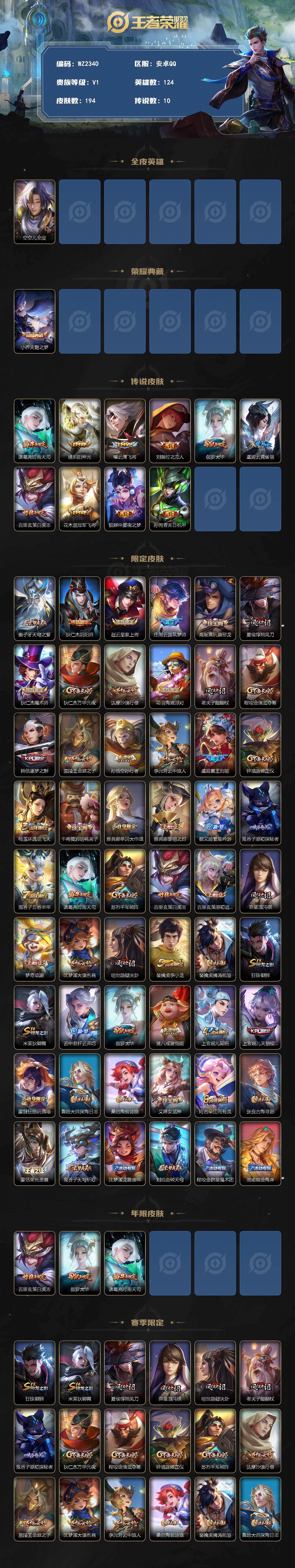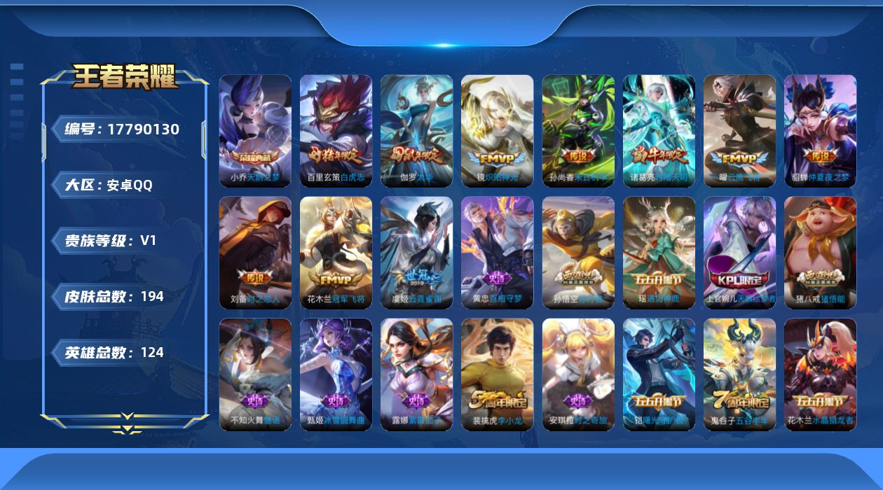 - [11627196]V7 1典藏 10传说 125英雄 219皮肤 可修改实名 优质装备:九霄神辉(木兰典藏),云鹰飞将(小将军),久胜战神,一念神魔,无双飞将,山海·炽霜斩(李信年限),澜逐花归海 珍宝阁皮:妄想食味,蔷薇恋人,女武神 限定皮:愿照·岁时盈(虞姬年限),愿照·千秋盛(女娲年限),鸣野蒿,时雨天司(水龙头),遇见飞天,高山流水,五谷丰年,梁祝,李小龙,孙行者,山海·玄木吟(马可年限) 史诗皮:化蝶舞,星界战将,龙之律动,石田雨龙,谪仙醉月,百相守梦-黄忠,紫霞仙子,特工魅影,百相守梦(关羽),电玩·爆裂旋风,江河有灵,蒙恬荣光圣徽,偶像歌手,龙骑士(小龙虾),无限星赏官,末日机甲-吕布,猫狗日记-孙策,时之恋人-孙尚香,乱世虎臣,节奏热浪,修罗,女仆咖啡,摇滚巨星,水果甜心,绅士熊喵,天才门将,星夜王子,心灵骇客,时之奇旅-安琪拉,功夫厨神,德古拉伯爵,暗隐猎兽者,幽灵船长,鬼剑武藏,纤云弄巧,乘风破浪,逐浪之夏,月团寄思,水晶猎龙者,曙光守护者,金属风暴,圣诞恋歌,鹰眼统帅,魅力维加斯,无心,未来纪元-赵云