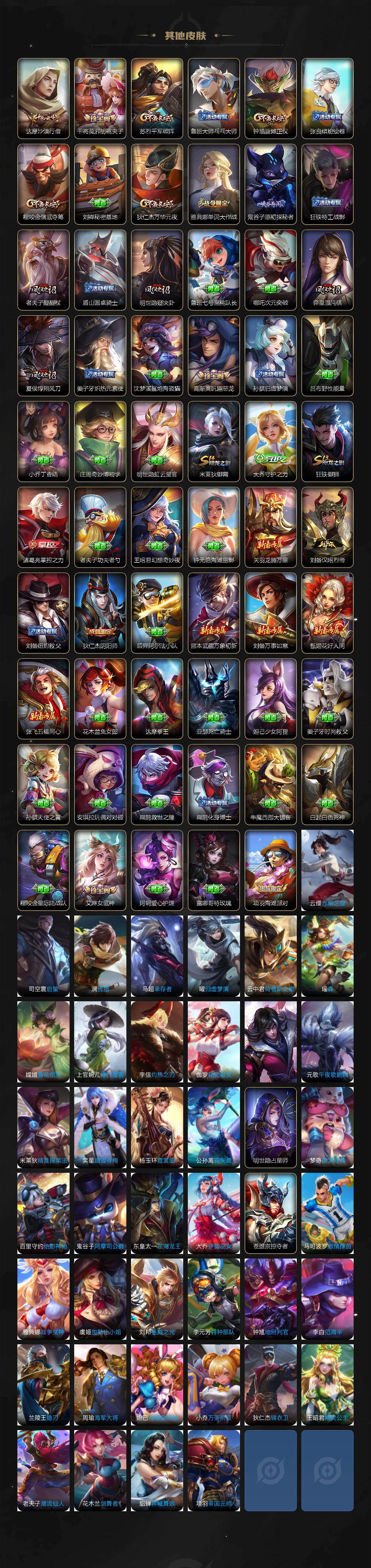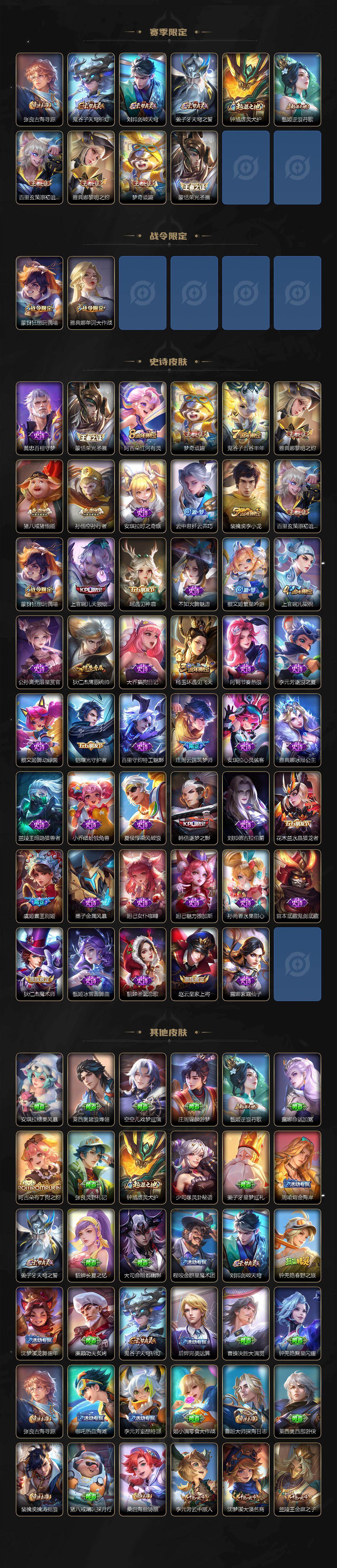 【限定皮肤】:姜子牙天穹之誓,狄仁杰阴阳师,赵云皇家上将,庄周云端筑梦师,高渐离玩趣恶龙,夏侯惇朔风刀,狄仁杰魔术师,狄仁杰万华元夜,达摩沙漠行僧,项羽海滩派对,老夫子醍醐杖,程咬金演武夺筹,韩信逐梦之影,兰陵王金庭之子,孙悟空孙行者,李元芳云中旅人,虞姬霸王别姬,钟馗驱傩正仪,杨玉环遇见飞天,干将莫邪胡桃夹子,雅典娜单词大作战,雅典娜黎明之约,蔡文姬繁星吟游,鬼谷子原初探秘者,鬼谷子五谷丰年,诸葛亮时雨天司,苏烈千军破阵,百里玄策白虎志,百里玄策原初追逐者,弈星混沌棋,梦奇顽趣,沈梦溪大漠名商,明世隐疑决卦,裴擒虎李小龙,裴擒虎擒涛扼浪,狂铁御狮,米莱狄御霄,云中君纤云弄巧,伽罗太华,猪八戒猪悟能,上官婉儿梁祝,上官婉儿天狼绘梦者,蒙犽狂想玩偶喵,鲁班大师探海日志,桑启海盐诗旅,艾琳女武神,阿古朵江河有灵,张良古海寻踪,蒙恬荣光圣徽,鬼谷子天穹祈灯,沈梦溪龙舞盛年,刘邦剑破天穹,程咬金群星魔术团,周瑜熔金海岸