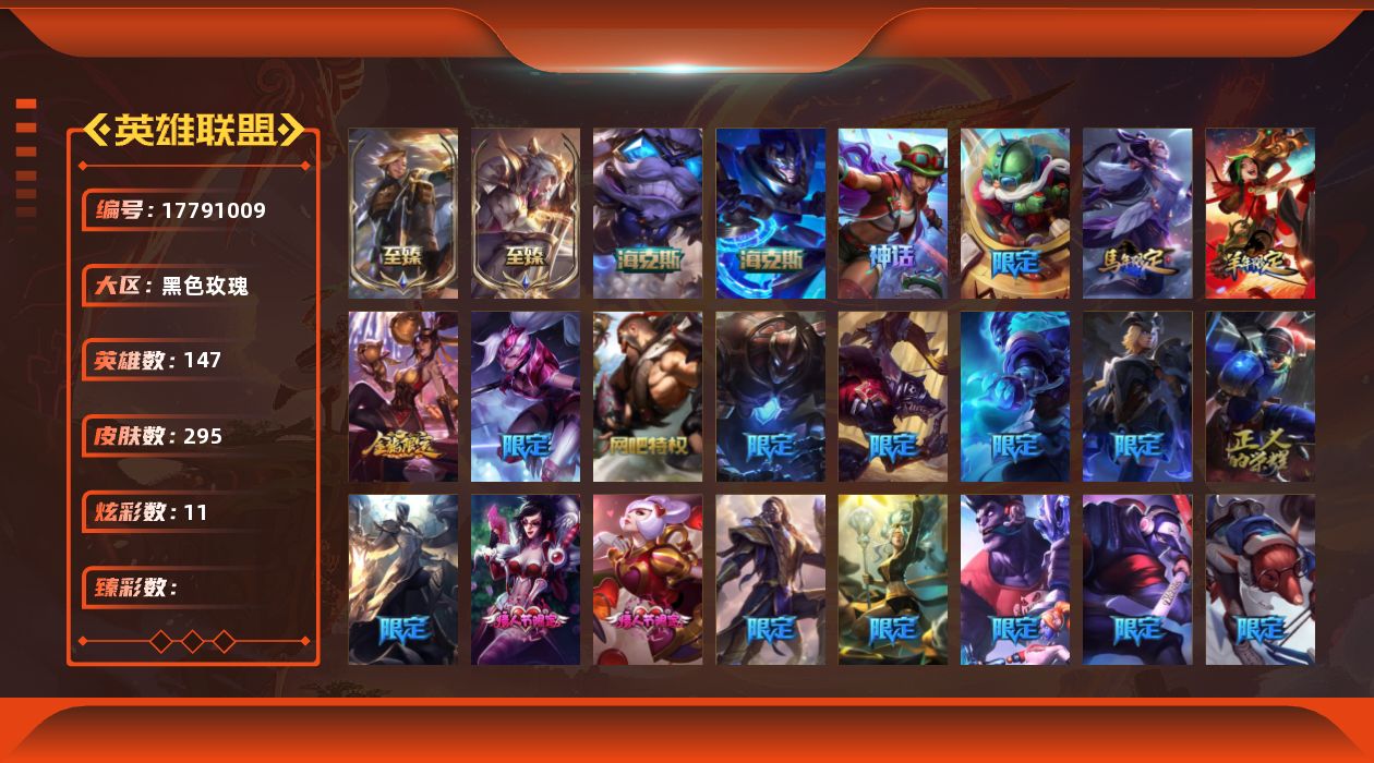 [17791009]【可二次特价出售/店主推荐】未定级段位-147英雄-295皮肤-11炫彩-0终极-5神话-33限定-29传说-62史诗