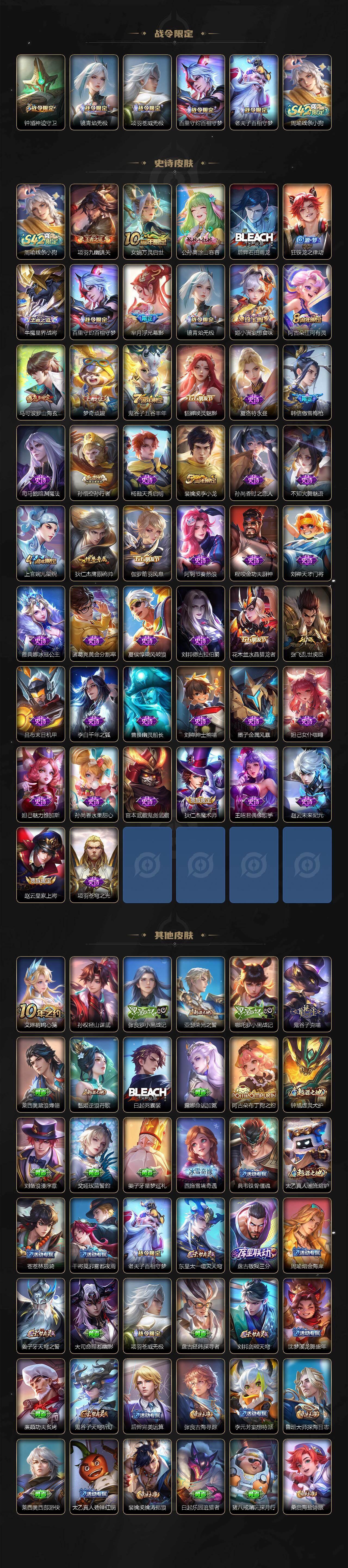 【史诗皮肤】:周瑜线条小狗,项羽九幽镇关,女娲万灵启世,公孙离涂山容容,后羿石田雨龙,狂铁龙之律动,牛魔星界战将,百里守约百相守梦,芈月浮光幕影,镜青焰无极,姬小满妄想食味,阿古朵江河有灵,马可波罗山海玄木吟,梦奇顽趣,鬼谷子五谷丰年,貂蝉唤灵魅影,夏洛特永昼,韩信傲雪梅枪,司马懿暗渊魔法,孙悟空孙行者,杨戬天秀启明,裴擒虎李小龙,孙尚香时之恋人,不知火舞魅语,上官婉儿梁祝,狄仁杰鹰眼统帅,伽罗箭羽风息,阿轲节奏热浪,程咬金功夫厨神,刘禅天才门将,雅典娜冰冠公主,诸葛亮黄金分割率,夏侯惇乘风破浪,刘邦德古拉伯