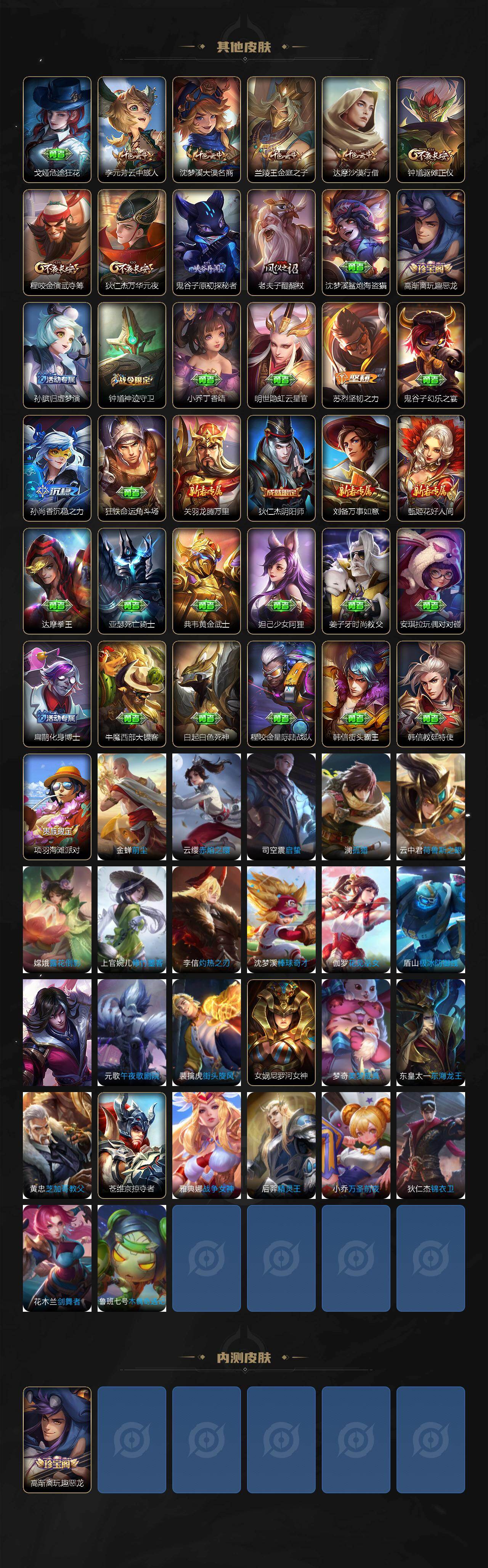 【限定皮肤】:姜子牙天穹之誓,狄仁杰阴阳师,赵云皇家上将,高渐离玩趣恶龙,马可波罗山海玄木吟,狄仁杰魔术师,狄仁杰万华元夜,达摩沙漠行僧,项羽海滩派对,老夫子醍醐杖,程咬金演武夺筹,韩信傲雪梅枪,兰陵王金庭之子,孙悟空孙行者,李元芳云中旅人,钟馗神迹守卫,钟馗驱傩正仪,鬼谷子原初探秘者,鬼谷子五谷丰年,梦奇顽趣,沈梦溪大漠名商,裴擒虎李小龙,裴擒虎擒涛扼浪,上官婉儿梁祝,鲁班大师探海日志,桑启海盐诗旅,阿古朵江河有灵,张良古海寻踪,鬼谷子天穹祈灯,姬小满妄想食味,沈梦溪龙舞盛年,刘邦剑破天穹,镜青焰无极,项羽苍威无极,芈月浮光幕影,周瑜熔金海岸