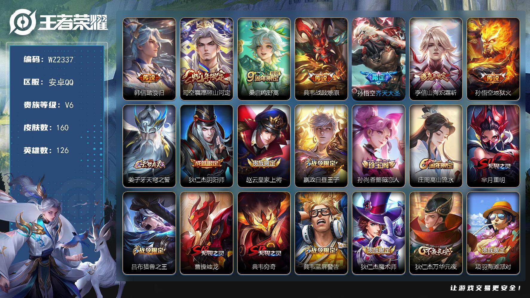 [17791344]安卓Q-160皮肤-7传说-35史诗 【传说皮肤】:韩信踏浪归,司空震愿照山河定,桑启鸣野蒿,典韦战鼓燎原,孙悟空齐天大圣,李信山海炽霜斩,孙悟空地狱火 【限定皮肤】:姜子牙天穹之誓,狄仁杰阴阳师,赵云皇家上将,嬴政白昼王子,孙尚香蔷薇恋人,庄周高山流水,芈月重明,吕布猎兽之王,曹操烛龙,典韦穷奇,典韦蓝屏警告,狄仁杰魔术师,狄仁杰万华元夜,项羽海滩派对,老夫子醍醐杖,孙悟空大圣娶亲,孙悟空齐天大圣,牛魔御旌,李元芳云中旅人,钟馗驱傩正仪,女娲朔望之晖,蔡文姬繁星吟游,鬼谷子原初探秘者,弈星混沌棋,沈梦溪匿光破解者,明世隐疑决卦,裴擒虎李小龙,裴擒虎擒涛扼浪,狂铁御狮,米莱狄御霄,李信山海炽霜斩,盾山御銮,上官婉儿梁祝,嫦娥拒霜思,西施玲珑珍味,鲁班大师探海日志,桑启海盐诗旅,阿古朵江河有灵,张良古海寻踪,鬼谷子天穹祈灯,沈梦溪龙舞盛年,刘邦剑破天穹,周瑜熔金海岸 【年限皮肤】:李信山海炽霜斩,司空震愿照山河定 【赛季限定】:曹操烛龙,芈月重明,典韦穷奇,狂铁御狮,米莱狄御霄,牛魔御旌,盾山御銮,弈星混沌棋,明世隐疑决卦,老夫子醍醐杖,鬼谷子原初探秘者,狄仁杰万华元夜,钟馗驱傩正仪,李元芳云中旅人,桑启海盐诗旅,裴擒虎擒涛扼浪,鲁班大师探海日志,张良古海寻踪,鬼谷子天穹祈灯,刘邦剑破天穹,姜子牙天穹之誓,甄姬逆浪荇歌 【战令限定】:嬴政白昼王子,吕布猎兽之王,典韦蓝屏警告,女娲朔望之晖,西施玲珑珍味,周瑜线条小狗 【史诗皮肤】:明世隐百晓客,周瑜线条小狗,狂铁龙之律动,阿轲化蝶舞,阿古朵江河有灵,沈梦溪匿光破解者,嫦娥拒霜思,庄周高山流水,安琪拉时之奇旅,裴擒虎李小龙,蔡文姬繁星吟游,上官婉儿梁祝,狄仁杰鹰眼统帅,典韦蓝屏警告,孙悟空大圣娶亲,嬴政白昼王子,白起星夜王子,李元芳逐浪之夏,蔡文姬舞动绿茵,百里守约特工魅影,安琪拉心灵骇客,兰陵王暗隐猎兽者,夏侯惇乘风破浪,曹操幽灵船长,墨子金属风暴,妲己魅力维加斯,嬴政摇滚巨星,孙尚香水果甜心,孙尚香蔷薇恋人,宫本武藏鬼剑武藏,狄仁杰魔术师,王昭君偶像歌手,甄姬冰雪圆舞曲,貂蝉圣诞恋歌,赵云未来纪元,赵云皇家上将 【其他皮肤】:鲁班七号班班快跑,妲己线条小狗,桑启线条小狗,虞姬溯影追猎,甄姬逆浪荇歌,戈娅玫蓝誓约,东皇太一金福满堂,西施雪境奇遇,典韦铁骨偃魂,苍苍林狼骑,干将莫邪雾都夜雨,周瑜熔金海岸,姜子牙天穹之誓