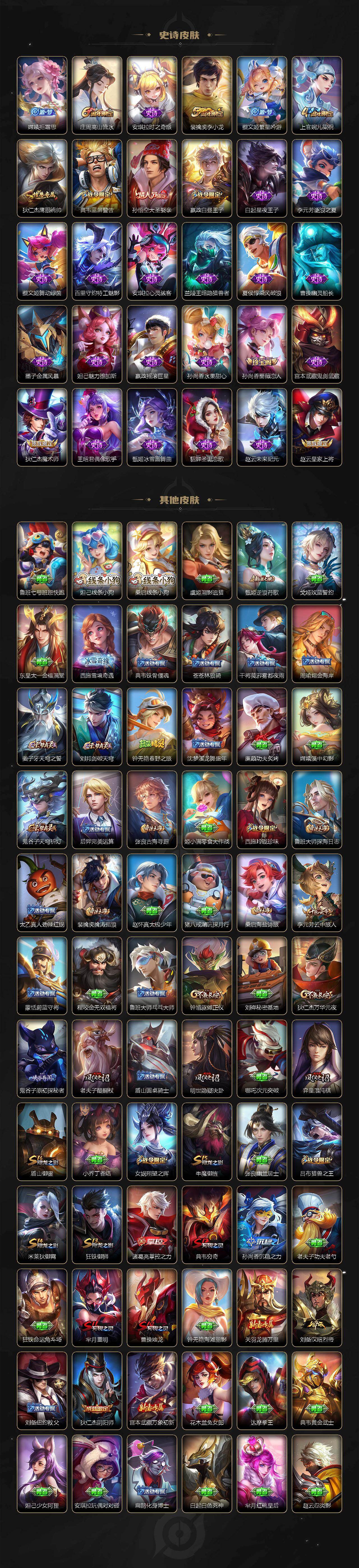 【史诗皮肤】:明世隐百晓客,周瑜线条小狗,狂铁龙之律动,阿轲化蝶舞,阿古朵江河有灵,沈梦溪匿光破解者,嫦娥拒霜思,庄周高山流水,安琪拉时之奇旅,裴擒虎李小龙,蔡文姬繁星吟游,上官婉儿梁祝,狄仁杰鹰眼统帅,典韦蓝屏警告,孙悟空大圣娶亲,嬴政白昼王子,白起星夜王子,李元芳逐浪之夏,蔡文姬舞动绿茵,百里守约特工魅影,安琪拉心灵骇客,兰陵王暗隐猎兽者,夏侯惇乘风破浪,曹操幽灵船长,墨子金属风暴,妲己魅力维加斯,嬴政摇滚巨星,孙尚香水果甜心,孙尚香蔷薇恋人,宫本武藏鬼剑武藏,狄仁杰魔术师,王昭君偶像歌手,甄姬冰雪圆舞曲,貂蝉圣诞恋歌,赵云未来纪元,赵云皇家上将