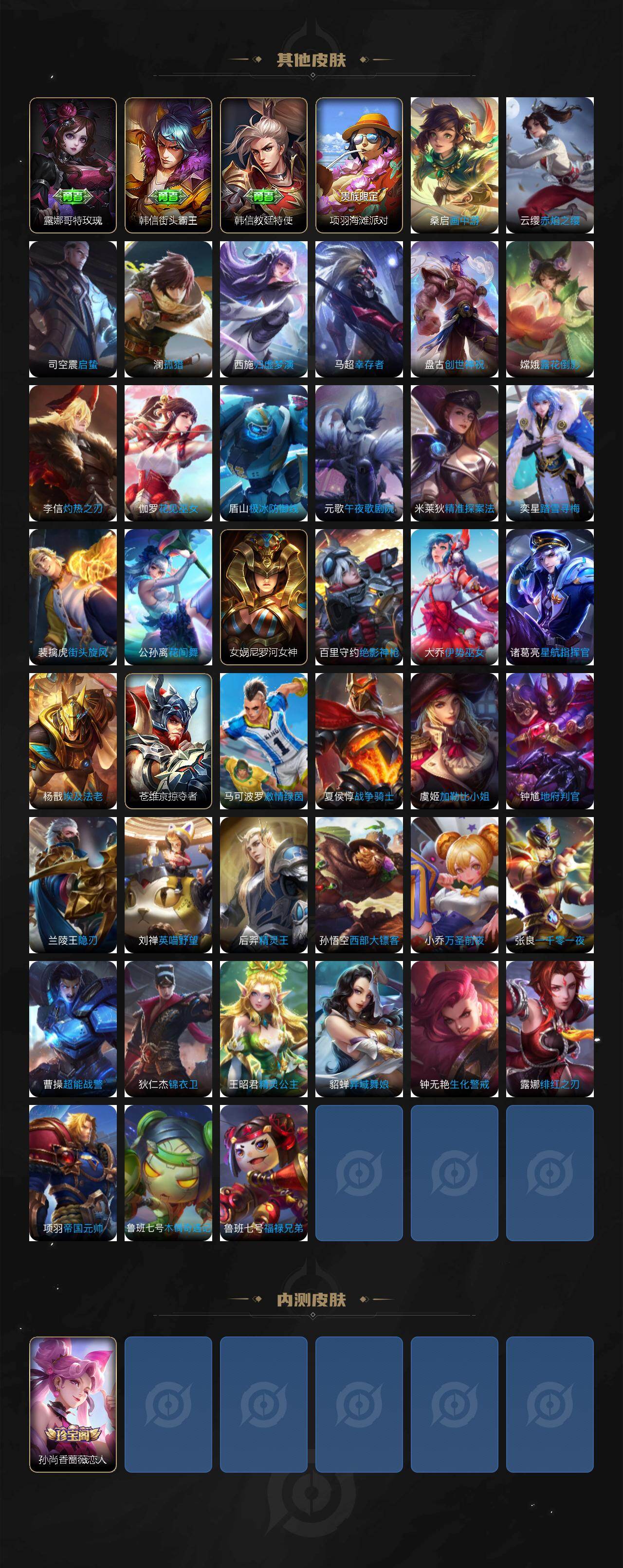 【赛季限定】:曹操烛龙,芈月重明,典韦穷奇,狂铁御狮,米莱狄御霄,牛魔御旌,盾山御銮,弈星混沌棋,明世隐疑决卦,老夫子醍醐杖,鬼谷子原初探秘者,狄仁杰万华元夜,钟馗驱傩正仪,李元芳云中旅人,桑启海盐诗旅,裴擒虎擒涛扼浪,鲁班大师探海日志,张良古海寻踪,鬼谷子天穹祈灯,刘邦剑破天穹,姜子牙天穹之誓,甄姬逆浪荇歌