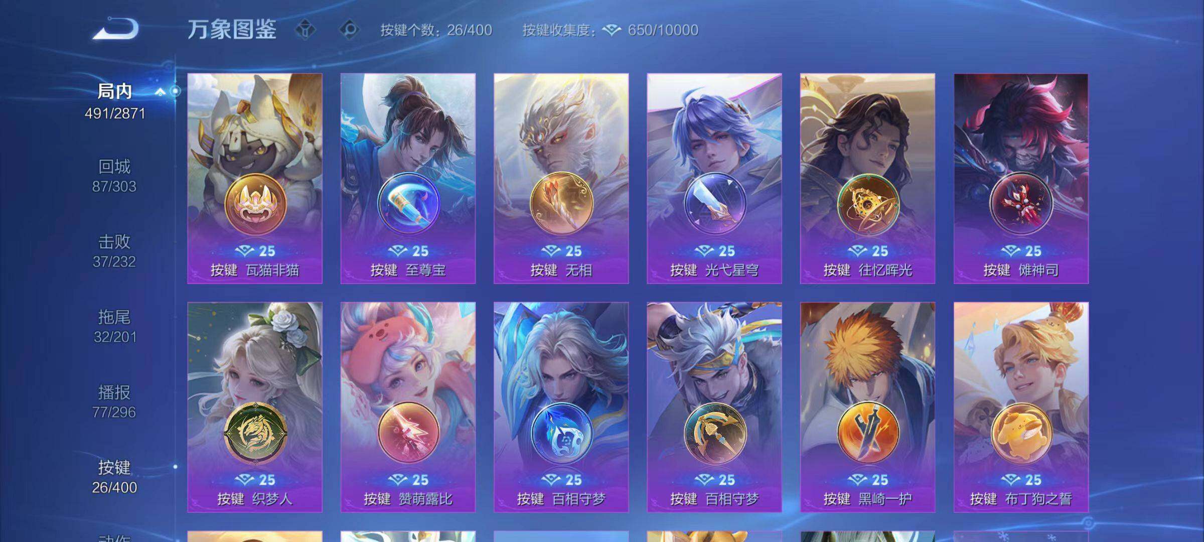 白起狰,太乙真人饕餮,曹操烛龙,芈月重明,典韦穷奇,狂铁御狮,米莱狄御霄,牛魔御旌,盾山御銮,夏侯惇朔风刀,明世隐疑决卦,老夫子醍醐杖,鬼谷子原初探秘者,狄仁杰万华元夜,程咬金演武夺筹,钟馗驱傩正仪,苏烈千军破阵,女娲朔望之晖,典韦蓝屏警告,钟馗神迹守卫,鲁班七号狮舞东方,沈梦溪星空之诺,李元芳银河之约,刘邦夺宝奇兵,马可波罗暗影游猎,元歌云间偶戏,弈星混沌棋,达摩沙漠行僧,兰陵王金庭之子,沈梦溪大漠名商,李元芳云中旅人,桑启海盐诗旅,裴擒虎擒涛扼浪,鲁班大师探海日志,张良古海寻踪,项羽苍威无极,镜青焰无极