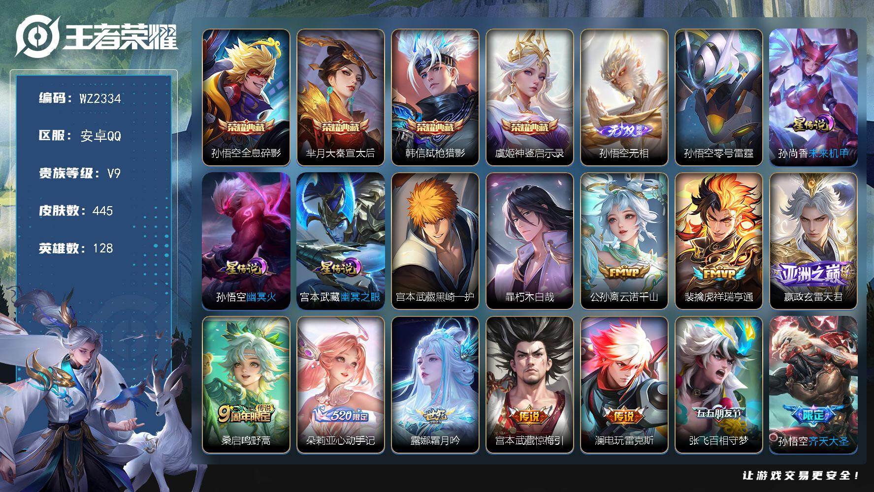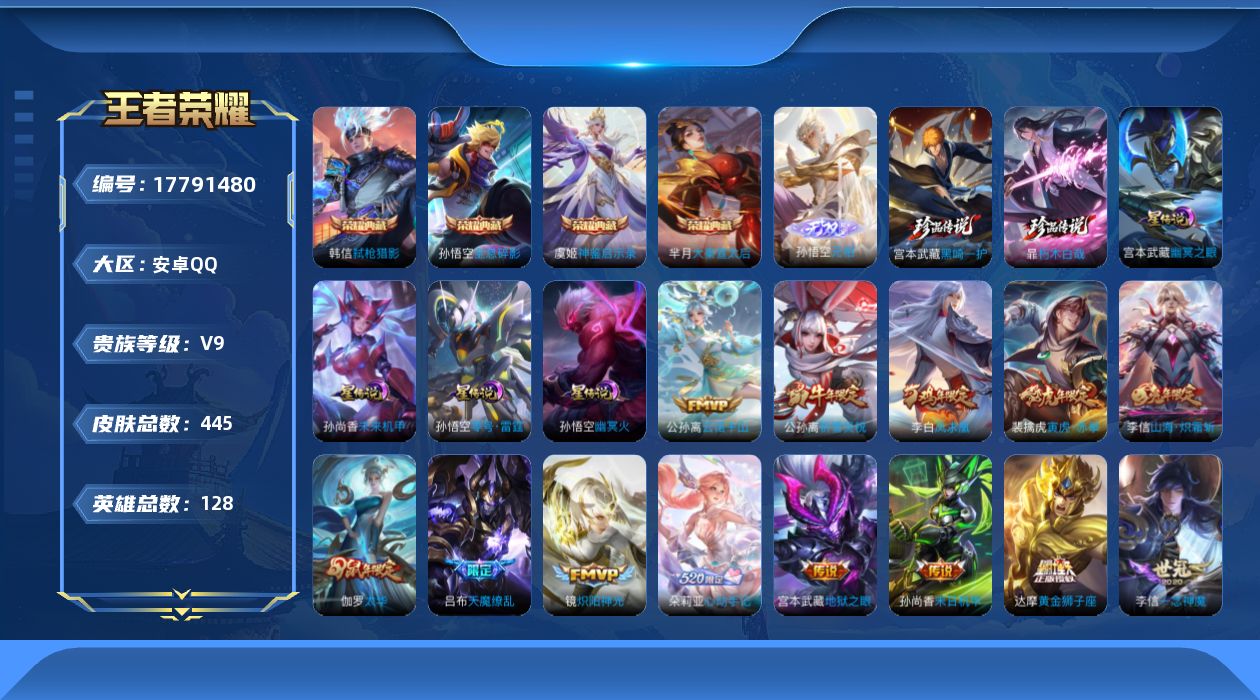 - [12948400]安卓Q-V5-永恒钻石I段位-122英雄-223皮肤-1典藏-1传说-50史诗 【英雄全皮】:猪八戒全皮 【荣耀典藏】:孙尚香杀手不太冷 【传说皮肤】:孙悟空地狱火 【限定皮肤】:姜子牙天穹之誓,狄仁杰阴阳师,赵云皇家上将,墨子神迹守卫,嬴政优雅恋人,鲁班七号狮舞东方,庄周高山流水,阿轲迷踪丽影,钟无艳王者之锤,钟无艳超时空战士,周瑜赤莲之焰,元歌云间偶戏,夏侯惇朔风刀,甄姬落雪兰心,典韦蓝屏警告,马可波罗暗影游猎,狄仁杰魔术师,狄仁杰万华元夜,达摩星际陆战队,项羽海滩派对,老夫子醍醐杖,老夫子航海奇遇记,程咬金演武夺筹,刘邦夺宝奇兵,韩信飞衡,王昭君午后时光,兰陵王驯魔猎人,兰陵王金庭之子,亚瑟潮玩骑士王,孙悟空至尊宝,牛魔御旌,后羿圣弓游侠,李元芳银河之约,李元芳云中旅人,钟馗神迹守卫,钟馗驱傩正仪,女娲朔望之晖,干将莫邪真爱魔法,雅典娜单词大作战,蔡文姬繁星吟游,太乙真人华丽摇滚,鬼谷子原初探秘者,鬼谷子五谷丰年,苏烈千军破阵,百里玄策原初追逐者,弈星混沌棋,沈梦溪星空之诺,沈梦溪大漠名商,明世隐疑决卦,狂铁电玩高手,米莱狄胡桃异想国,云中君纤云弄巧,盾山御銮,猪八戒西部大镖客,猪八戒猪悟能,上官婉儿梁祝,嫦娥暖冬兔眠,西施玲珑珍味,鲁班大师探海日志,桑启海盐诗旅,暃星界游侠,戈娅驭风魔法,张良古海寻踪 【年限皮肤】:韩信飞衡 【赛季限定】:夏侯惇朔风刀,狄仁杰万华元夜,老夫子醍醐杖,程咬金演武夺筹,兰陵王金庭之子,张良古海寻踪,牛魔御旌,李元芳云中旅人,钟馗驱傩正仪,鬼谷子原初探秘者,苏烈千军破阵,百里玄策原初追逐者,弈星混沌棋,沈梦溪大漠名商,明世隐疑决卦,盾山御銮,鲁班大师探海日志,桑启海盐诗旅,姜子牙天穹之誓 【战令限定】:墨子神迹守卫,鲁班七号狮舞东方,阿轲迷踪丽影,钟无艳超时空战士,周瑜赤莲之焰,元歌云间偶戏,甄姬落雪兰心,典韦蓝屏警告,马可波罗暗影游猎,达摩星际陆战队,老夫子航海奇遇记,刘邦夺宝奇兵,王昭君午后时光,兰陵王驯魔猎人,亚瑟潮玩骑士王,后羿圣弓游侠,李元芳银河之约,钟馗神迹守卫,女娲朔望之晖,干将莫邪真爱魔法,雅典娜单词大作战,沈梦溪星空之诺,狂铁电玩高手,米莱狄胡桃异想国,猪八戒西部大镖客,嫦娥暖冬兔眠,西施玲珑珍味,暃星界游侠,戈娅驭风魔法 【史诗皮肤】:项羽苍穹之光,露娜紫霞仙子,钟无艳王者之锤,赵云皇家上将,赵云未来纪元,貂