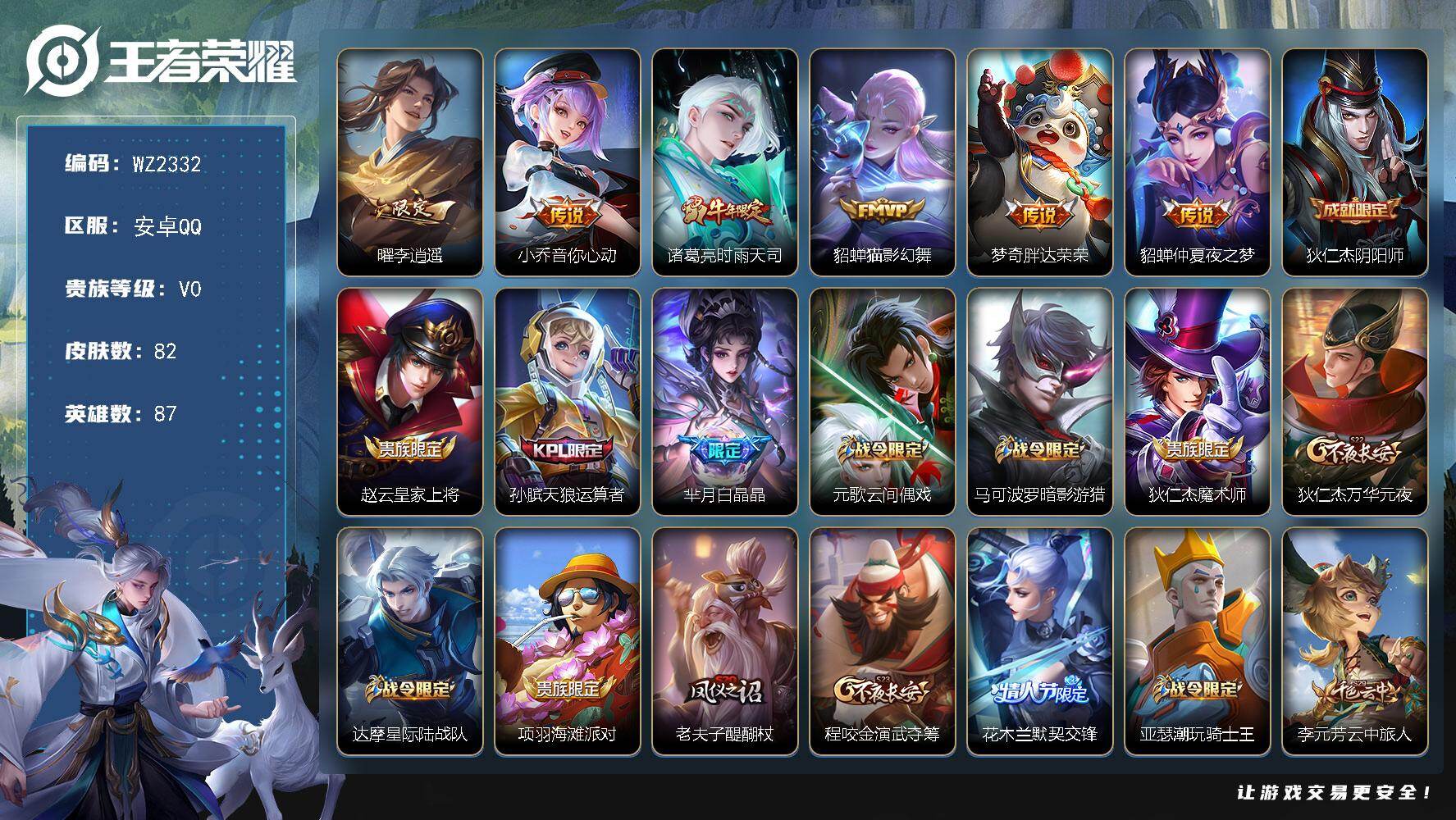 - [16649312]安卓Q-V8-荣耀黄金IV段位-104英雄-131皮肤-1典藏英雄-9传说-23史诗 【荣耀典藏】:武则天英雄 【传说皮肤】:虞姬启明星使,干将莫邪久胜战神,虞姬云霓雀翎,达摩黄金狮子座,貂蝉仲夏夜之梦,孙尚香末日机甲,宫本武藏地狱之眼,孙悟空地狱火,武则天海洋之心 【限定皮肤】:狄仁杰阴阳师,赵云皇家上将,嬴政白昼王子,鲁班七号狮舞东方,吕布猎兽之王,夏侯惇朔风刀,典韦穷奇,典韦蓝屏警告,狄仁杰魔术师,项羽海滩派对,老夫子醍醐杖,程咬金演武夺筹,露娜一生所爱,孙悟空大圣娶亲,牛魔御旌,虞姬启明星使,钟馗神迹守卫,钟馗驱傩正仪,女娲朔望之晖,太乙真人华丽摇滚,弈星混沌棋,明世隐疑决卦,裴擒虎天狼狩猎者,狂铁御狮,米莱狄御霄,盾山御銮 【赛季限定】:典韦穷奇,狂铁御狮,米莱狄御霄,牛魔御旌,盾山御銮,夏侯惇朔风刀,弈星混沌棋,明世隐疑决卦,老夫子醍醐杖,程咬金演武夺筹,钟馗驱傩正仪 【战令限定】:嬴政白昼王子,吕布猎兽之王,典韦蓝屏警告,女娲朔望之晖,鲁班七号狮舞东方,钟馗神迹守卫 【史诗皮肤】:露娜紫霞仙子,阿轲暗夜猫娘,赵云皇家上将,貂蝉圣诞恋歌,狄仁杰魔术师,嬴政暗夜贵公子,妲己魅力维加斯,吕布圣诞狂欢,曹操幽灵船长,李白千年之狐,韩信白龙吟,花木兰水晶猎龙者,刘邦德古拉伯爵,诸葛亮黄金分割率,百里守约特工魅影,铠曙光守护者,嬴政白昼王子,露娜一生所爱,孙悟空大圣娶亲,典韦蓝屏警告,裴擒虎天狼狩猎者,鲁班七号狮舞东方,狄仁杰鹰眼统帅 【其他皮肤】:项羽海滩派对,韩信教廷特使,韩信街头霸王,阿轲爱心护理,达摩大发明家,赵云忍炎影,芈月红桃皇后,扁鹊化身博士,姜子牙时尚教父,妲己少女阿狸,亚瑟死亡骑士,花木兰兔女郎,张飞五福同心,甄姬花好人间,刘备万事如意,宫本武藏万象初新,后羿阿尔法小队,狄仁杰阴阳师,刘备汉昭烈帝,关羽龙腾万里,宫本武藏霸王丸,孙尚香沉稳之力,典韦穷奇,李白敏锐之力,鬼谷子幻乐之宴,狂铁御狮,太乙真人华丽摇滚,大乔守护之力,项羽科学大爆炸,米莱狄御霄,吕布猎兽之王,张良幽兰居士,庄周奇妙博物学,牛魔御旌,女娲朔望之晖,小乔丁香结,吕布野性能量,钟馗神迹守卫,盾山御銮,孙膑归虚梦演,沈梦溪鲨炮海盗猫,夏侯惇朔风刀,弈星混沌棋,明世隐疑决卦,盾山圆桌骑士,老夫子醍醐杖,程咬金演武夺筹,张良缤纷绘卷,钟馗驱傩正仪,鲁班大师乓乓大师,雅典娜神奇女侠,鲁