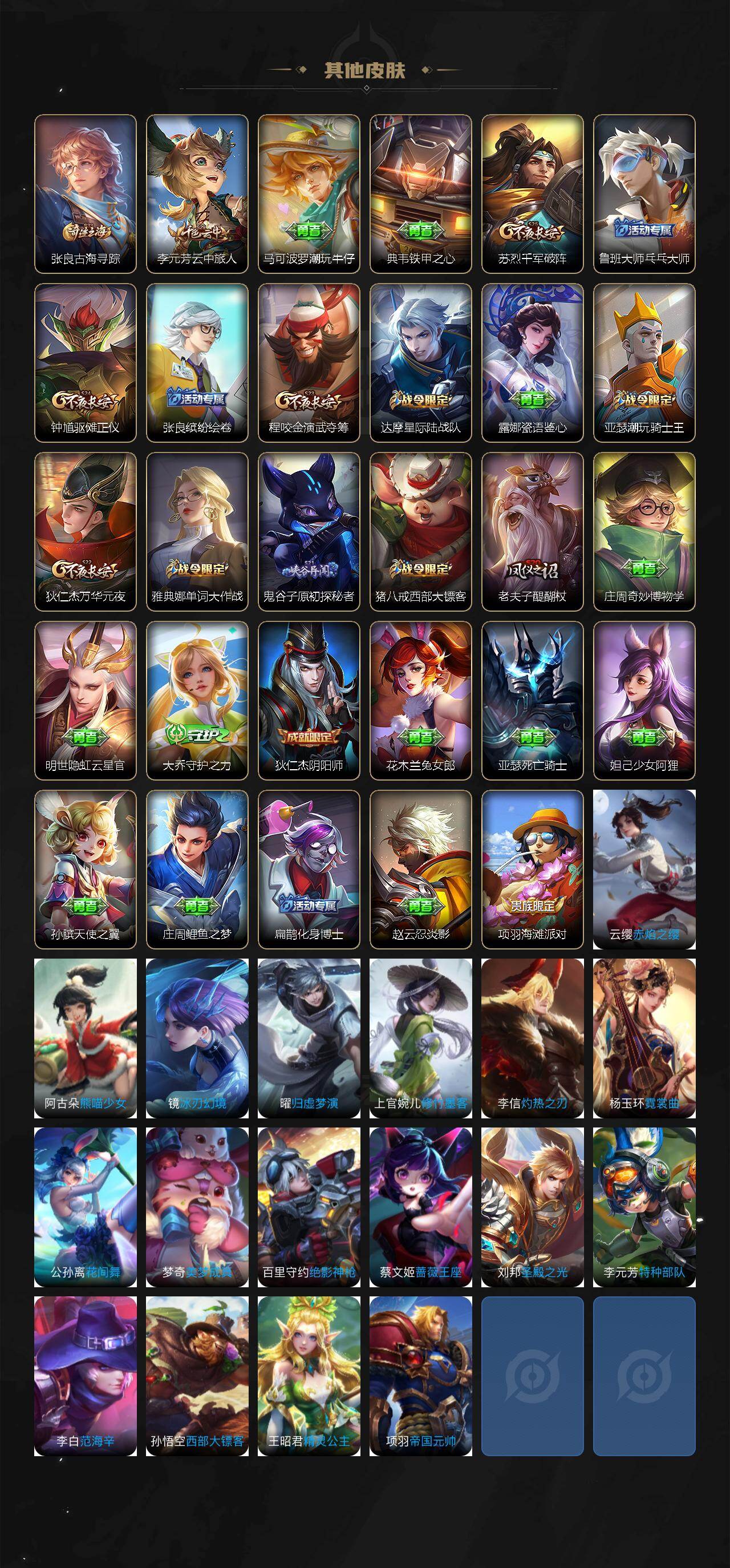 【其他皮肤】:张良古海寻踪,李元芳云中旅人,马可波罗潮玩牛仔,典韦铁甲之心,苏烈千军破阵,鲁班大师乓乓大师,钟馗驱傩正仪,张良缤纷绘卷,程咬金演武夺筹,达摩星际陆战队,露娜瓷语鉴心,亚瑟潮玩骑士王,狄仁杰万华元夜,雅典娜单词大作战,鬼谷子原初探秘者,猪八戒西部大镖客,老夫子醍醐杖,庄周奇妙博物学,明世隐虹云星官,大乔守护之力,狄仁杰阴阳师,花木兰兔女郎,亚瑟死亡骑士,妲己少女阿狸,孙膑天使之翼,庄周鲤鱼之梦,扁鹊化身博士,赵云忍炎影,项羽海滩派对,云缨赤焰之缨,阿古朵熊喵少女,镜冰刃幻境,曜归虚梦演,上官婉儿修竹墨客,李信灼热之刃,杨玉环霓裳曲,公孙离花间舞,梦奇