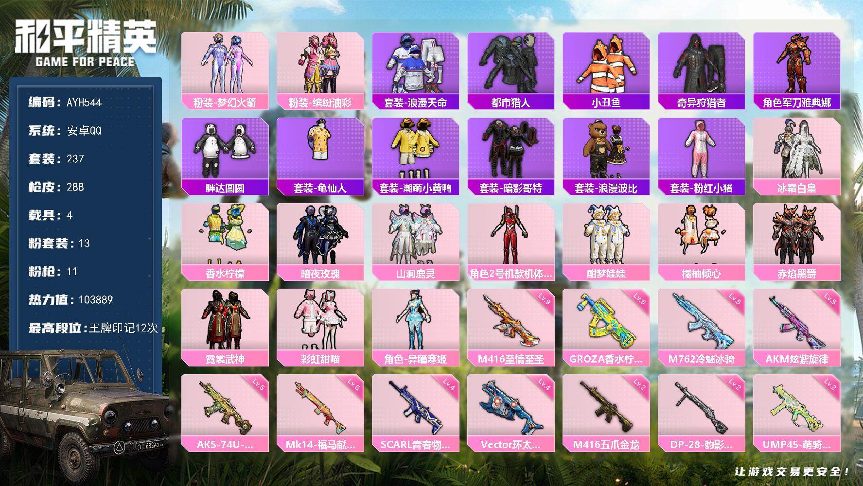 [17792259]安卓 手Q-13粉装-11特效枪-4载具-2粉色飞行器-103889热力值-12王牌印记-237套装-288枪皮