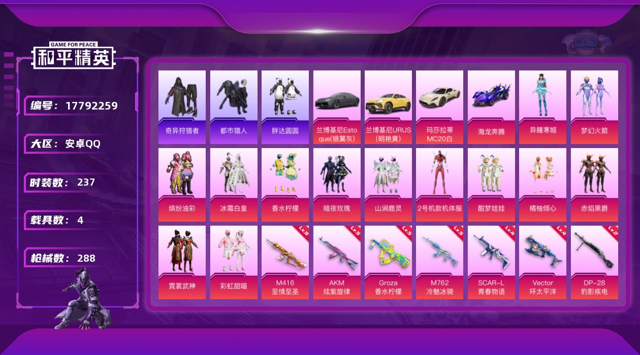 [17792259]安卓 手Q-13粉装-11特效枪-4载具-2粉色飞行器-103889热力值-12王牌印记-237套装-288枪皮 【热门品类】:粉装-梦幻火箭,粉装-缤纷油彩,套装-浪漫天命,套装-都市猎人,套装-小丑鱼,套装-奇异狩猎者,角色-军刀雅典娜,套装-胖达圆圆,套装-龟仙人,套装-潮萌小黄鸭,套装-暗影哥特,套装-浪漫波比,套装-粉红小猪 【粉色套装】:粉装-梦幻火箭,粉装-缤纷油彩,粉装-冰霜白皇,粉装-香水柠檬,粉装-暗夜玫瑰,粉装-山涧鹿灵,角色-2号机款机体服,粉装-酣梦娃娃,粉装-橘柚倾心,粉装-赤焰黑爵,粉装-霓裳武神,粉装-彩虹甜喵,角色-异瞳寒姬 【粉色枪皮等级】:AKM-炫紫旋律(五级),SCAR-L-青春物语(四级),M416-五爪金龙(二级),M416-至情至圣(九级),GROZA-香水柠檬(五级),M762-冷魅冰骑(五级),UMP45-萌骑冒险(二级),Vector-环太平洋(四级),AKS-74U-森灵之息(五级),Mk14-福马献瑞(五级),DP-28-豹影疾电(二级) 【粉色载具】:兰博基尼Estoque(银翼灰),兰博基尼URUS(明艳黄),玛莎拉蒂MC20(星石白),海龙奔腾 【粉色枪皮】:AKM-炫紫旋律,SCAR-L-青春物语,M416-五爪金龙,M416-至情至圣,GROZA-香水柠檬,M762-冷魅冰骑,UMP45-萌骑冒险,Vector-环太平洋,AKS-74U-森灵之息,Mk14-福马献瑞,DP-28-豹影疾电 【粉色飞行器】:炫彩糖果飞行器,梦幻火箭飞行器 【粉色降落伞】:极限特训降落伞,幻影战神降落伞,梦幻火箭降落伞,古堡领主降落伞,伏魔团降落伞,四圣焕新降落伞,香水柠檬降落伞,机甲封神降落伞,洛神天依降落伞,海渊国主降落伞,蓝莓炮弹降落伞,碧影闪光降落伞,百合蜜语降落伞,甜梦小狐降落伞,妙趣可丽降落伞,环太平洋降落伞,垂柳戏鸭降落伞,太空嘟嘟降落伞,旋转彩虹降落伞,圣堂之誓降落伞,异瞳寒姬降落伞,极意拳锋降落伞,炫彩糖果降落伞 【稀有套装】:套装-龟仙人,套装-雪国风尚,套装-炫彩糖果,套装-马上来财,套装-蓝海鲸歌,角色-紫俏灵猫,套装-画境星梦,套装-琴音绮想,套装-雨过天青,套装-红釉青花 【稀有枪皮】:AUG-冰晶雪宝,AKM-彩虹符号,AKM-影袭,AKM-海渊国主,AKM-灼热熔岩,AKM-玉龙,AKM