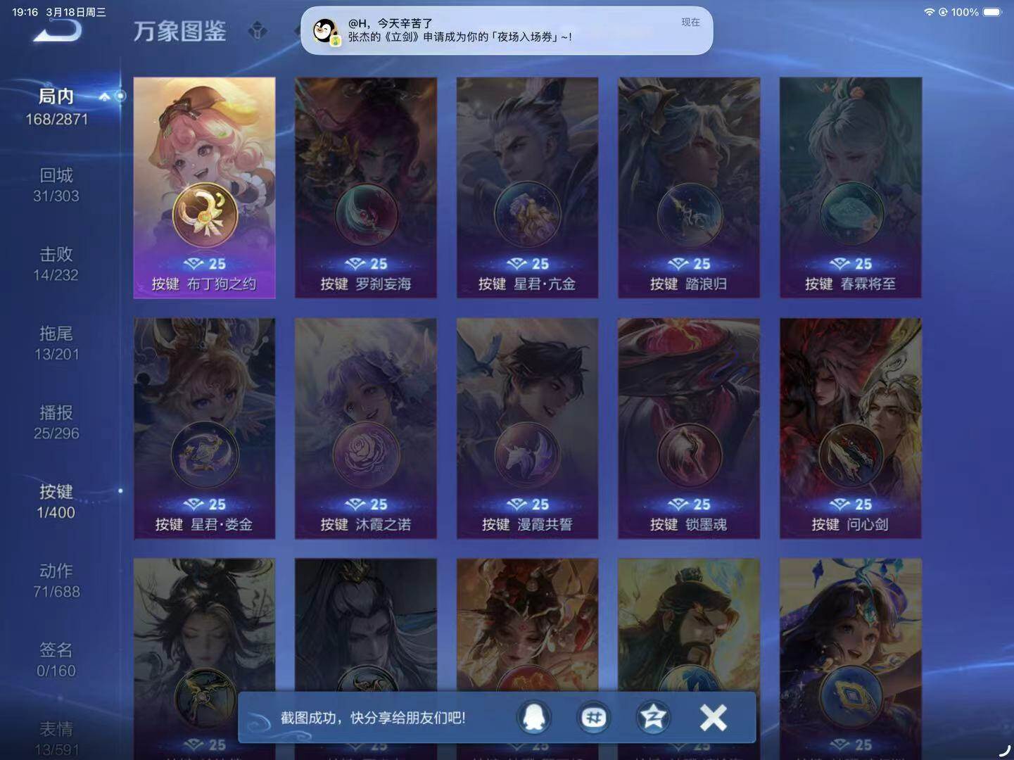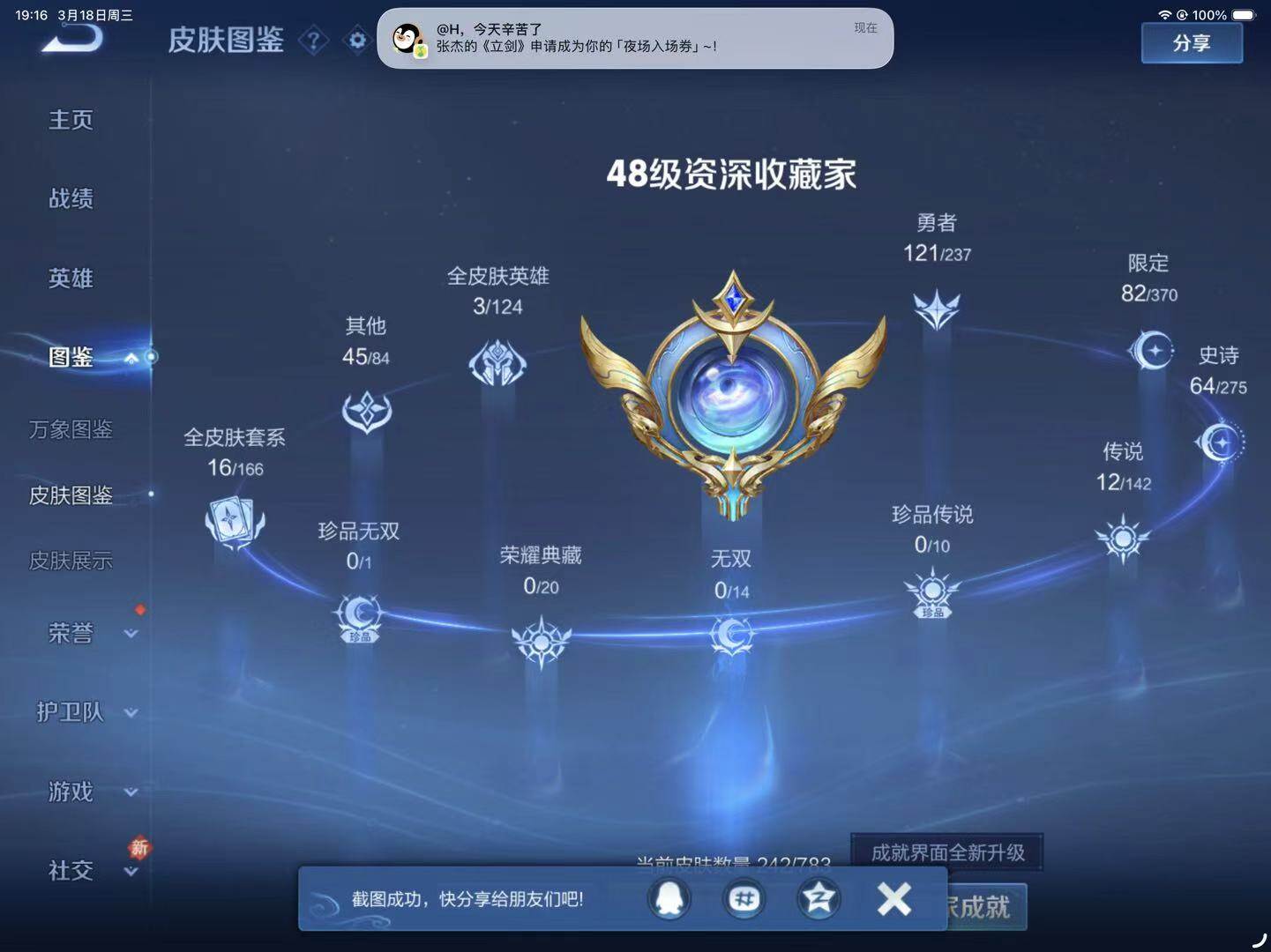 - PX_2088919- 包人脸 V6 贵族积分18909 安卓QQ/86皮肤/91英雄/0典藏/0珍品无双/1无双/1珍品传说/11传说/21史诗/5稀有英雄 【1 珍品传说】,时之奇旅 孙策, 【1 无双皮肤】,器灵·螭龙剑 曜, 【11 传说皮肤】,黄金射手座 后羿,久胜战神 干将莫邪,战鼓燎原 典韦,愿照·九州拓 澜,愿照·众生和 妲己,愿照·福禄聚 蔡文姬,幻光神枪 云缨,愿照·山河定 司