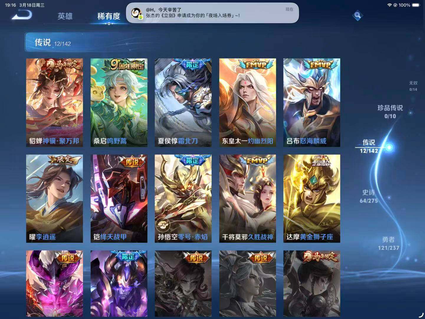 【传说皮肤】:貂蝉神骥聚万邦,桑启鸣野蒿,夏侯惇霜北刀,东皇太一灼幽烈阳,吕布怒海麟威,曜李逍遥 ,铠绛天战甲,孙悟空零号赤焰,干将莫邪久胜战神,达摩黄金狮子座,宫本武藏地狱之眼,吕布天魔缭乱