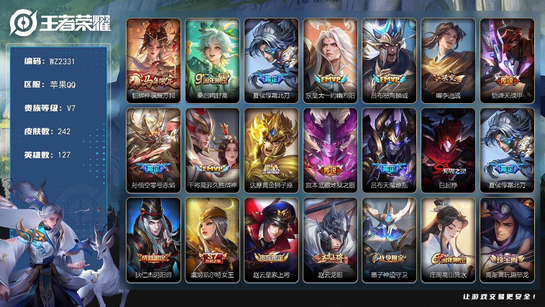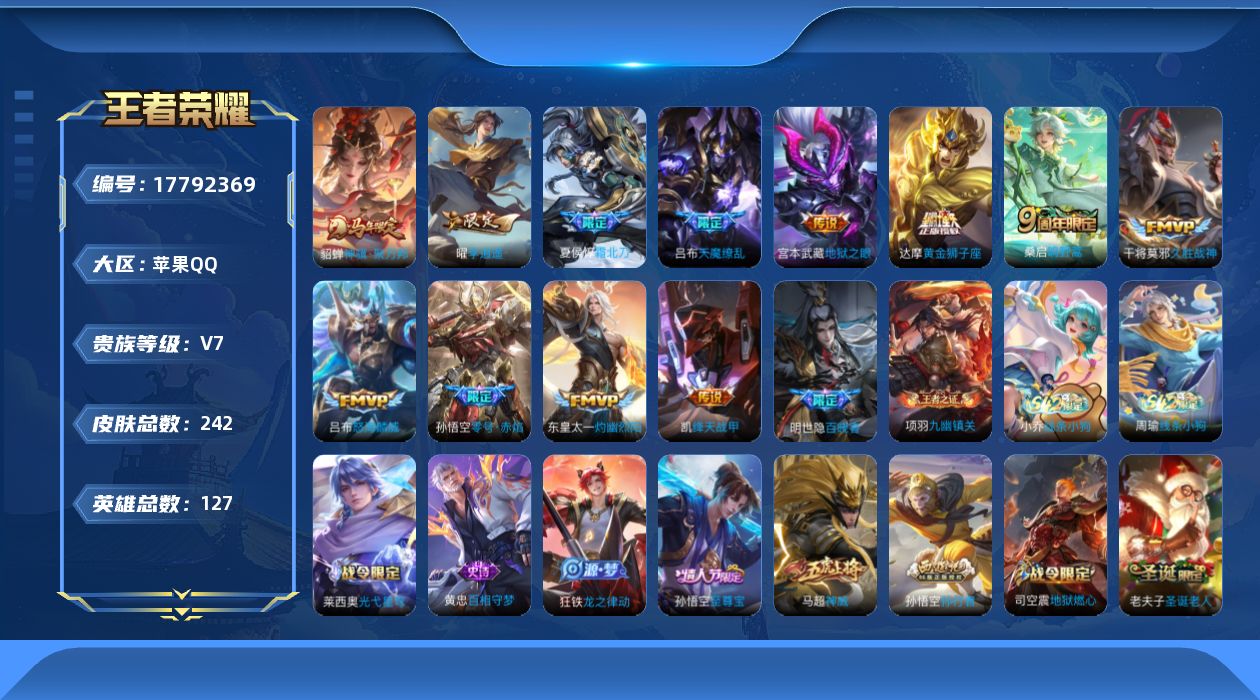 [17792369]苹果Q-V7-242皮肤-12传说-63史诗 【英雄全皮】:孙权全皮,敖隐全皮,蒙恬全皮 【传说皮肤】:貂蝉神骥聚万邦,桑启鸣野蒿,夏侯惇霜北刀,东皇太一灼幽烈阳,吕布怒海麟威,曜李逍遥 ,铠绛天战甲,孙悟空零号赤焰,干将莫邪久胜战神,达摩黄金狮子座,宫本武藏地狱之眼,吕布天魔缭乱 【限定皮肤】:白起狰,夏侯惇霜北刀,狄仁杰阴阳师,虞姬凯尔特女王,赵云皇家上将,赵云龙胆,墨子神迹守卫,庄周高山流水,高渐离玩趣恶龙,孙膑妖精王,扁鹊炼金王,芈月重明,吕布天魔缭乱,吕布御风骁将,周瑜赤莲之焰,元歌无心,夏侯惇朔风刀,典韦穷奇,狄仁杰魔术师,狄仁杰万华元夜,达摩沙漠行僧,项羽海滩派对,老夫子圣诞老人,老夫子醍醐杖,老夫子航海奇遇记,程咬金演武夺筹,韩信傲雪梅枪,王昭君凤凰于飞,兰陵王驯魔猎人,兰陵王金庭之子,孙悟空至尊宝,孙悟空大圣娶亲,孙悟空零号赤焰,孙悟空孙行者,牛魔御旌,李元芳云中旅人,钟馗驱傩正仪,雅典娜黎明之约,鬼谷子原初探秘者,鬼谷子五谷丰年,苏烈千军破阵,百里玄策原初追逐者,弈星混沌棋,梦奇顽趣,沈梦溪大漠名商,明世隐疑决卦,裴擒虎擒涛扼浪,狂铁御狮,米莱狄御霄,云中君纤云弄巧,盾山御銮,猪八戒猪悟能,曜李逍遥 ,鲁班大师探海日志,桑启海盐诗旅,司空震地狱燃心,张良古海寻踪,蒙恬荣光圣徽,鬼谷子天穹祈灯,姬小满妄想食味,刘邦剑破天穹,程咬金群星魔术团,周瑜熔金海岸 【年限皮肤】:王昭君凤凰于飞,吕布御风骁将 【赛季限定】:孙膑妖精王,扁鹊炼金王,虞姬凯尔特女王,白起狰,芈月重明,典韦穷奇,狂铁御狮,米莱狄御霄,牛魔御旌,盾山御銮,夏侯惇朔风刀,弈星混沌棋,明世隐疑决卦,老夫子醍醐杖,鬼谷子原初探秘者,狄仁杰万华元夜,程咬金演武夺筹,钟馗驱傩正仪,苏烈千军破阵,达摩沙漠行僧,兰陵王金庭之子,沈梦溪大漠名商,李元芳云中旅人,桑启海盐诗旅,裴擒虎擒涛扼浪,鲁班大师探海日志,张良古海寻踪,鬼谷子天穹祈灯,刘邦剑破天穹,东皇太一噬灭天穹,甄姬逆浪荇歌,亚瑟荣光之誓,百里玄策原初追逐者,雅典娜黎明之约,梦奇顽趣,蒙恬荣光圣徽,牛魔星界战将,项羽九幽镇关 【战令限定】:兰陵王驯魔猎人,周瑜赤莲之焰,老夫子航海奇遇记,墨子神迹守卫,司空震地狱燃心,莱西奥光弋星穹,明世隐往忆晖光,周瑜线条小狗,小乔线条小狗 【史诗皮肤】:明世隐百晓客,周瑜线条小狗,小乔线条小狗,项羽九幽镇