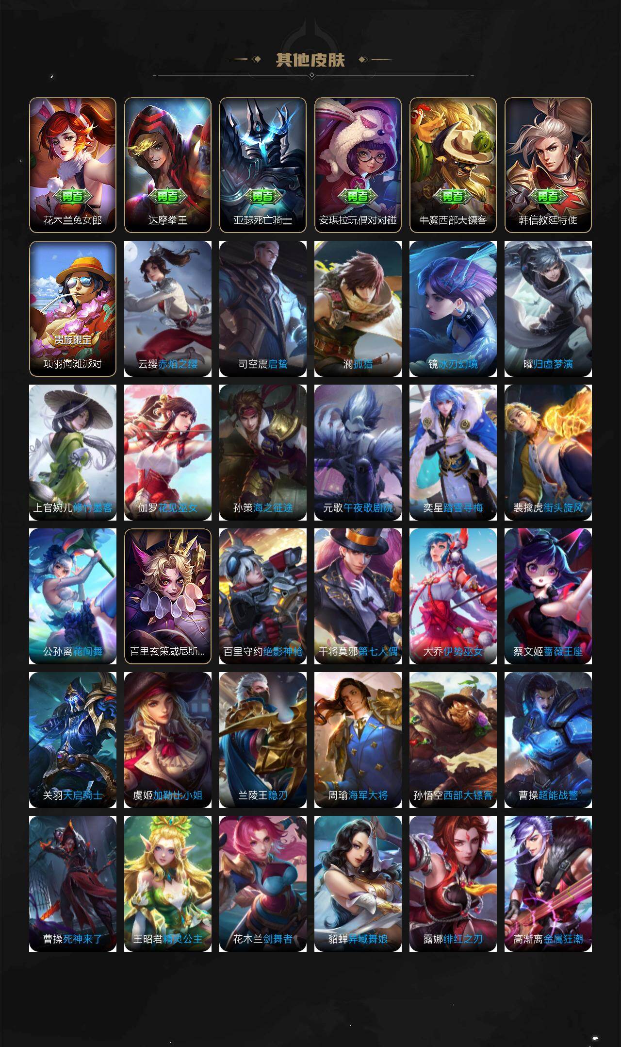 【其他皮肤】:艾琳鹤鸣心笺,鬼谷子天穹祈灯,张良古海寻踪,鲁班大师探海日志,裴擒虎擒涛扼浪,桑启海盐诗旅,李元芳云中旅人,蒙恬蔚蓝守将,沈梦溪大漠名商,兰陵王金庭之子,达摩沙漠行僧,苏烈千军破阵,鲁班大师乓乓大师,钟馗驱傩正仪,老夫子醍醐杖,明世隐疑决卦,弈星混沌棋,姜子牙炽热元素使,吕布野性能量,诸葛亮掌控之力,狂铁命运角斗场,关羽龙腾万里,狄仁杰阴阳师,后羿阿尔法小队,花木兰兔女郎,达摩拳王,亚瑟死亡骑士,安琪拉玩偶对对碰,牛魔西部大镖客,韩信教廷特使,项羽海滩派对,云缨赤焰之缨,司空震启蛰,澜孤猎,镜冰刃幻境,曜归虚梦演,上官婉儿修竹墨客,伽罗花见巫女,孙策海之征途,元歌午夜歌剧院,弈星踏雪寻梅,裴擒虎街头旋风,公孙离花间舞,百里玄策威尼斯狂欢,百里守约绝影神枪,干将莫邪第七人偶,大乔伊势巫女,蔡文姬蔷薇王座,关羽天启骑士,虞姬加勒比小姐,兰陵王隐刃,周瑜海军大将,孙悟空西部大镖客,曹操超能战警,曹操死神来了,王昭君精灵公主,花木兰剑舞者,貂蝉异域舞娘,露娜绯红之刃,高渐离金属狂潮