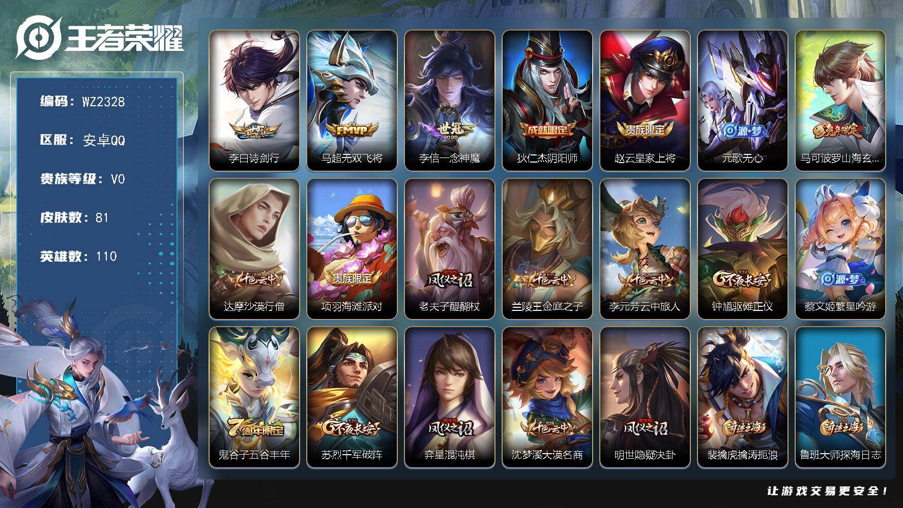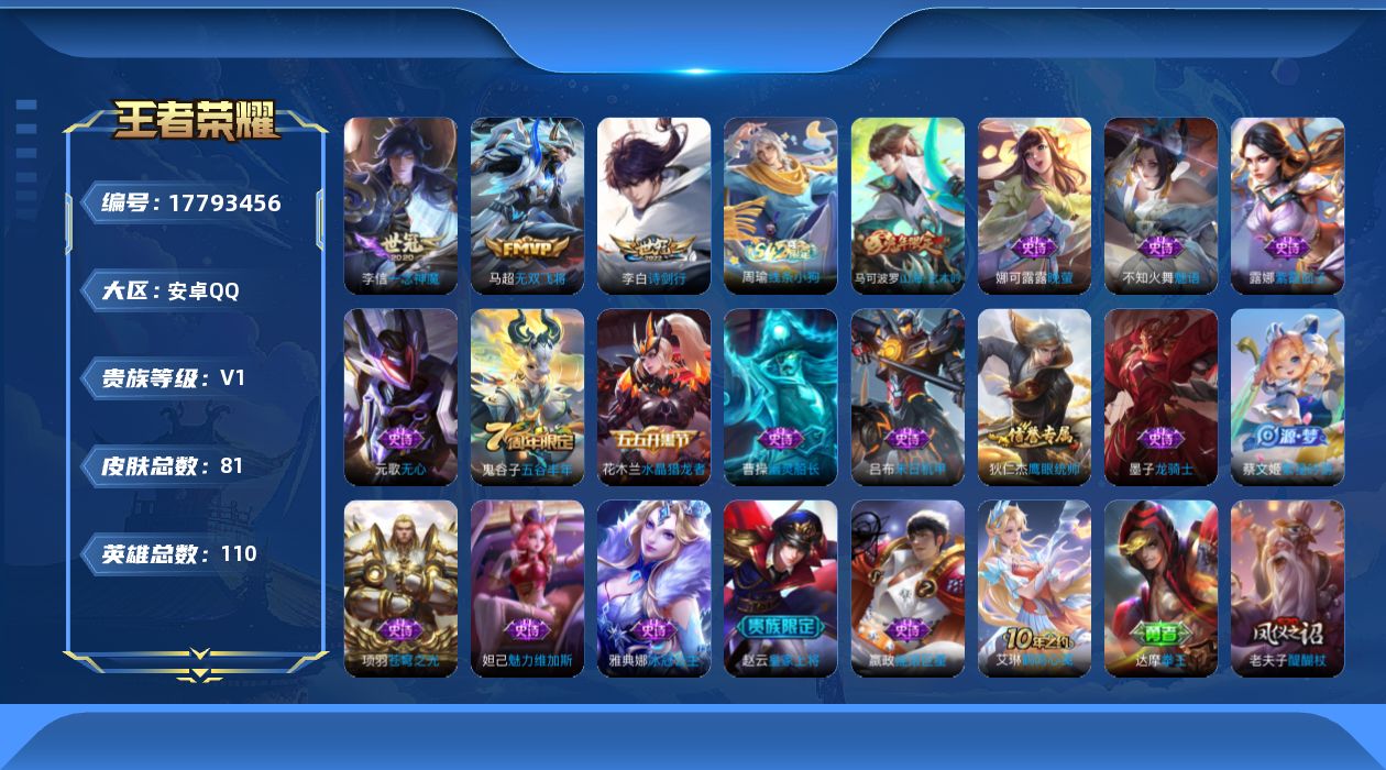 - [15612812]【店主推荐捡漏号!可直接换绑】安卓Q-V8-至尊星耀III段位-127英雄-372皮肤-2典藏皮肤-32传说-101史诗-2星元 【英雄全皮】:鬼谷子全皮,蒙恬全皮,戈娅全皮,空空儿全皮,影全皮 【荣耀典藏】:李白鸣剑曳影,诸葛亮星域神启 【传说皮肤】:曹操万灵伏威,司空震愿照山河定,澜愿照九州拓,云缨幻光神枪,裴擒虎祥瑞亨通,桑启鸣野蒿,墨子黄金天蝎座,亚连落雪白狼,典韦战鼓燎原,澜逐花归海,干将莫邪画中仙,虞姬无限倾心,李白诗剑行,马超无双飞将,女娲补天,裴擒虎寅虎赤拳,鲁班七号寅虎瑞焰,孙尚香异界灵契,曜李逍遥 ,周瑜音你心动,诸葛亮时雨天司,铠绛天战甲,镜炽阳神光,虞姬启明星使,关羽武圣,曜云鹰飞将,李信一念神魔,貂蝉猫影幻舞,后羿黄金射手座,诸葛亮武陵仙君,宫本武藏地狱之眼,狄仁杰超时空战士 【限定皮肤】:大乔绒语心约,姜子牙天穹之誓,杨戬破阵退雄兵,李白谪仙醉月,狄仁杰阴阳师,赵云皇家上将,赵云引擎之心,墨子神迹守卫,孙尚香异界灵契,鲁班七号乒乒小将,鲁班七号寅虎瑞焰,庄周高山流水,扁鹊奇幻香踪,白起夜都怪侠,芈月幻夜卜梦,元歌云间偶戏,元歌无心,夏侯惇朔风刀,甄姬游园惊梦,马可波罗山海玄木吟,狄仁杰魔术师,狄仁杰万华元夜,达摩沙漠行僧,项羽海滩派对,老夫子醍醐杖,老夫子航海奇遇记,关羽武圣,程咬金演武夺筹,韩信飞衡,韩信傲雪梅枪,王昭君午后时光,兰陵王金庭之子,花木兰青春决赛季,孙悟空至尊宝,孙悟空孙行者,后羿如梦令,后羿圣弓游侠,李元芳云中旅人,虞姬启明星使,虞姬无限倾心,钟馗驱傩正仪,杨玉环遇见飞天,杨戬潮玩骑兵,女娲朔望之晖,女娲补天,干将莫邪真爱魔法,干将莫邪画中仙,雅典娜黎明之约,鬼谷子原初探秘者,鬼谷子五谷丰年,诸葛亮武陵仙君,诸葛亮时雨天司,黄忠火炮绅士,苏烈千军破阵,百里玄策原初追逐者,百里守约朱雀志,弈星混沌棋,梦奇顽趣,沈梦溪星空之诺,沈梦溪大漠名商,明世隐疑决卦,明世隐吟游魔法,裴擒虎李小龙,裴擒虎寅虎赤拳,裴擒虎擒涛扼浪,狂铁电玩高手,伽罗天狼溯光者,上官婉儿天狼绘梦者,嫦娥如梦令,嫦娥拒霜思,嫦娥暖冬兔眠,曜李逍遥 ,西施玲珑珍味,鲁班大师探海日志,镜匿光追影者,桑启海盐诗旅,暃星界游侠,戈娅驭风魔法,艾琳女武神,阿古朵江河有灵,张良古海寻踪,蒙恬荣光圣徽,高渐离燃音魔法,妲己灵卜魔法,鬼谷子天穹祈灯,姬小满妄想食味,亚连落