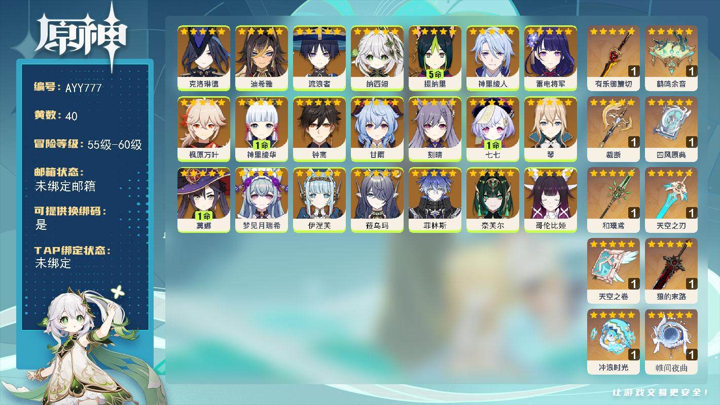 [17794106]59级/40黄/女主/21个五星角色/11个五星武器 0命克洛琳德,0命迪希雅,0命流浪者,0命纳西妲,5命提纳里,0命神里绫人,0命雷电将军,0命枫原万叶,1命神里绫华,0命钟离,0命甘雨,0命刻晴,1命七七,0命琴,1命莫娜,0命梦见月瑞希,0命伊涅芙,0命菈乌玛,0命菲林斯,0命奈芙尔,0命哥伦比娅,精1有乐御簾切,精1鹤鸣余音,精1裁断,精1四风原典,精1和璞鸢,精1天空之刃,精1天空之卷,精1狼的末路,精1冲浪时光,精1帷间夜曲