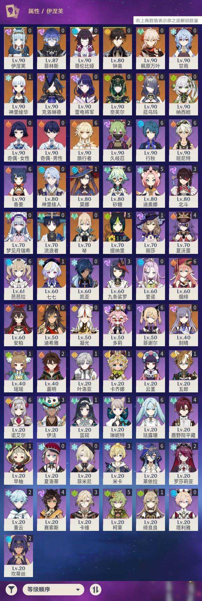 - [15404916]58级/36黄/女主/21个五星角色/8个五星武器 0命闲云,0命芙宁娜,0命纳西妲,1命提纳里,0命八重神子,1命申鹤,0命雷电将军,0命枫原万叶,0命神里绫华,0命钟离,0命宵宫,0命达达利亚,0命珊瑚宫心海,0命刻晴,1命七七,0命琴,3命莫娜,0命迪卢克,0命恰斯卡,0命梦见月瑞希,1命菲林斯,精1波乱月白经津,精1神乐之真意,精1息灾,精1不灭月华,精1四风原典,精1天空之翼,精1阿莫斯之弓