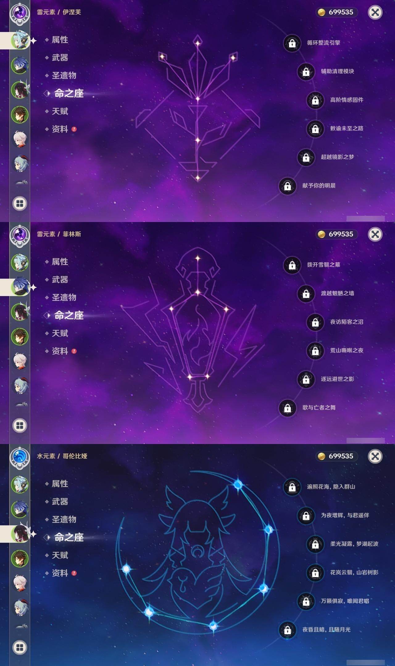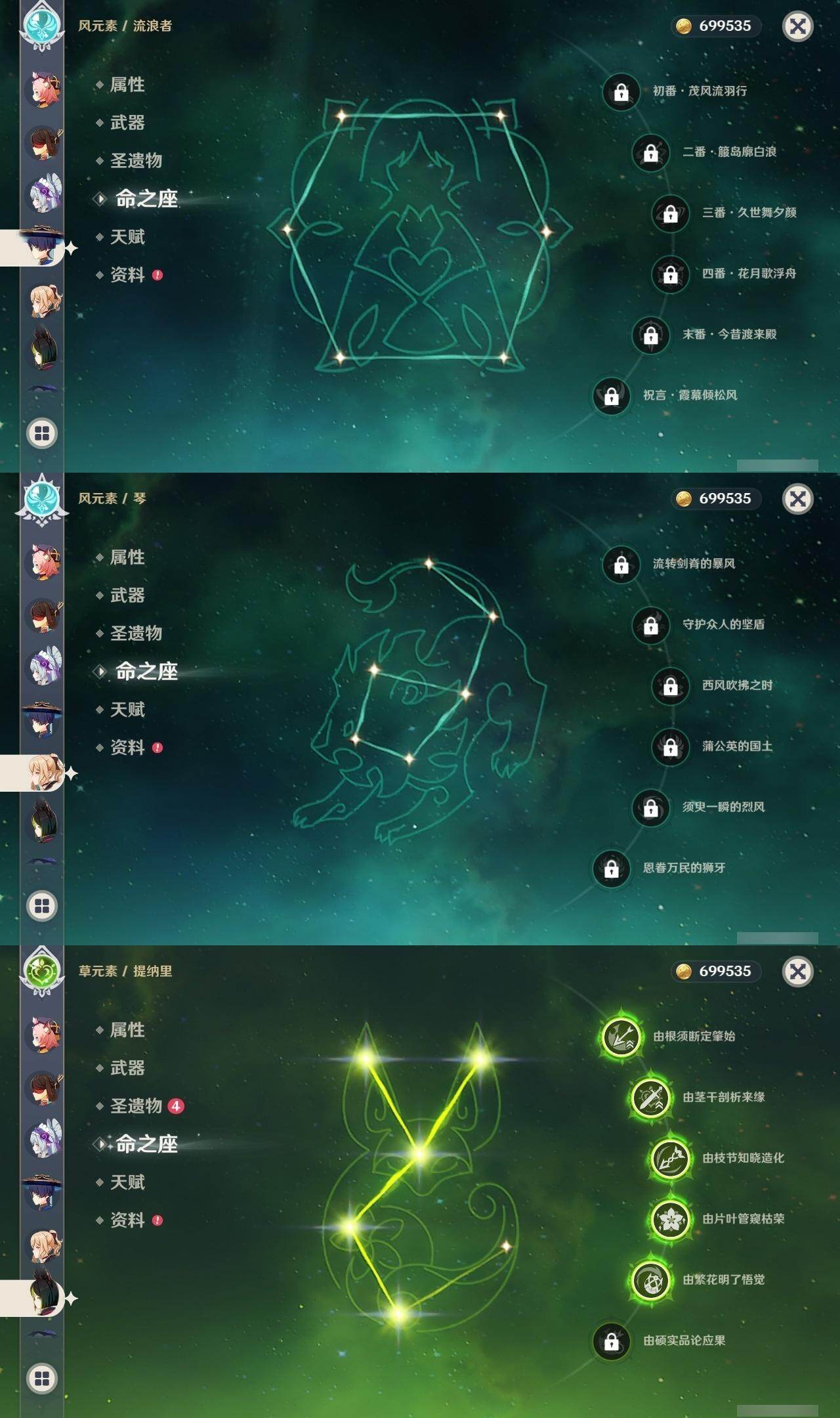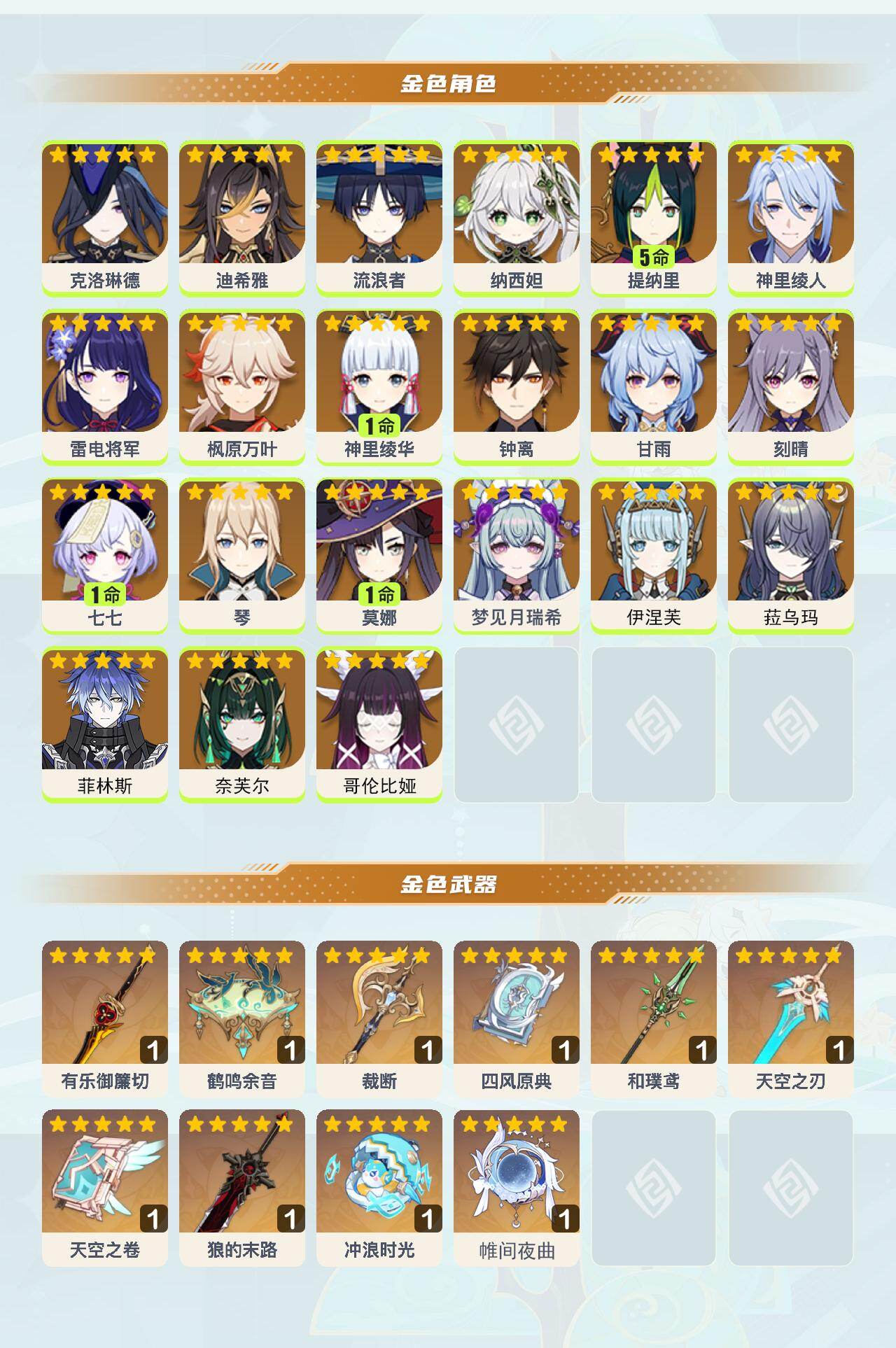0命克洛琳德,0命迪希雅,0命流浪者,0命纳西妲,5命提纳里,0命神里绫人,0命雷电将军,0命枫原万叶,1命神里绫华,0命钟离,0命甘雨,0命刻晴,1命七七,0命琴,1命莫娜,0命梦见月瑞希,0命伊涅芙,0命菈乌玛,0命菲林斯,0命奈芙尔,0命哥伦比娅,精1有乐御簾切,精1鹤鸣余音,精1裁断,精1四风原典,精1和璞鸢,精1天空之刃,精1天空之卷,精1狼的末路,精1冲浪时光,精1帷间夜曲