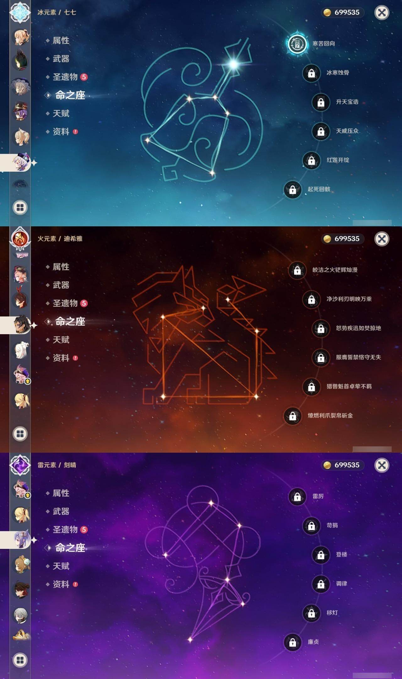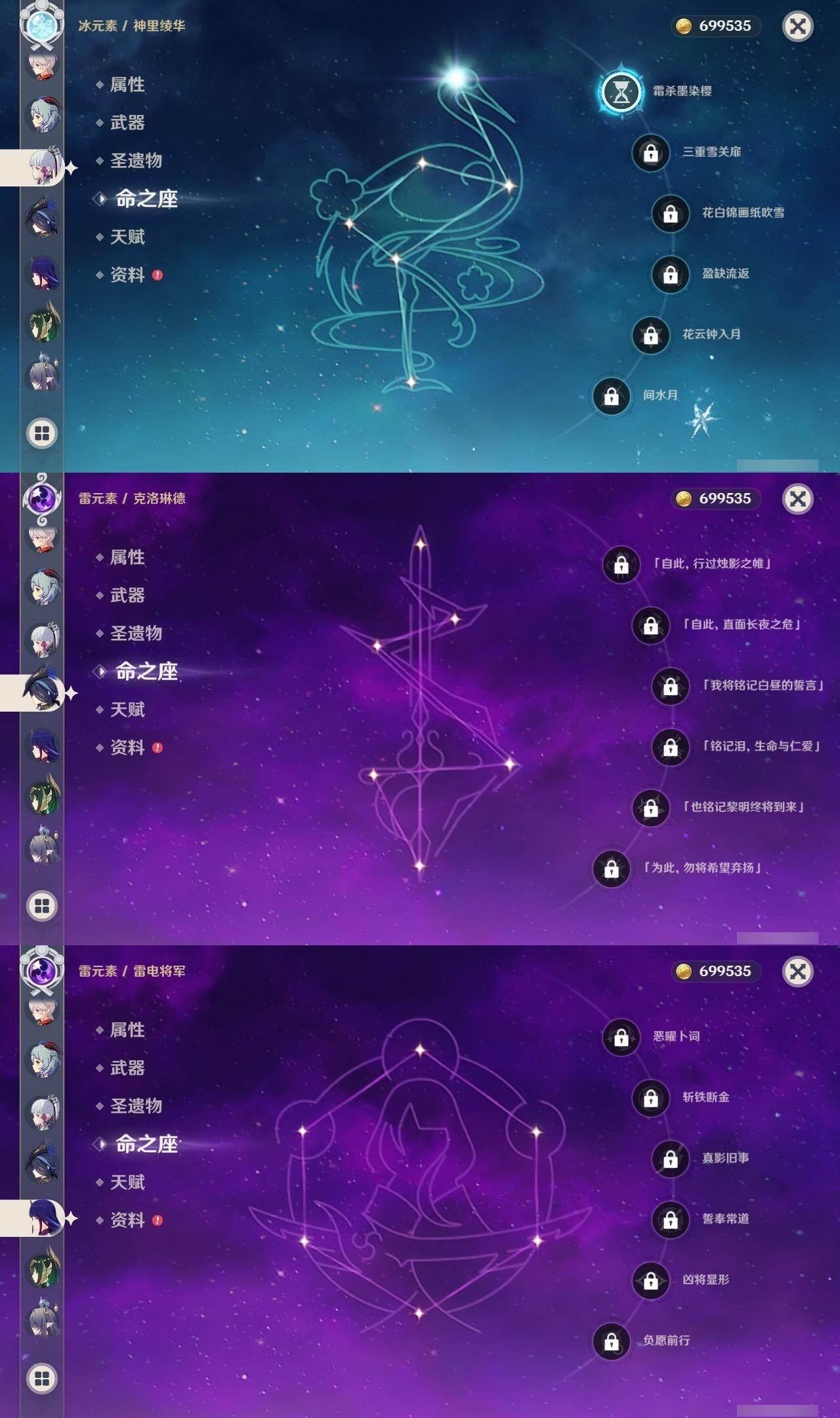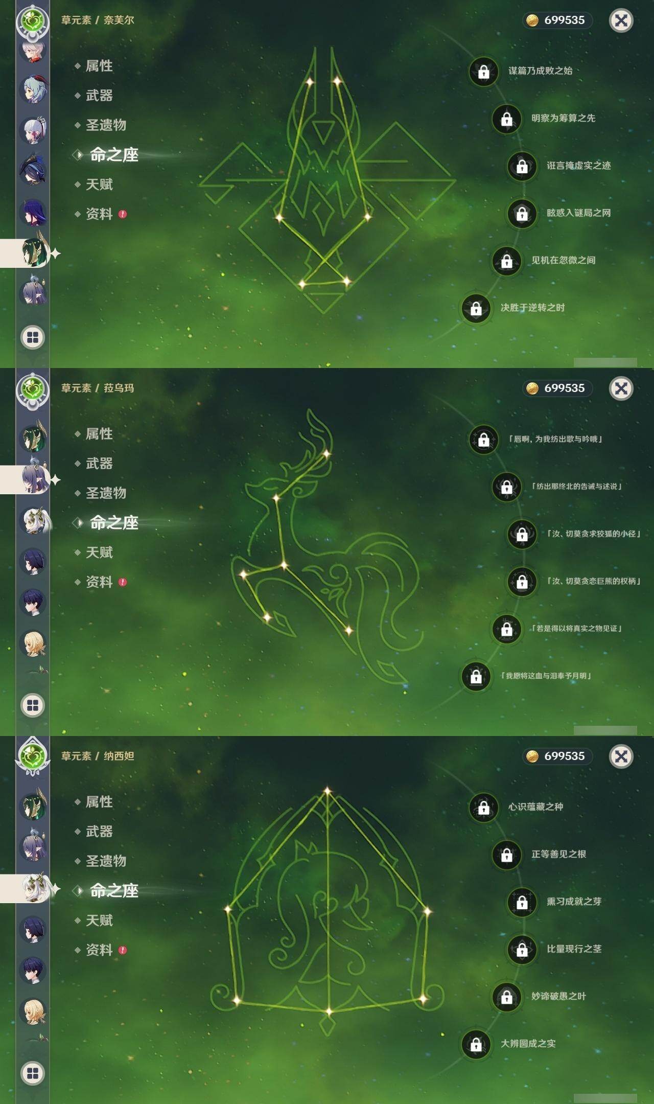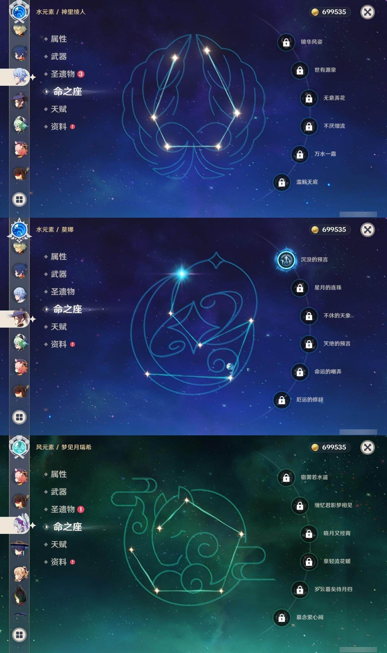 0命克洛琳德,0命迪希雅,0命流浪者,0命纳西妲,5命提纳里,0命神里绫人,0命雷电将军,0命枫原万叶,1命神里绫华,0命钟离,0命甘雨,0命刻晴,1命七七,0命琴,1命莫娜,0命梦见月瑞希,0命伊涅芙,0命菈乌玛,0命菲林斯,0命奈芙尔,0命哥伦比娅,精1有乐御簾切,精1鹤鸣余音,精1裁断,精1四风原典,精1和璞鸢,精1天空之刃,精1天空之卷,精1狼的末路,精1冲浪时光,精1帷间夜曲