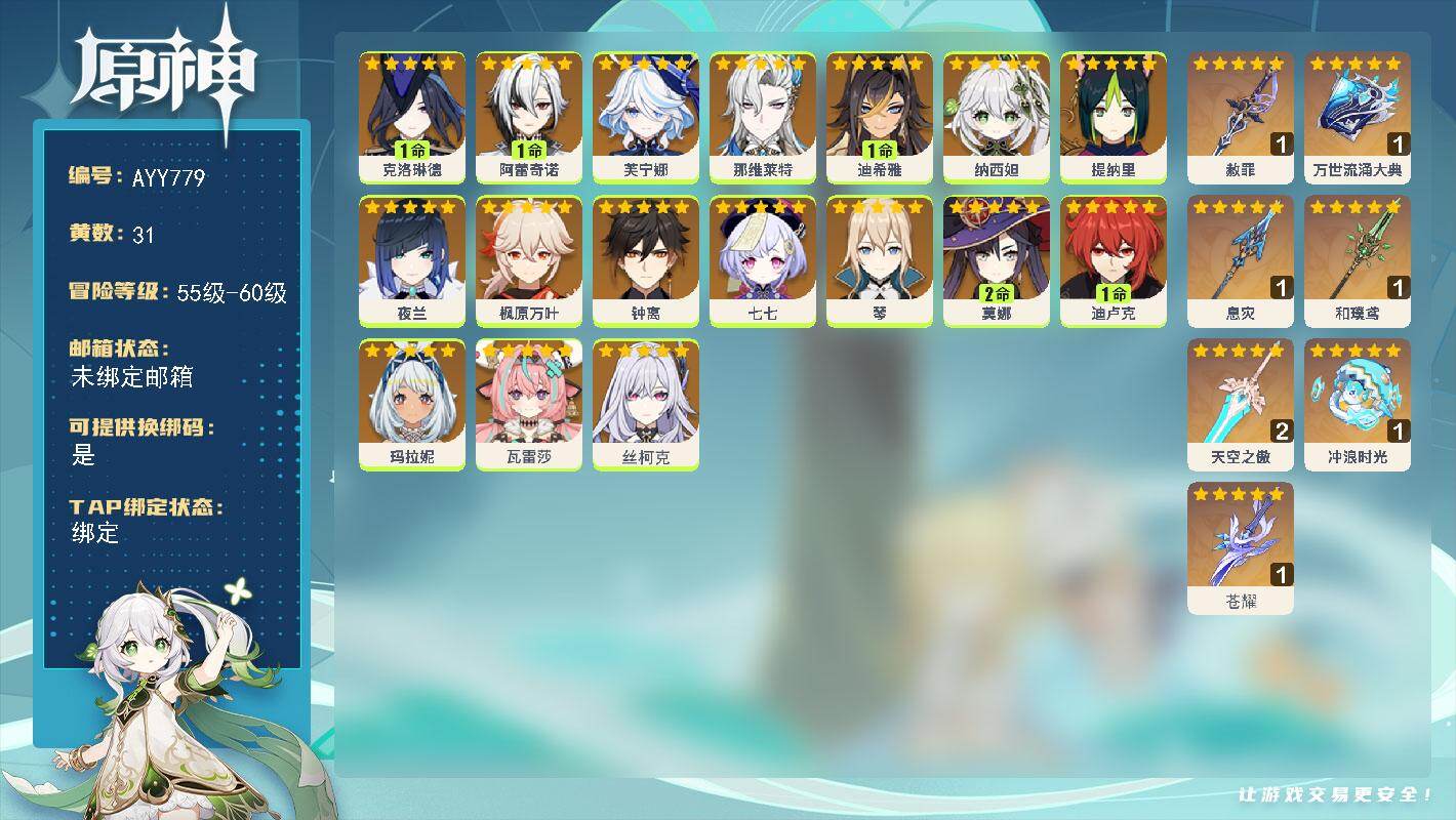 [17794457]59级/31黄/女主/17个五星角色/7个五星武器 1命克洛琳德,1命阿蕾奇诺,0命芙宁娜,0命那维莱特,1命迪希雅,0命纳西妲,0命提纳里,0命夜兰,0命枫原万叶,0命钟离,0命七七,0命琴,2命莫娜,1命迪卢克,0命玛拉妮,0命瓦雷莎,0命丝柯克,精1赦罪,精1万世流涌大典,精1息灾,精1和璞鸢,精2天空之傲,精1冲浪时光,精1苍耀