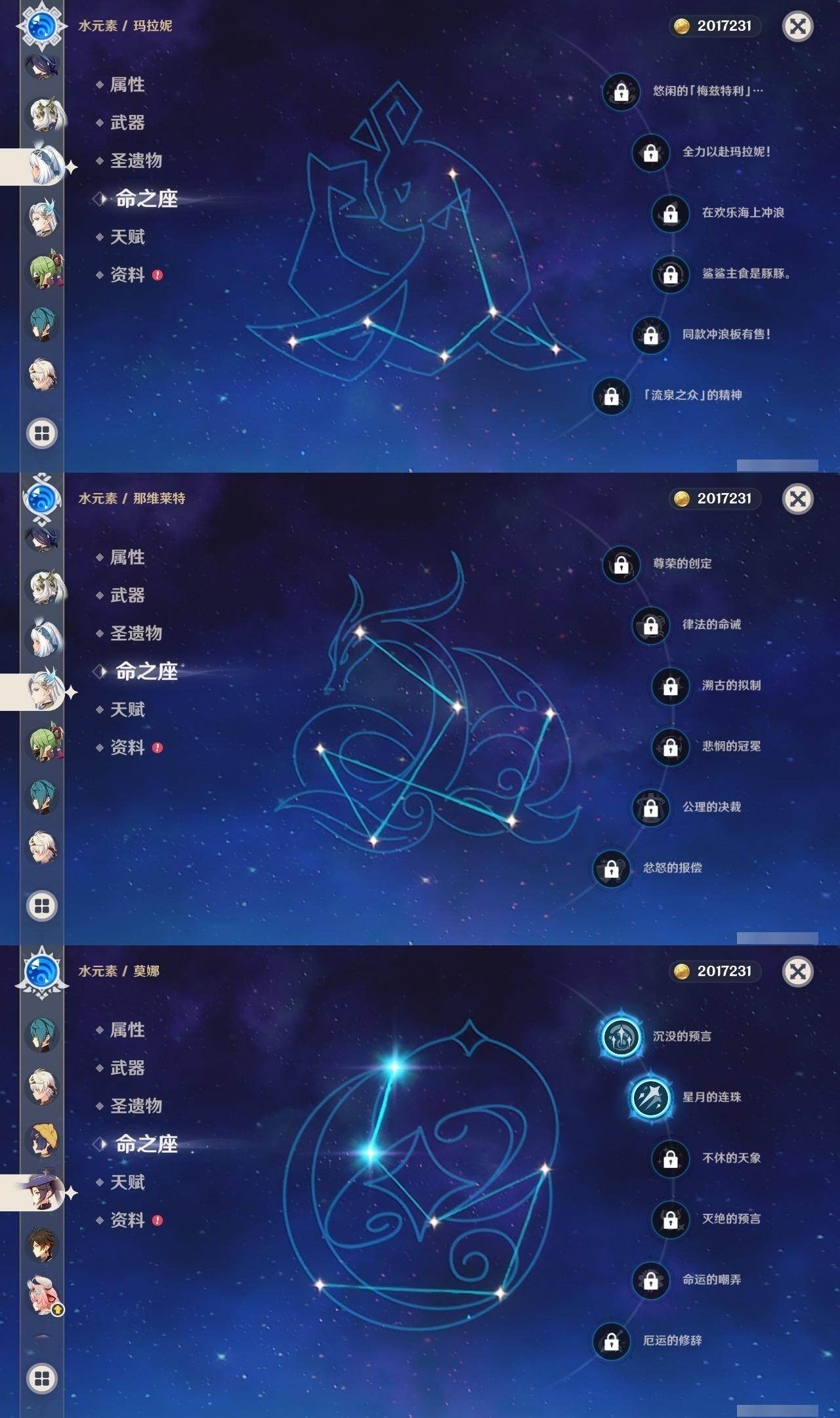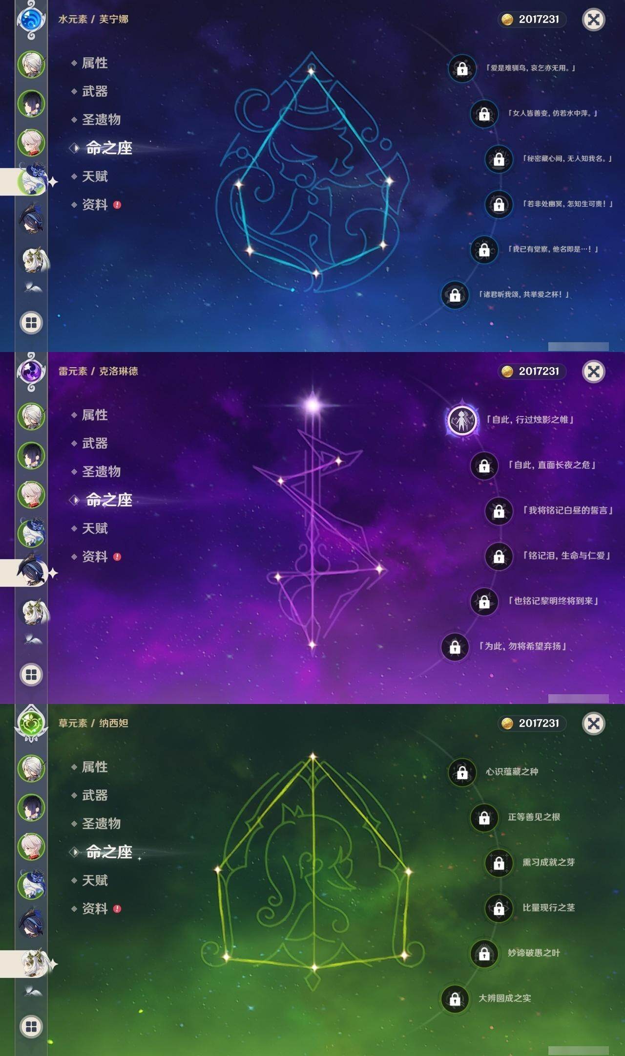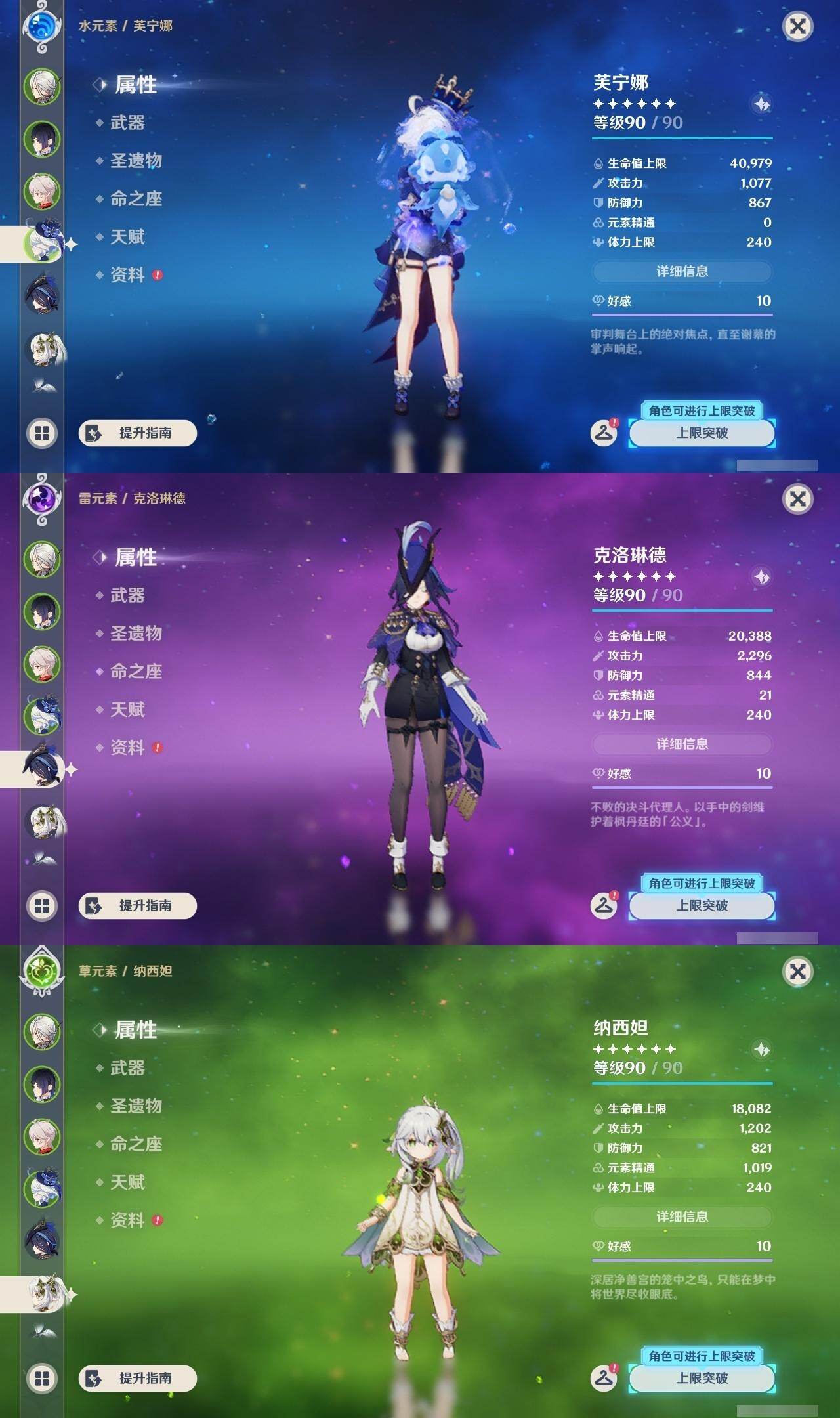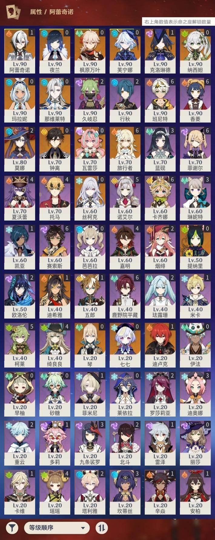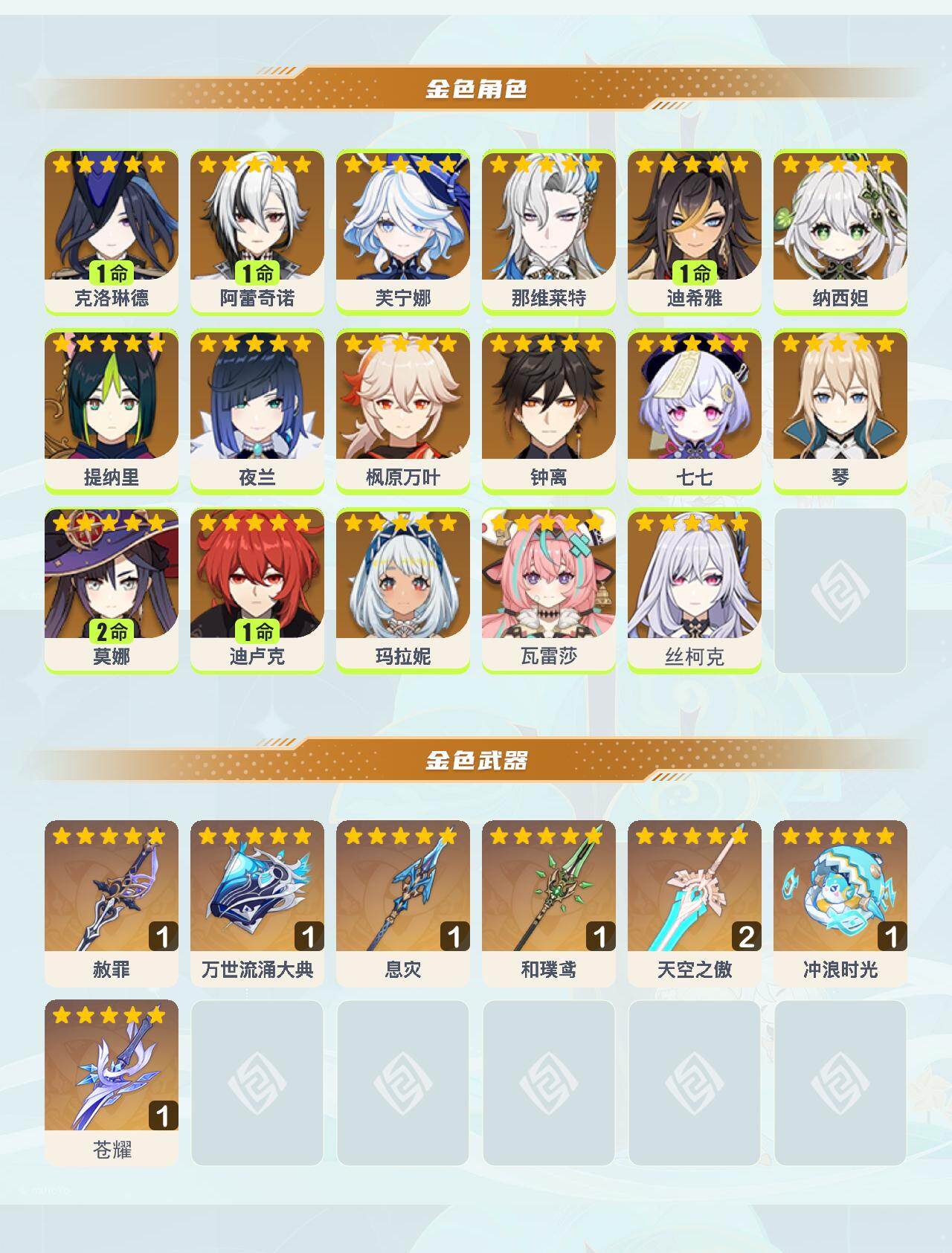 1命克洛琳德,1命阿蕾奇诺,0命芙宁娜,0命那维莱特,1命迪希雅,0命纳西妲,0命提纳里,0命夜兰,0命枫原万叶,0命钟离,0命七七,0命琴,2命莫娜,1命迪卢克,0命玛拉妮,0命瓦雷莎,0命丝柯克,精1赦罪,精1万世流涌大典,精1息灾,精1和璞鸢,精2天空之傲,精1冲浪时光,精1苍耀