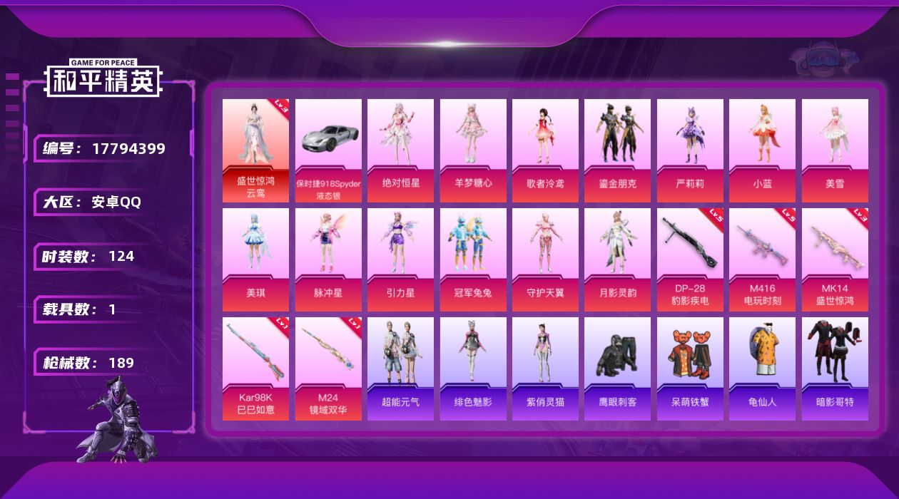 [17794399]安卓 手Q-1神装-13粉装-6特效枪-1载具-13粉色飞行器-63861热力值-9王牌印记-124套装-189枪皮