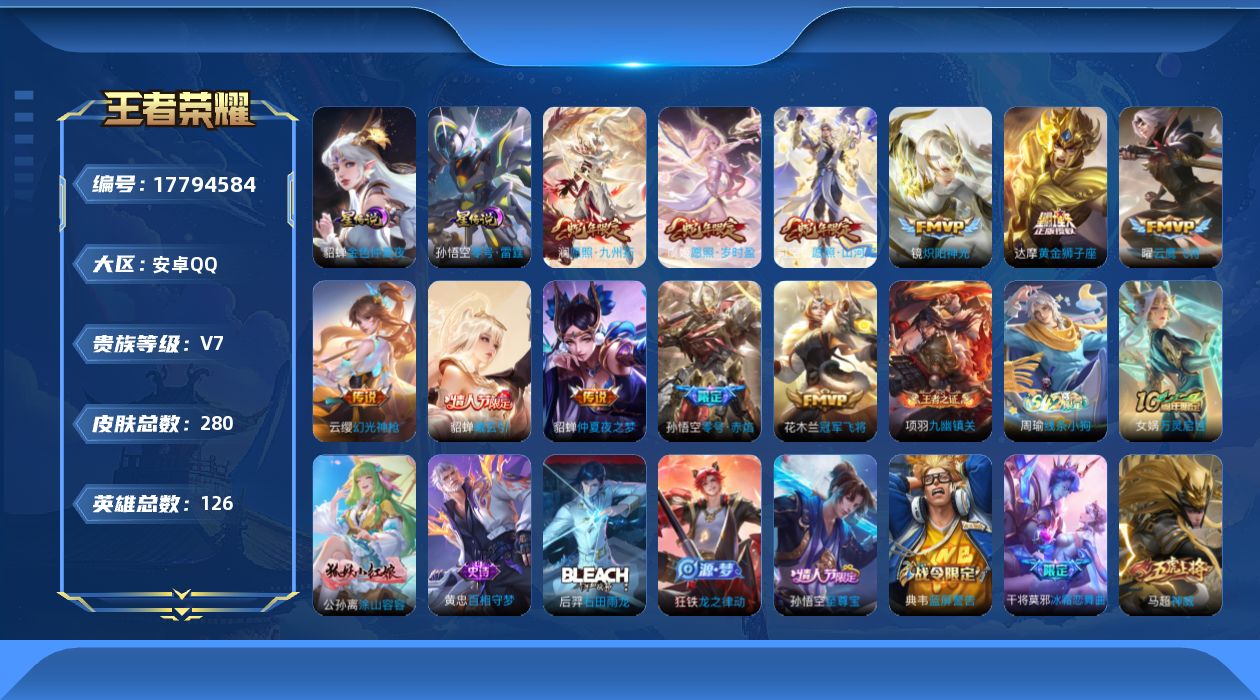 - [15748526]【特价出售/店主推荐】安卓Q-V7-至尊星耀IV段位-126英雄-213皮肤-1星传说-5传说-49史诗 【传说皮肤】:后羿神树通天,云缨幻光神枪,桑启鸣野蒿,诸葛亮武陵仙君,孙尚香末日机甲 【限定皮肤】:狄仁杰阴阳师,赵云皇家上将,赵云引擎之心,墨子神迹守卫,嬴政白昼王子,鲁班七号狮舞东方,庄周高山流水,高渐离玩趣恶龙,芈月重明,芈月幻夜卜梦,吕布猎兽之王,周瑜赤莲之焰,元歌无心,夏侯惇朔风刀,甄姬游园惊梦,曹操烛龙,典韦穷奇,典韦蓝屏警告,狄仁杰魔术师,狄仁杰万华元夜,达摩沙漠行僧,项羽海滩派对,老夫子醍醐杖,老夫子航海奇遇记,程咬金演武夺筹,兰陵王驯魔猎人,兰陵王金庭之子,花木兰瑞麟志,孙悟空至尊宝,牛魔御旌,后羿圣弓游侠,李元芳银河之约,李元芳云中旅人,钟馗神迹守卫,钟馗驱傩正仪,杨玉环遇见飞天,女娲朔望之晖,干将莫邪真爱魔法,太乙真人饕餮,鬼谷子原初探秘者,鬼谷子五谷丰年,诸葛亮武陵仙君,黄忠火炮绅士,苏烈千军破阵,百里玄策原初追逐者,弈星混沌棋,沈梦溪星空之诺,沈梦溪大漠名商,明世隐疑决卦,裴擒虎李小龙,裴擒虎擒涛扼浪,狂铁御狮,米莱狄御霄,盾山御銮,上官婉儿梁祝,嫦娥拒霜思,鲁班大师探海日志,桑启海盐诗旅,艾琳女武神,鬼谷子天穹祈灯 【年限皮肤】:花木兰瑞麟志 【赛季限定】:芈月重明,夏侯惇朔风刀,曹操烛龙,典韦穷奇,狄仁杰万华元夜,达摩沙漠行僧,老夫子醍醐杖,程咬金演武夺筹,兰陵王金庭之子,牛魔御旌,李元芳云中旅人,钟馗驱傩正仪,太乙真人饕餮,鬼谷子原初探秘者,苏烈千军破阵,百里玄策原初追逐者,弈星混沌棋,沈梦溪大漠名商,明世隐疑决卦,裴擒虎擒涛扼浪,狂铁御狮,米莱狄御霄,盾山御銮,鲁班大师探海日志,桑启海盐诗旅,鬼谷子天穹祈灯 【战令限定】:墨子神迹守卫,嬴政白昼王子,鲁班七号狮舞东方,芈月幻夜卜梦,吕布猎兽之王,周瑜赤莲之焰,典韦蓝屏警告,老夫子航海奇遇记,兰陵王驯魔猎人,后羿圣弓游侠,李元芳银河之约,钟馗神迹守卫,女娲朔望之晖,干将莫邪真爱魔法,黄忠火炮绅士,沈梦溪星空之诺 【史诗皮肤】:露娜紫霞仙子,赵云皇家上将,赵云未来纪元,貂蝉圣诞恋歌,甄姬冰雪圆舞曲,王昭君偶像歌手,狄仁杰魔术师,廉颇地狱岩魂,宫本武藏鬼剑武藏,孙尚香水果甜心,嬴政摇滚巨星,妲己魅力维加斯,妲己女仆咖啡,墨子金属风暴,曹操幽灵船长,李白千年之狐,吕布末日机甲,张飞乱世