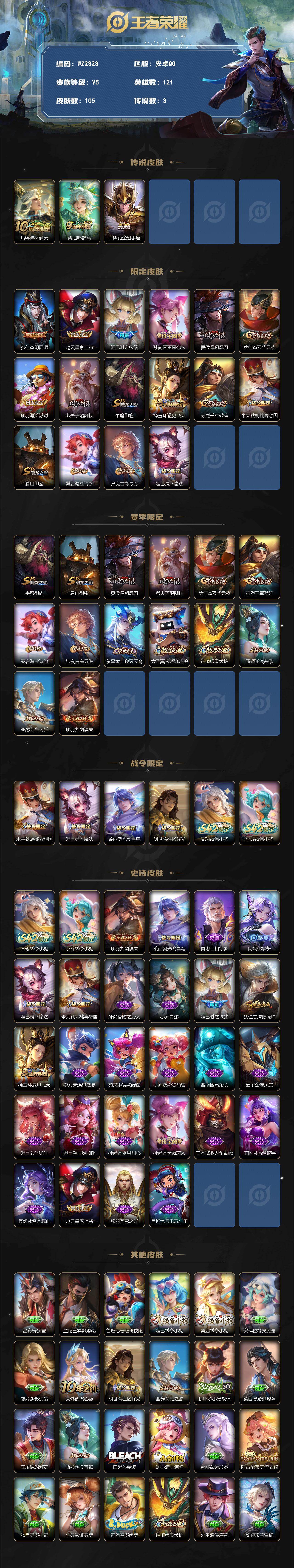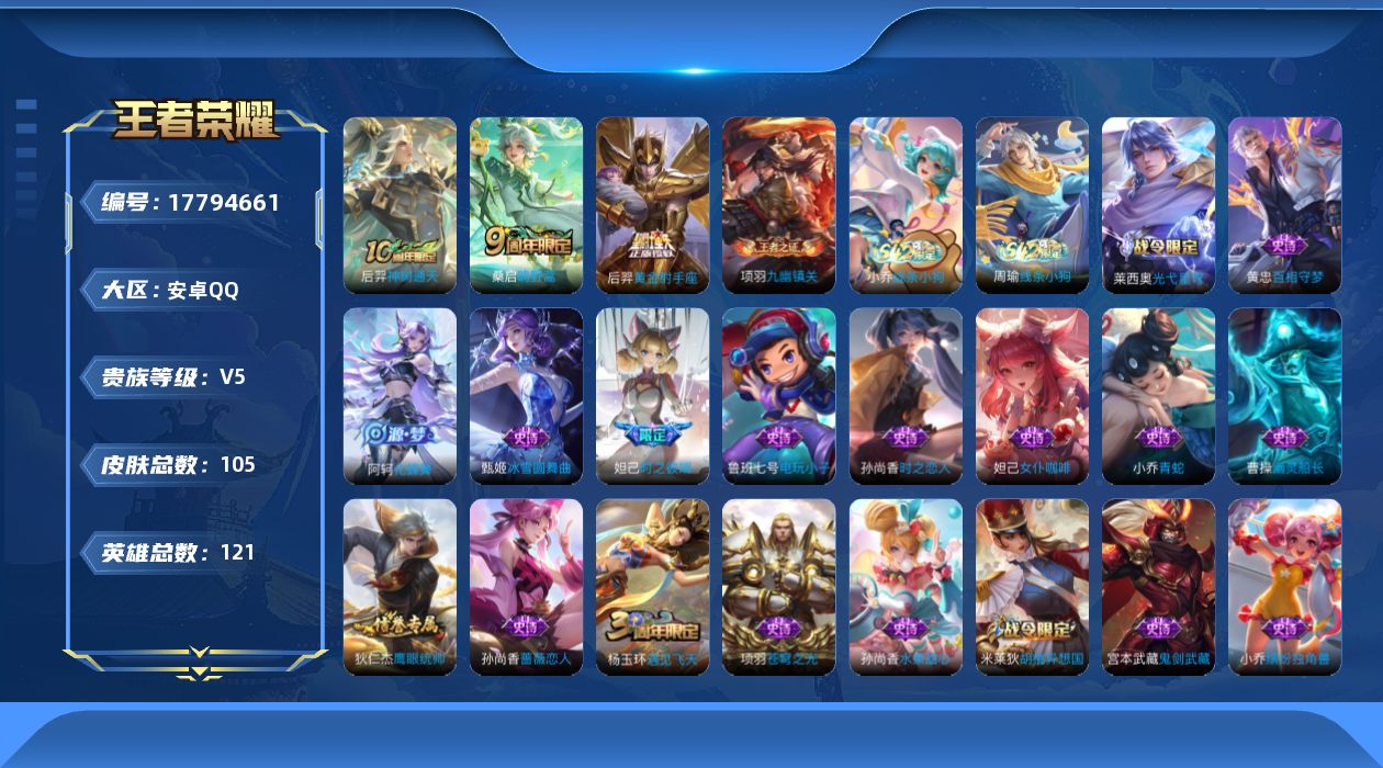 - PX_2060195-贵族等级: V8 英雄数: 123 皮肤数: 232 荣耀水晶: 星空梦想,杀手不太冷,大秦宣太后,鸣剑·曳影,全息碎影,星域神启 星传说: 金色仲夏夜 传说皮: 绛天战甲,仲夏夜之梦,音你心动-小乔,飞鸢探春,音你心动-周瑜,乞巧织情,游龙清影,淬星耀世,末日机甲-孙策,花朝如约 限定皮: 游园惊梦,梁祝,时雨天司,白鹤梁神女,异界灵契,白晶晶,天狼溯光者,乒乒小将,天狼狩