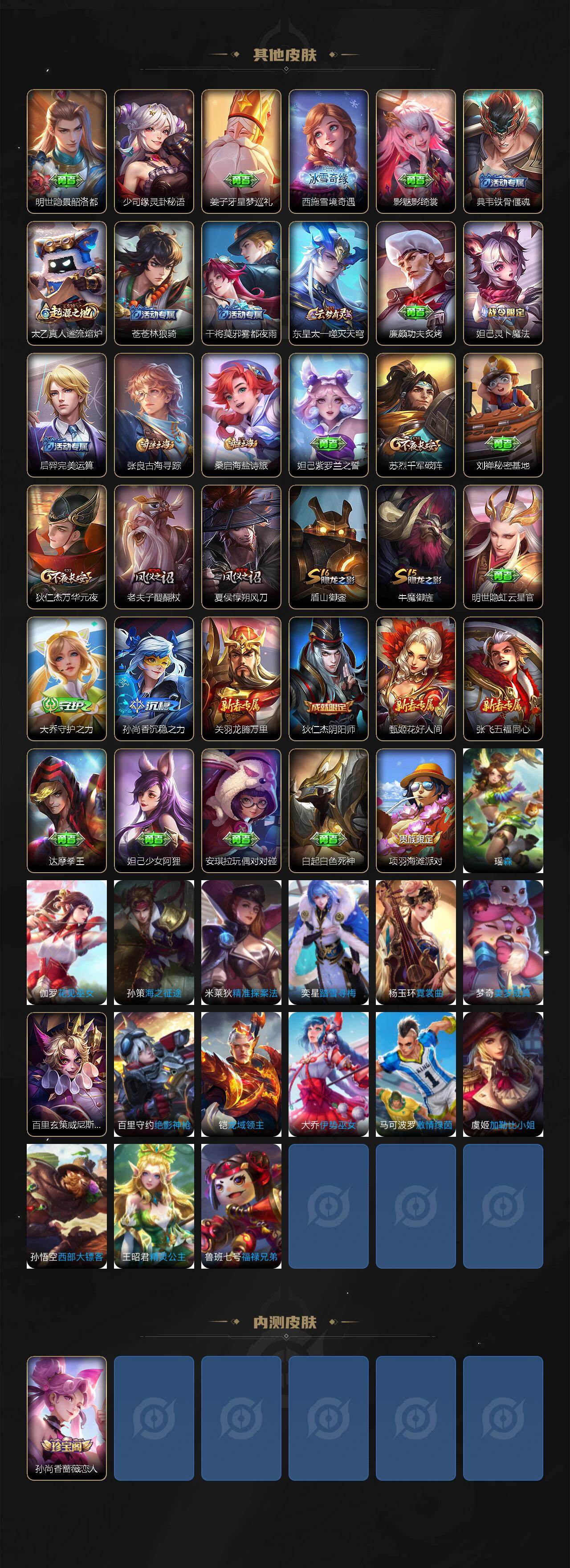 【其他皮肤】:吕布舞狮寰,兰陵王雾影缉谜,鲁班七号班班快跑,妲己线条小狗,桑启线条小狗,安琪拉糖果风暴,虞姬溯影追猎,艾琳鹤鸣心笺,明世隐往忆晖光,亚瑟荣光之誓,哪吒罗小黑战记,莱西奥踏浪烽翎,庄周锦麟游梦,甄姬逆浪荇歌,白起死霸装,姬小满小满鸭,露娜命运加冕,阿古朵布丁狗之约,张良灵野札记,小乔秘证寻踪,苏烈春野闲踪,钟馗虚灵犬护,刘备浪漫序章,戈娅玫蓝誓约,明世隐景韶洛都,少司缘灵卦秘语,姜子牙星梦巡礼,西施雪境奇遇,影魅影绮裳,典韦铁骨偃魂,太乙真人谧流熔炉,苍苍林狼骑,干将莫邪雾都夜雨,东皇太一噬灭天穹,廉颇功夫炙烤,妲己灵卜魔法,后羿完美运算,张良古海寻踪,桑启海盐诗旅,妲己紫罗兰之誓,苏烈千军破阵,刘禅秘密基地,狄仁杰万华元夜,老夫子醍醐杖,夏侯惇朔风刀,盾山御銮,牛魔御旌,明世隐虹云星官,大乔守护之力,孙尚香沉稳之力,关羽龙腾万里,狄仁杰阴阳师,甄姬花好人间,张飞五福同心,达摩拳王,妲己少女阿狸,安琪拉玩偶对对碰,白起白色死神,项羽海滩派对,瑶森,伽罗花见巫女,孙策海之征途,米莱狄精