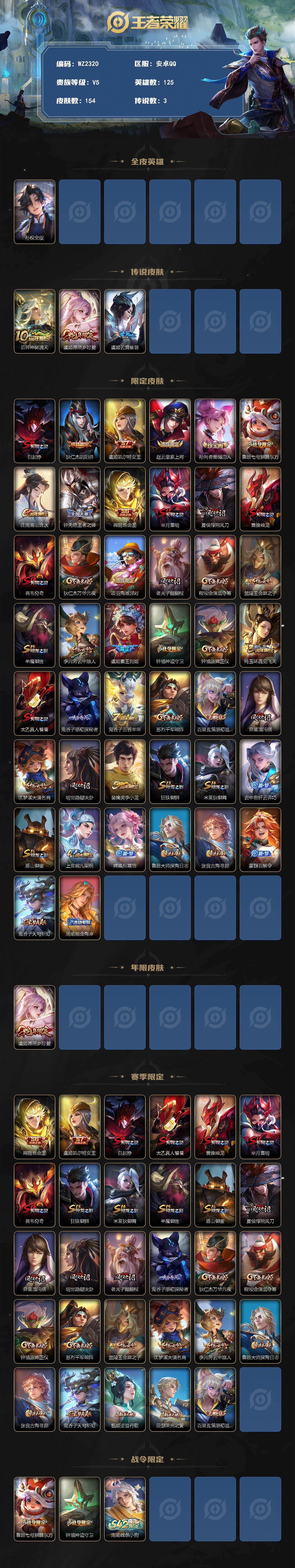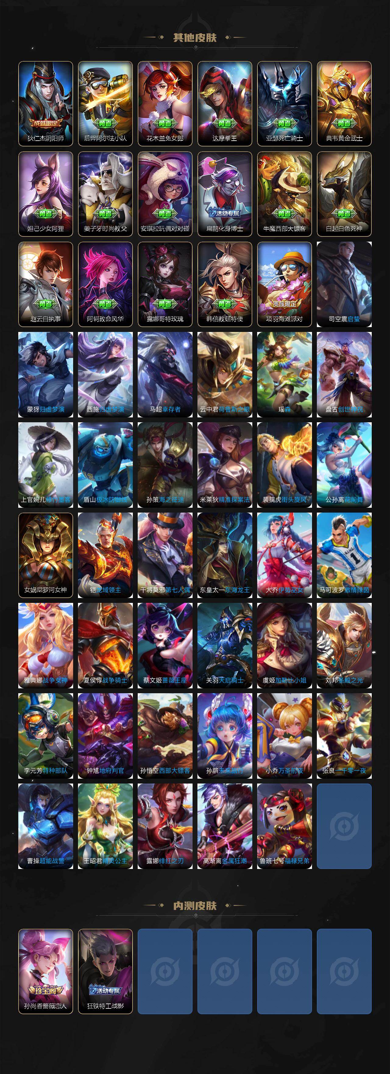 【限定皮肤】:白起狰,狄仁杰阴阳师,虞姬凯尔特女王,赵云皇家上将,孙尚香蔷薇恋人,鲁班七号狮舞东方,庄周高山流水,钟无艳王者之锤,扁鹊炼金王,芈月重明,夏侯惇朔风刀,曹操烛龙,典韦穷奇,狄仁杰万华元夜,项羽海滩派对,老夫子醍醐杖,程咬金演武夺筹,兰陵王金庭之子,牛魔御旌,李元芳云中旅人,虞姬霸王别姬,钟馗神迹守卫,钟馗驱傩正仪,杨玉环遇见飞天,太乙真人饕餮,鬼谷子原初探秘者,鬼谷子五谷丰年,苏烈千军破阵,百里玄策原初追逐者,弈星混沌棋,沈梦溪大漠名商,明世隐疑决卦,裴擒虎李小龙,狂铁御狮,米莱狄御霄,云中君纤云弄巧,盾山御銮,上官婉儿梁祝,嫦娥拒霜思,鲁班大师探海日志,张良古海寻踪,蒙犽百解令,鬼谷子天穹祈灯,周瑜熔金海岸