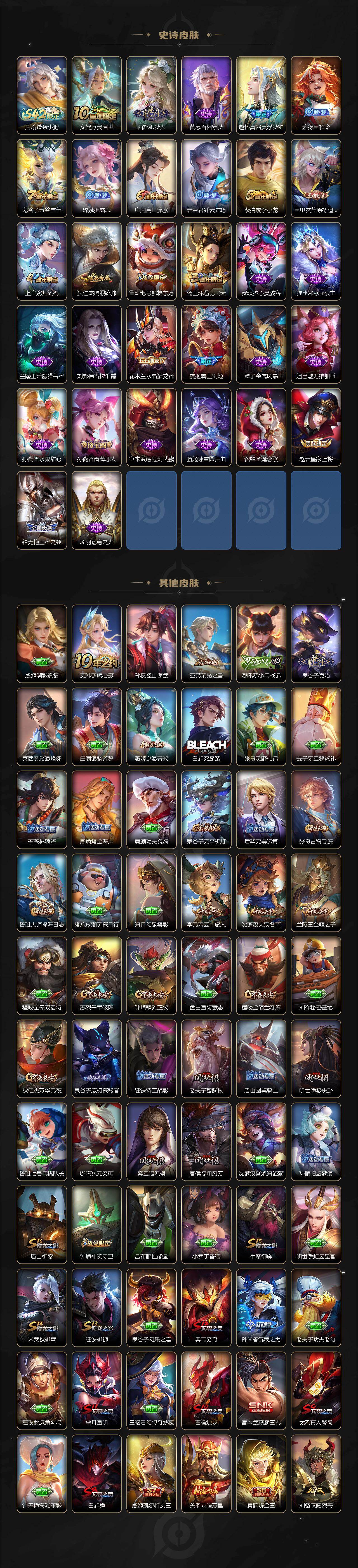 【史诗皮肤】:周瑜线条小狗,女娲万灵启世,西施织梦人,黄忠百相守梦,赵怀真器灵浮梦炉,蒙犽百解令,鬼谷子五谷丰年,嫦娥拒霜思,庄周高山流水,云中君纤云弄巧,裴擒虎李小龙,百里玄策原初追逐者,上官婉儿梁祝,狄仁杰鹰眼统帅,鲁班七号狮舞东方,杨玉环遇见飞天,安琪拉心灵骇客,雅典娜冰冠公主,兰陵王暗隐猎兽者,刘邦德古拉伯爵,花木兰水晶猎龙者,虞姬霸王别姬,墨子金属风暴,妲己魅力维加斯,孙尚香水果甜心,孙尚香蔷薇恋人,宫本武藏鬼剑武藏,甄姬冰雪圆舞曲,貂蝉圣诞恋歌,赵云皇家上将,钟无艳王者之锤,项羽苍穹之光