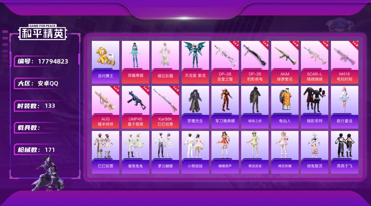 [17794823]安卓 手Q-3粉装-10特效枪-0载具-1粉色飞行器-49474热力值-16王牌印记-133套装-171枪皮 【热门品类】:套装-派对舞王,角色-军刀雅典娜,套装-暗夜之虎,套装-龟仙人,套装-暗影哥特 【粉色套装】:角色-烟云彩露,角色-天龙座 紫龙,角色-异瞳寒姬 【粉色枪皮等级】:AKM-绿萝繁花(五级),SCAR-L-锦绣绵绵(五级),M416-电玩时刻(五级),AUG-暖羊咩咩(五级),UMP45-量子极限(五级),Kar98K-巳巳如意(五级),DP-28-圣堂之誓(七级),DP-28-豹影疾电(五级) 【粉色枪皮】:AKM-绿萝繁花,SCAR-L-锦绣绵绵,M416-电玩时刻,AUG-暖羊咩咩,UMP45-量子极限,Kar98K-巳巳如意,Mk14-福马献瑞,DP-28-圣堂之誓,DP-28-豹影疾电 【粉色飞行器】:炫彩糖果飞行器 【粉色降落伞】:星之彼岸降落伞,环太平洋降落伞,圣堂之誓降落伞,星穹咏叹调降落伞,炫彩糖果降落伞 【稀有套装】:套装-龟仙人,套装-航行童话,套装-巳巳如意,套装-雪国风尚,套装-炫彩糖果,套装-雏菊兔兔,套装-萝兰蝴蝶,套装-小熊娃娃,套装-糖糖葫芦,套装-青团波波,套装-棉花软糖,角色-俏兔智灵,套装-燕燕于飞,套装-鱼渊荷华,套装-粉恋花,套装-紫幽梦,套装-蓝冰羽,套装-星渊小夜曲 【稀有枪皮】:AKM-彩虹符号,AKM-破晓战魂,AKM-缤纷海域,AKM-龙的传人,M16A4-幻世战舞者,SCAR-L-夜灯,SCAR-L-炫彩节奏,SCAR-L-玉兔迎春,M416-糯团青竹,M416-红色方程式,M416-绯红前夜,M416-蓝色火焰,AUG-天降萌叽,AUG-耀粉歌者,AUG-青春冒险家,AUG-月影灵韵,M762-天降萌叽,M762-彩虹符号,M762-绯红前夜,M762-幻影飞狐,G36C-星穹咏叹调,AC-VAL-天降萌叽,AC-VAL-快闪甜心,蜜獾-天降萌叽,蜜獾-娇憨猪猪,UZI-啾咪啾咪,UZI-天降萌叽,UZI-娇憨猪猪,UMP45-夜灯,UMP45-涂山之恋,UMP45-生命誓言,Vector-焰鹰斗篷,Vector-创世·救赎,汤姆逊-天降萌叽,汤姆逊-环太平洋,P90-快闪甜心,P90-巳巳如意,AWM-焰鹰斗篷,AWM-雷霆特警,SKS-炫彩节奏,SKS-迅猛狂鲨,VSS-彩虹符号,M