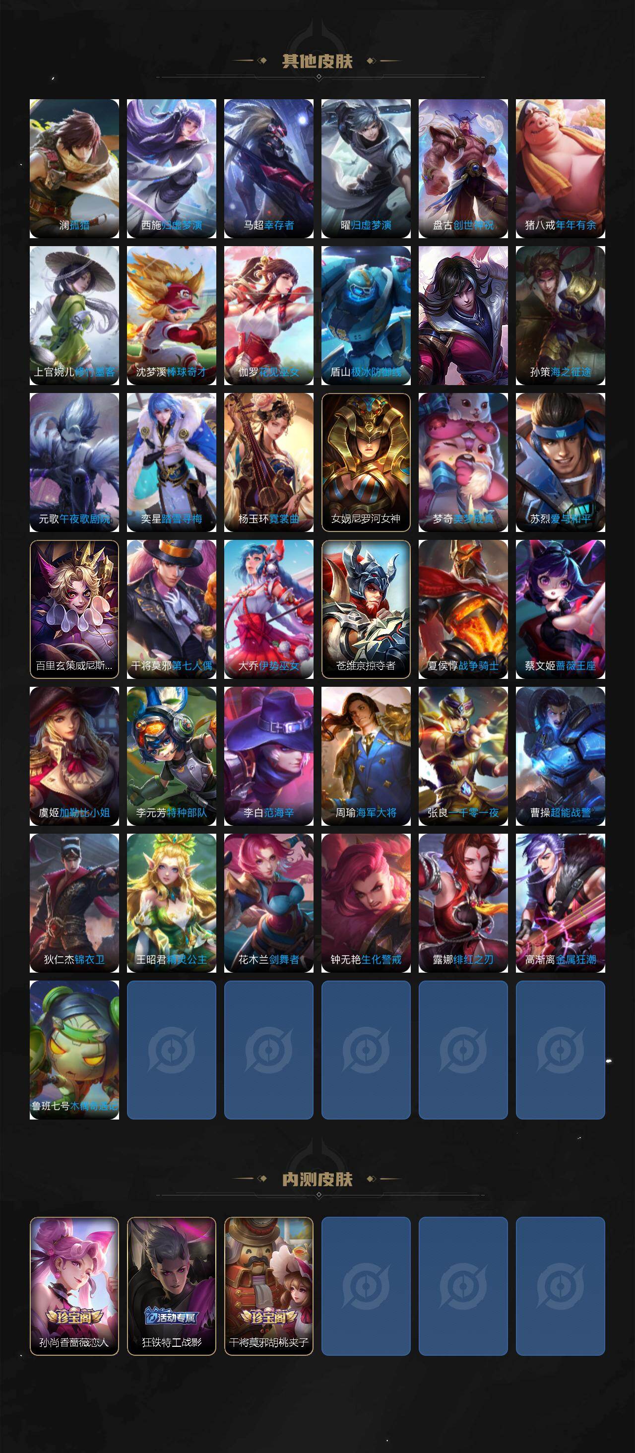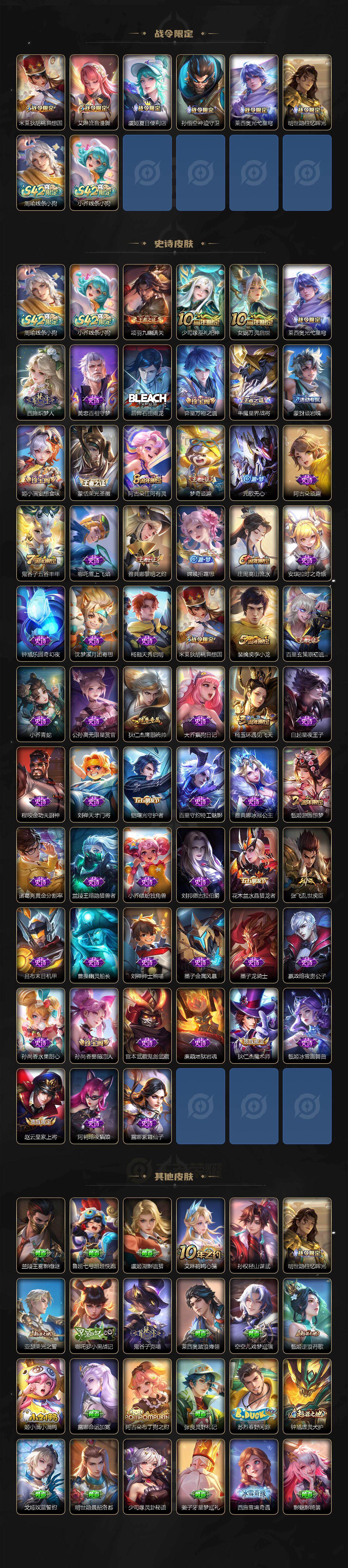 【限定皮肤】:蒙犽顽岩魄,虞姬夏日便利店,姜子牙天穹之誓,狄仁杰阴阳师,赵云皇家上将,孙尚香蔷薇恋人,庄周高山流水,元歌无心,甄姬游园惊梦,狄仁杰魔术师,狄仁杰万华元夜,达摩沙漠行僧,项羽海滩派对,老夫子醍醐杖,程咬金演武夺筹,兰陵王金庭之子,李元芳云中旅人,钟馗驱傩正仪,杨玉环遇见飞天,干将莫邪胡桃夹子,雅典娜黎明之约,鬼谷子原初探秘者,鬼谷子五谷丰年,苏烈千军破阵,百里玄策原初追逐者,弈星混沌棋,梦奇顽趣,沈梦溪大漠名商,明世隐疑决卦,裴擒虎李小龙,裴擒虎擒涛扼浪,米莱狄胡桃异想国,嫦娥拒霜思,鲁班大师探海日志,桑启海盐诗旅,艾琳流音漫舞,阿古朵江河有灵,张良古海寻踪,蒙恬荣光圣徽,鬼谷子天穹祈灯,姬小满妄想食味,沈梦溪龙舞盛年,刘邦剑破天穹,程咬金群星魔术团,周瑜熔金海岸