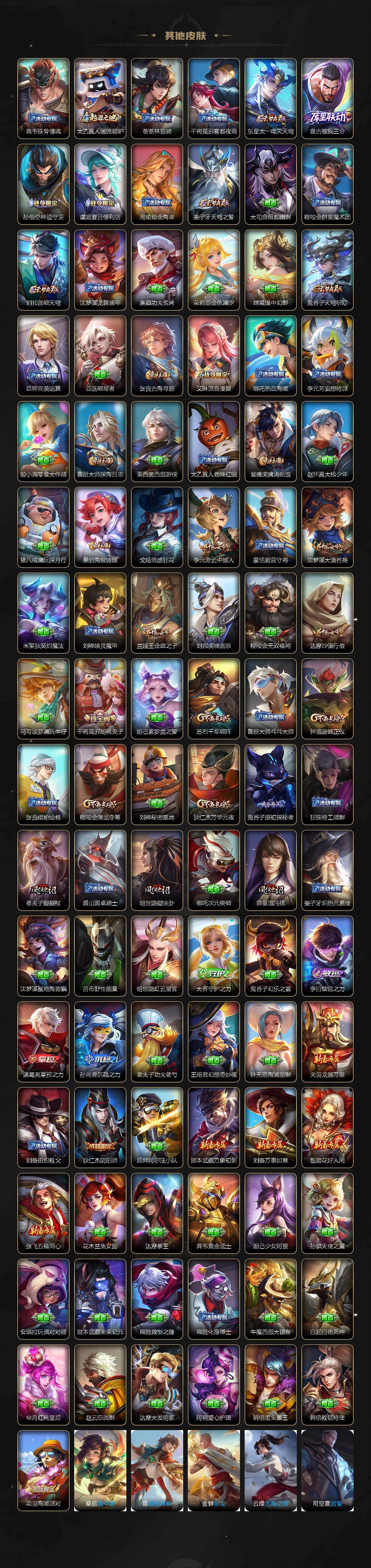 小乔青蛇,公孙离无限星赏官,大乔猫狗日记,露娜紫霞仙子,诸葛亮黄金分割率,阿轲暗夜猫娘,雅典娜冰冠公主,吕布末日机甲,墨子龙骑士,刘禅绅士熊喵,刘禅天才门将,白起星夜王子,安琪拉时之奇旅,程咬金功夫厨神,刘邦德古拉伯爵,兰陵王暗隐猎兽者,曹操幽灵船长,宫本武藏鬼剑武藏,钟馗乐园奇幻夜,杨戬天秀·启明,廉颇地狱岩魂,小乔缤纷独角兽,花木兰水晶猎龙者,铠曙光守护者,墨子金属风暴,百里玄策原初追逐者,百里守约特工魅影,嬴政暗夜贵公子,嫦娥拒霜思,雅典娜黎明之约,哪吒雪上飞焰,阿古朵顽趣