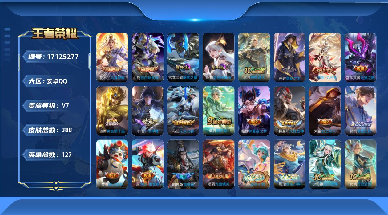 - [11884380]V7 1典藏 10传说 124英雄 235皮肤 可修改实名 优质装备:全息碎影(猴子典藏),冠军飞将,末日机甲-孙尚香(绿蚂蚱),地狱火,仲夏夜之梦(大飞蛾),超时空战士-狄仁杰 珍宝阁皮:优雅恋人 限定皮:白虎志(电光耗子),凤求凰(白切鸡),太华(伽罗年限),梅西,武陵仙君(小桃花),神威(电光马子),遇见飞天,游园惊梦,梁祝,御风骁将(吕布年限),龙胆,逐梦之翼,李小龙,逐梦之影,朱雀志(守约年限),永曜之星,辉光之辰,如梦令-嫦娥,如梦令-后羿,一生所爱,大圣娶亲,寅虎·心曲(虎婆) 史诗皮:化蝶舞,龙之律动,藏狐·褐绒,茶境仙,紫霞仙子,苍穹之光,电玩小子(小书包),黄金分割率,特工魅影,千年之狐,江河有灵,蒙恬荣光圣徽,无限星赏官,电玩·爆裂旋风,乱世虎臣,摇滚巨星,水果甜心,星夜王子,德古拉伯爵,暗隐猎兽者,鬼剑武藏,乐园奇幻夜,舞动绿茵,地狱岩魂,纤云弄巧,繁星吟游(呼啦呼啦),拒霜思,乘风破浪,逐浪之夏,水晶猎龙者,曙光守护者,金属风暴,原初追逐者,圣诞狂欢,圣诞恋歌,鹰眼统帅,暗夜贵公子,魅力维加斯,黎明之约,无心,未来纪元-赵云
