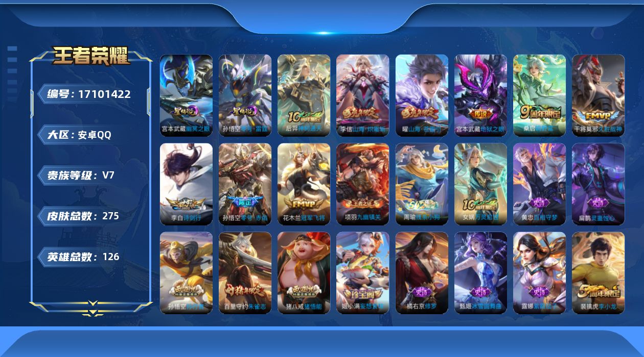 [17101422]安卓Q-V7-最强王者段位-126英雄-275皮肤-9传说-67史诗