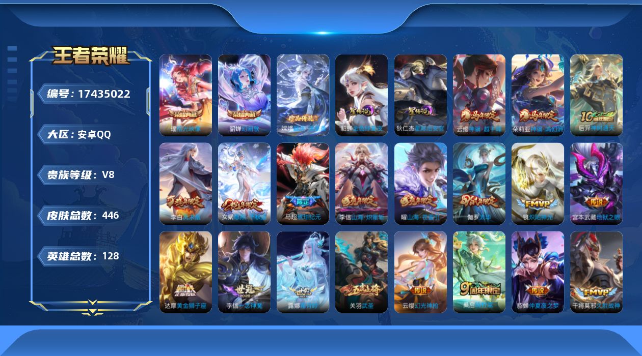 [17435022]安卓Q-V8-446皮肤-2典藏皮肤-1珍品传说-30传说-136史诗 【英雄全皮】:刘禅全皮,刘邦全皮,孙权全皮,鬼谷子全皮,戈娅全皮,空空儿全皮,影全皮 【荣耀典藏】:貂蝉幻阙歌,瑶拾光映像 【珍品传说】:嫦娥器灵落星盏 【传说皮肤】:云缨神骥越千峰,朵莉亚神骥鸣幻洲,后羿神树通天,女娲愿照千秋盛,云缨幻光神枪,桑启鸣野蒿,马超琥珀纪元,露娜霜月吟,曜山海苍雷引,李信山海炽霜斩,王昭君乞巧织情,镜炽阳神光,虞姬启明星使,孙悟空零号赤焰,关羽武圣,李信一念神魔,刘备时之恋人,伽罗太华,貂蝉猫影幻舞,张良黄金白羊座,干将莫邪久胜战神,达摩黄金狮子座,花木兰冠军飞将,梦奇胖达荣荣,后羿黄金射手座,貂蝉仲夏夜之梦,李白凤求凰,宫本武藏地狱之眼,孙悟空地狱火,狄仁杰超时空战士 【限定皮肤】:蒙犽顽岩魄,蔡文姬夏日便利店,大乔绒语心约,虞姬夏日便利店,姜子牙天穹之誓,杨戬破阵退雄兵,狄仁杰阴阳师,赵云皇家上将,妲己时之彼端,嬴政白昼王子,孙尚香蔷薇恋人,鲁班七号狮舞东方,庄周高山流水,阿轲迷踪丽影,钟无艳超时空战士,孙膑天狼运算者,扁鹊奇幻香踪,芈月重明,周瑜真爱至上,周瑜赤莲之焰,元歌云间偶戏,元歌无心,夏侯惇朔风刀,甄姬幽恒,甄姬落雪兰心,曹操天狼征服者,典韦穷奇,典韦蓝屏警告,马可波罗暗影游猎,马可波罗山海玄木吟,狄仁杰魔术师,狄仁杰万华元夜,达摩星际陆战队,达摩沙漠行僧,项羽海滩派对,老夫子醍醐杖,关羽武圣,程咬金演武夺筹,刘邦夺宝奇兵,韩信飞衡,王昭君凤凰于飞,兰陵王驯魔猎人,孙悟空零号赤焰,后羿辉光之辰,后羿如梦令,李元芳银河之约,李元芳匿光侦查者,李元芳云中旅人,虞姬启明星使,钟馗驱傩正仪,杨玉环遇见飞天,干将莫邪冰霜恋舞曲,雅典娜单词大作战,蔡文姬奇迹圣诞,蔡文姬繁星吟游,太乙真人华丽摇滚,鬼谷子原初探秘者,鬼谷子五谷丰年,百里玄策原初追逐者,弈星混沌棋,沈梦溪星空之诺,明世隐疑决卦,裴擒虎李小龙,裴擒虎擒涛扼浪,狂铁御狮,米莱狄御霄,米莱狄胡桃异想国,云中君纤云弄巧,李信山海炽霜斩,伽罗太华,盾山御銮,猪八戒西部大镖客,上官婉儿梁祝,上官婉儿天狼绘梦者,嫦娥如梦令,嫦娥拒霜思,嫦娥暖冬兔眠,曜山海苍雷引,西施玲珑珍味,蒙犽狂想玩偶喵,鲁班大师探海日志,桑启海盐诗旅,暃星界游侠,戈娅驭风魔法,艾琳流音漫舞,司空震地狱燃心,阿古朵江河有灵,张良古海寻踪,蒙犽
