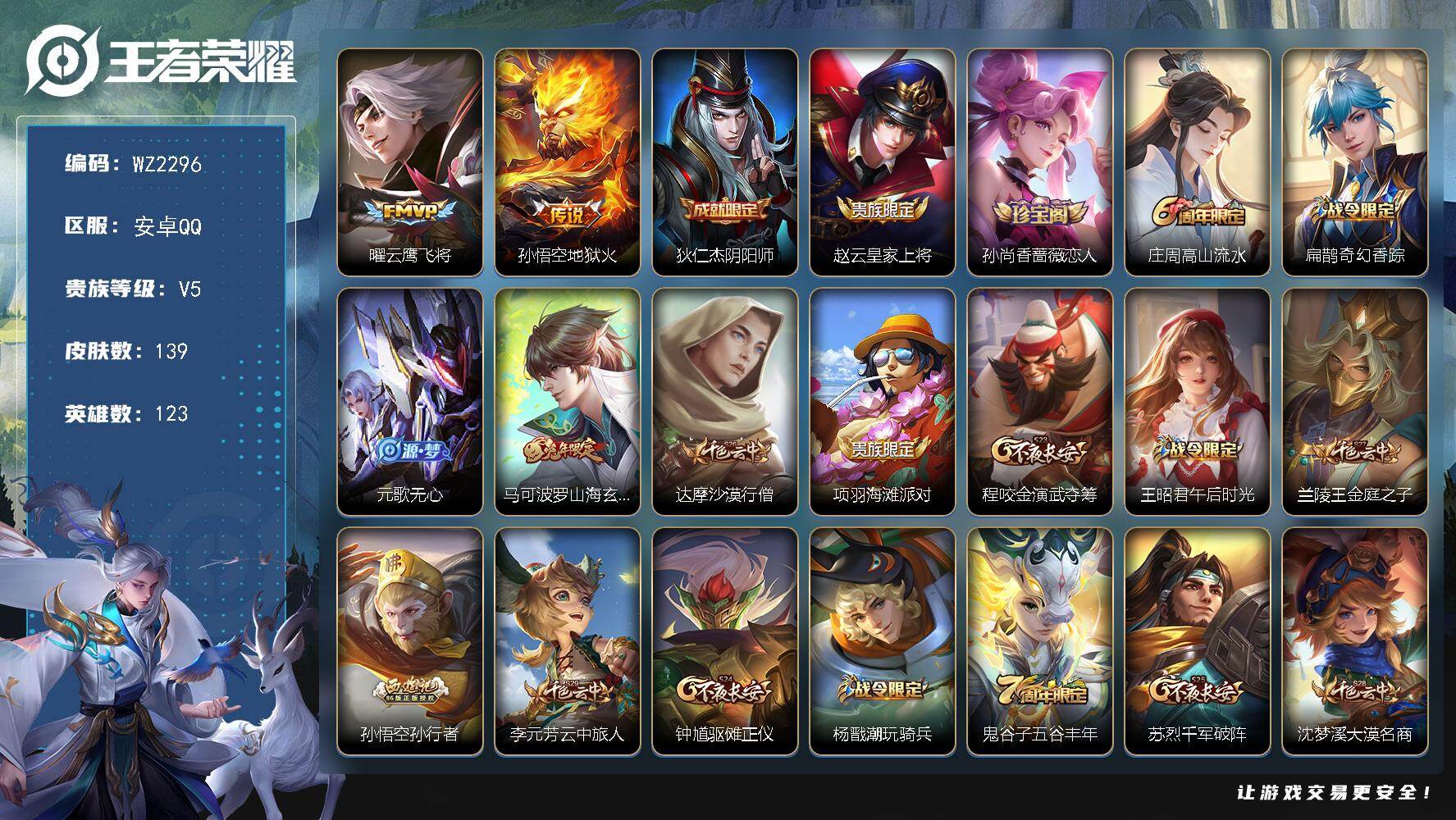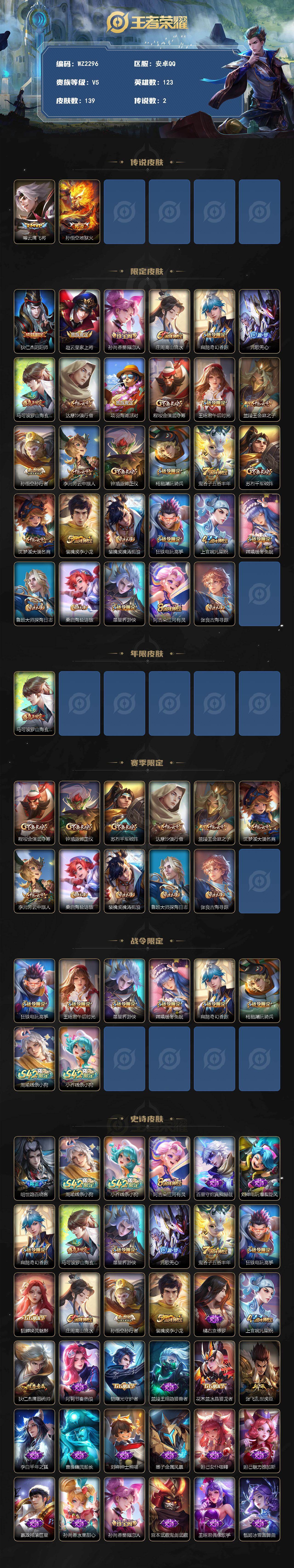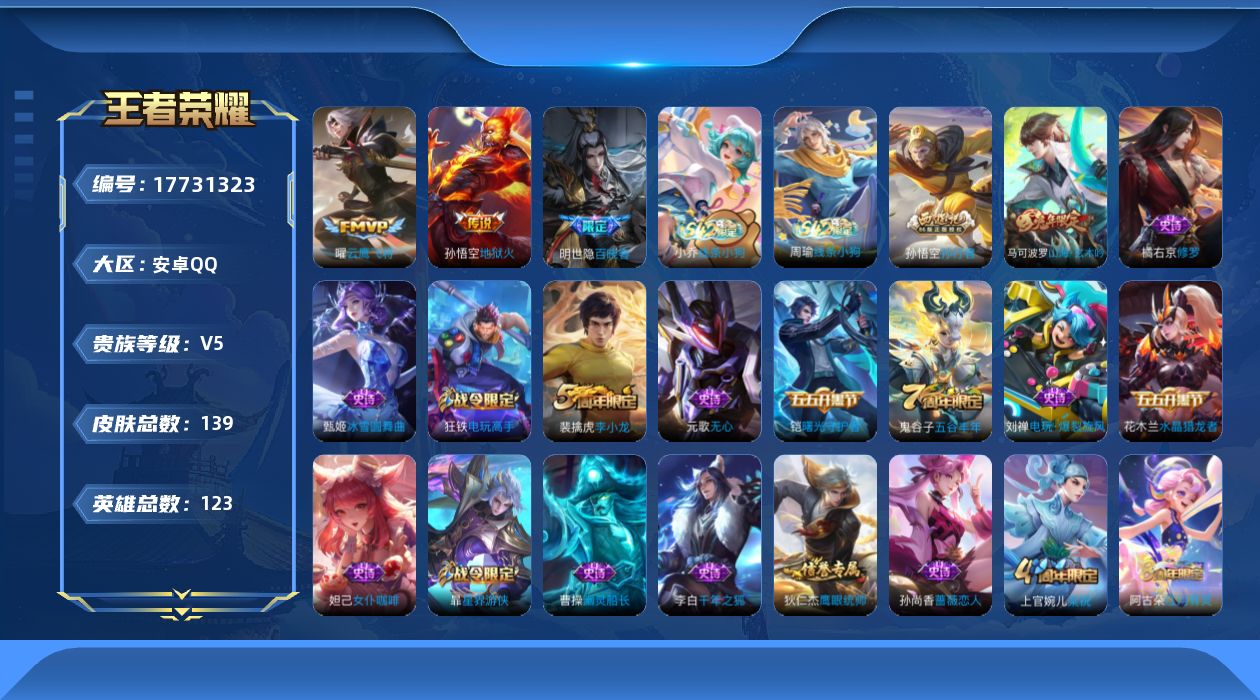 [17731323]安卓Q-139皮肤-2传说-38史诗 【传说皮肤】:曜云鹰飞将,孙悟空地狱火 【限定皮肤】:狄仁杰阴阳师,赵云皇家上将,孙尚香蔷薇恋人,庄周高山流水,扁鹊奇幻香踪,元歌无心,马可波罗山海玄木吟,达摩沙漠行僧,项羽海滩派对,程咬金演武夺筹,王昭君午后时光,兰陵王金庭之子,孙悟空孙行者,李元芳云中旅人,钟馗驱傩正仪,杨戬潮玩骑兵,鬼谷子五谷丰年,苏烈千军破阵,沈梦溪大漠名商,裴擒虎李小龙,裴擒虎擒涛扼浪,狂铁电玩高手,上官婉儿梁祝,嫦娥暖冬兔眠,鲁班大师探海日志,桑启海盐诗旅,暃星界游侠,阿古朵江河有灵,张良古海寻踪 【年限皮肤】:马可波罗山海玄木吟 【赛季限定】:程咬金演武夺筹,钟馗驱傩正仪,苏烈千军破阵,达摩沙漠行僧,兰陵王金庭之子,沈梦溪大漠名商,李元芳云中旅人,桑启海盐诗旅,裴擒虎擒涛扼浪,鲁班大师探海日志,张良古海寻踪 【战令限定】:狂铁电玩高手,王昭君午后时光,暃星界游侠,嫦娥暖冬兔眠,扁鹊奇幻香踪,杨戬潮玩骑兵,周瑜线条小狗,小乔线条小狗 【史诗皮肤】:明世隐百晓客,周瑜线条小狗,小乔线条小狗,阿古朵江河有灵,百里守约真我赫兹,刘禅电玩爆裂旋风,扁鹊奇幻香踪,马可波罗山海玄木吟,暃星界游侠,元歌无心,鬼谷子五谷丰年,狂铁电玩高手,貂蝉唤灵魅影,庄周高山流水,孙悟空孙行者,裴擒虎李小龙,橘右京修罗,上官婉儿梁祝,狄仁杰鹰眼统帅,阿轲节奏热浪,铠曙光守护者,兰陵王暗隐猎兽者,花木兰水晶猎龙者,张飞乱世虎臣,李白千年之狐,曹操幽灵船长,刘禅绅士熊喵,墨子金属风暴,妲己女仆咖啡,妲己魅力维加斯,嬴政摇滚巨星,孙尚香水果甜心,孙尚香蔷薇恋人,宫本武藏鬼剑武藏,王昭君偶像歌手,甄姬冰雪圆舞曲,貂蝉圣诞恋歌,赵云未来纪元,赵云皇家上将 【其他皮肤】:兰陵王雾影缉谜,鲁班七号班班快跑,蚩奼极光幻客,兰陵王幻夜行动,亚连破局者,钟无艳聚星闪耀,张良古海寻踪,哪吒热血海滩,鲁班大师探海日志,太乙真人劲辣红锅,杨戬潮玩骑兵,裴擒虎擒涛扼浪,赵怀真太极少年,白起乐园追猎者,牛魔牛运亨通,猪八戒潮玩探月行,海月幻泉雾影,嫦娥暖冬兔眠,桑启海盐诗旅,戈娅危途狂花,李元芳云中旅人,沈梦溪大漠名商,王昭君午后时光,米莱狄契约魔法,刘禅唤灵魔甲,兰陵王金庭之子,刘邦虎啸剑宗,程咬金无双福将,达摩沙漠行僧,苏烈千军破阵,鲁班大师乓乓大师,钟馗驱傩正仪,张良缤纷绘卷,程咬金演武夺筹,刘禅秘密