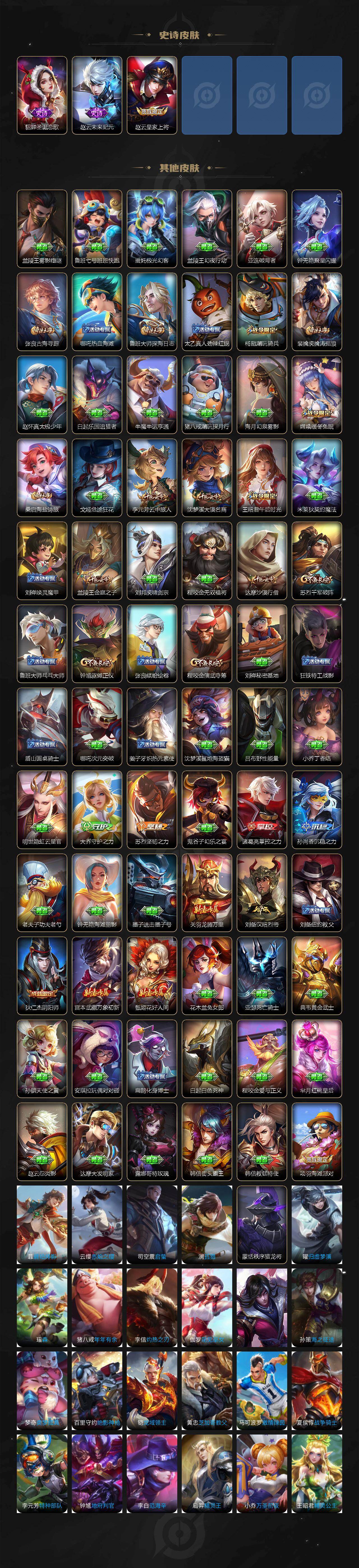 【史诗皮肤】:明世隐百晓客,周瑜线条小狗,小乔线条小狗,阿古朵江河有灵,百里守约真我赫兹,刘禅电玩爆裂旋风,扁鹊奇幻香踪,马可波罗山海玄木吟,暃星界游侠,元歌无心,鬼谷子五谷丰年,狂铁电玩高手,貂蝉唤灵魅影,庄周高山流水,孙悟空孙行者,裴擒虎李小龙,橘右京修罗,上官婉儿梁祝,狄仁杰鹰眼统帅,阿轲节奏热浪,铠曙光守护者,兰陵王暗隐猎兽者,花木兰水晶猎龙者,张飞乱世虎臣,李白千年之狐,曹操幽灵船长,刘禅绅士熊喵,墨子金属风暴,妲己女仆咖啡,妲己魅力维加斯,嬴政摇滚巨星,孙尚香水果甜心,孙尚香蔷薇恋人,宫本武藏鬼剑武藏,王昭君偶像歌手,甄姬冰雪圆舞曲,貂蝉圣诞恋歌,赵云未来纪元,赵云皇家上将