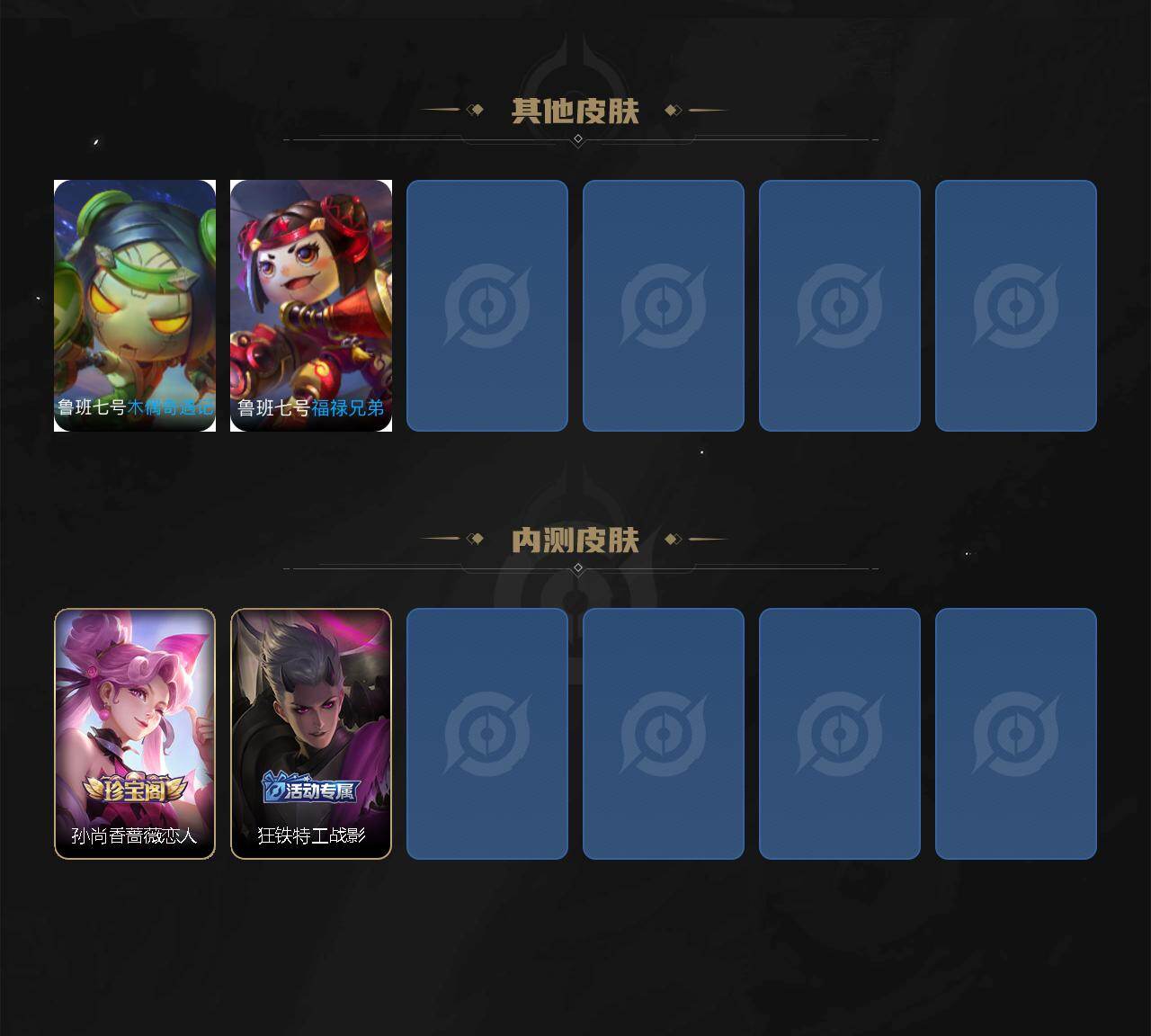 【赛季限定】:程咬金演武夺筹,钟馗驱傩正仪,苏烈千军破阵,达摩沙漠行僧,兰陵王金庭之子,沈梦溪大漠名商,李元芳云中旅人,桑启海盐诗旅,裴擒虎擒涛扼浪,鲁班大师探海日志,张良古海寻踪