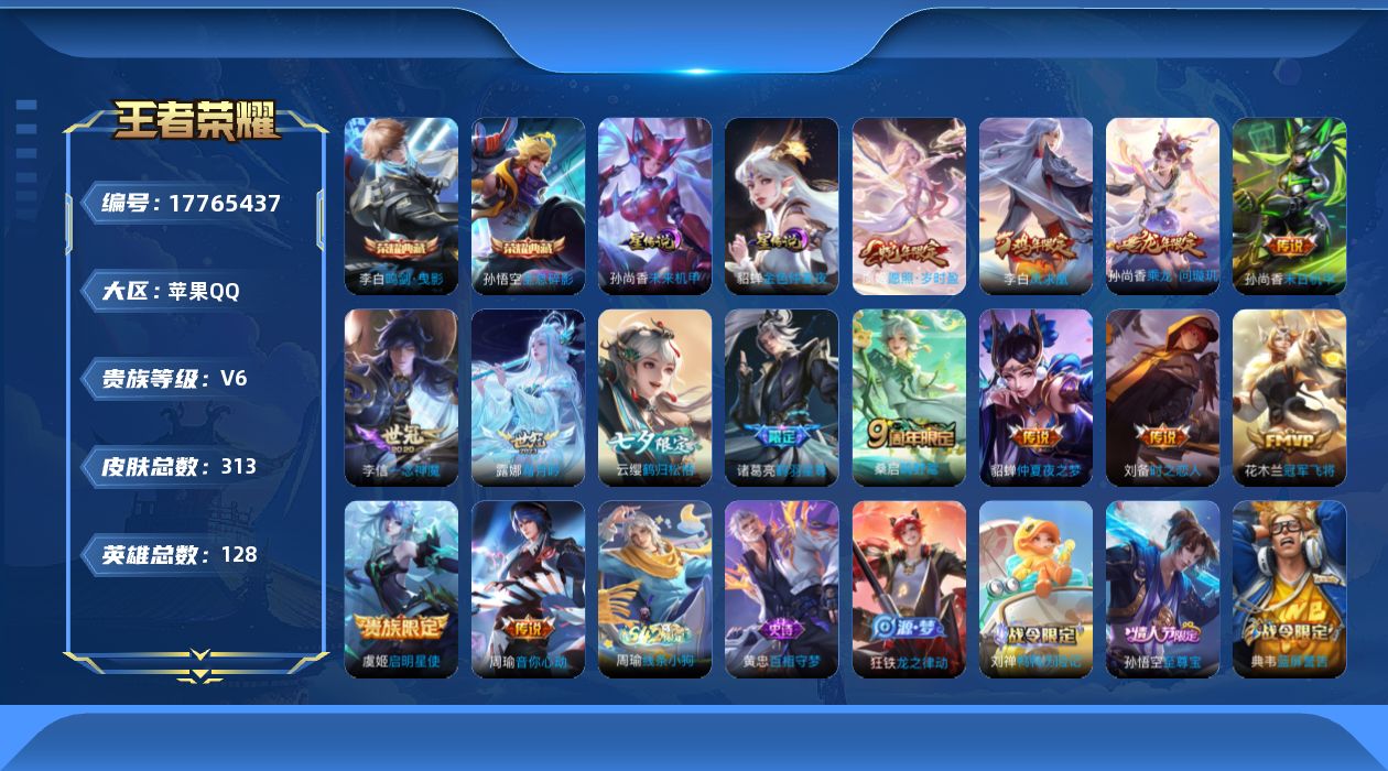 [17765437]苹果Q-313皮肤-2典藏皮肤-14传说-93史诗 【英雄全皮】:孙权全皮,空空儿全皮,影全皮 【荣耀典藏】:孙悟空全息碎影,李白鸣剑曳影 【传说皮肤】:虞姬愿照岁时盈,桑启鸣野蒿,孙尚香乘龙问璇玑,露娜霜月吟,云缨鹤归松栖,诸葛亮鹤羽星尊,周瑜音你心动,虞姬启明星使,李信一念神魔,刘备时之恋人,花木兰冠军飞将,貂蝉仲夏夜之梦,李白凤求凰,孙尚香末日机甲 【限定皮肤】:大乔绒语心约,李白谪仙醉月,狄仁杰阴阳师,赵云皇家上将,赵云引擎之心,墨子神迹守卫,嬴政优雅恋人,孙尚香蔷薇恋人,鲁班七号狮舞东方,庄周高山流水,扁鹊奇幻香踪,吕布猎兽之王,周瑜赤莲之焰,元歌云间偶戏,元歌无心,夏侯惇朔风刀,典韦蓝屏警告,马可波罗山海玄木吟,狄仁杰魔术师,狄仁杰万华元夜,达摩星际陆战队,达摩沙漠行僧,项羽海滩派对,老夫子醍醐杖,老夫子航海奇遇记,程咬金演武夺筹,韩信傲雪梅枪,兰陵王驯魔猎人,兰陵王金庭之子,花木兰默契交锋,亚瑟潮玩骑士王,孙悟空至尊宝,牛魔御旌,后羿如梦令,后羿圣弓游侠,李元芳匿光侦查者,李元芳云中旅人,虞姬启明星使,钟馗神迹守卫,钟馗驱傩正仪,杨玉环遇见飞天,杨戬潮玩骑兵,雅典娜单词大作战,雅典娜黎明之约,鬼谷子原初探秘者,鬼谷子五谷丰年,诸葛亮鹤羽星尊,苏烈千军破阵,弈星混沌棋,明世隐疑决卦,裴擒虎李小龙,裴擒虎擒涛扼浪,米莱狄御霄,米莱狄胡桃异想国,云中君纤云弄巧,盾山御銮,猪八戒猪悟能,上官婉儿梁祝,嫦娥拒霜思,嫦娥暖冬兔眠,西施玲珑珍味,蒙犽狂想玩偶喵,鲁班大师探海日志,桑启海盐诗旅,戈娅驭风魔法,艾琳女武神,艾琳流音漫舞,赵怀真鹤归松栖,云缨鹤归松栖,司空震地狱燃心,阿古朵江河有灵,张良古海寻踪,蒙犽百解令,高渐离燃音魔法,妲己灵卜魔法,鬼谷子天穹祈灯,伽罗琥珀纪元,孙尚香乘龙问璇玑,沈梦溪龙舞盛年,鲁班七号蔬乡物语,李元芳蔬乡物语,刘邦剑破天穹,程咬金群星魔术团,镜青焰无极,项羽苍威无极 【年限皮肤】:李白凤求凰,马可波罗山海玄木吟,孙尚香乘龙问璇玑,虞姬愿照岁时盈 【赛季限定】:米莱狄御霄,牛魔御旌,盾山御銮,夏侯惇朔风刀,弈星混沌棋,明世隐疑决卦,老夫子醍醐杖,鬼谷子原初探秘者,狄仁杰万华元夜,程咬金演武夺筹,钟馗驱傩正仪,苏烈千军破阵,达摩沙漠行僧,兰陵王金庭之子,李元芳云中旅人,桑启海盐诗旅,裴擒虎擒涛扼浪,鲁班大师探海日志,张良古海寻踪,鬼谷