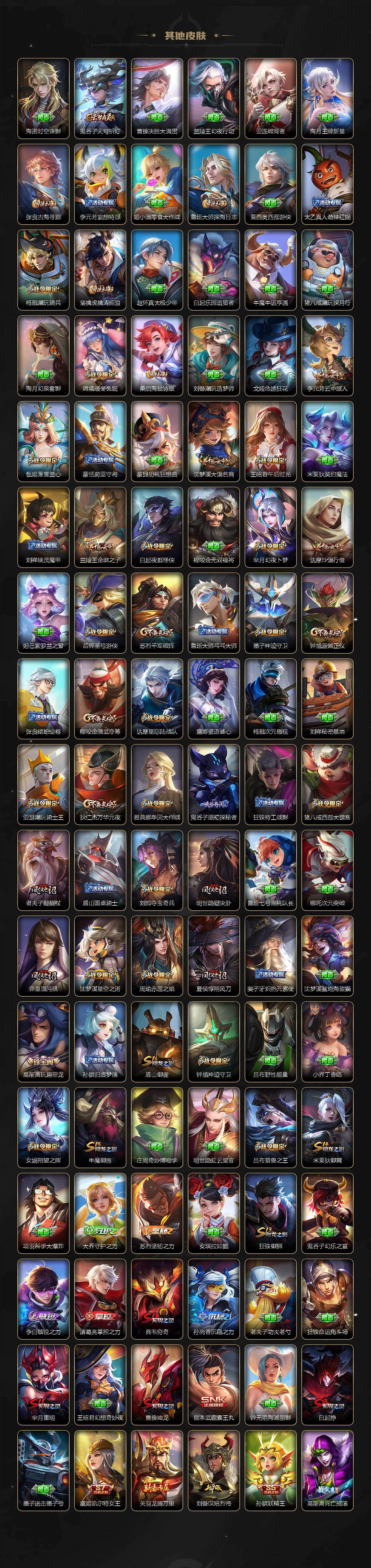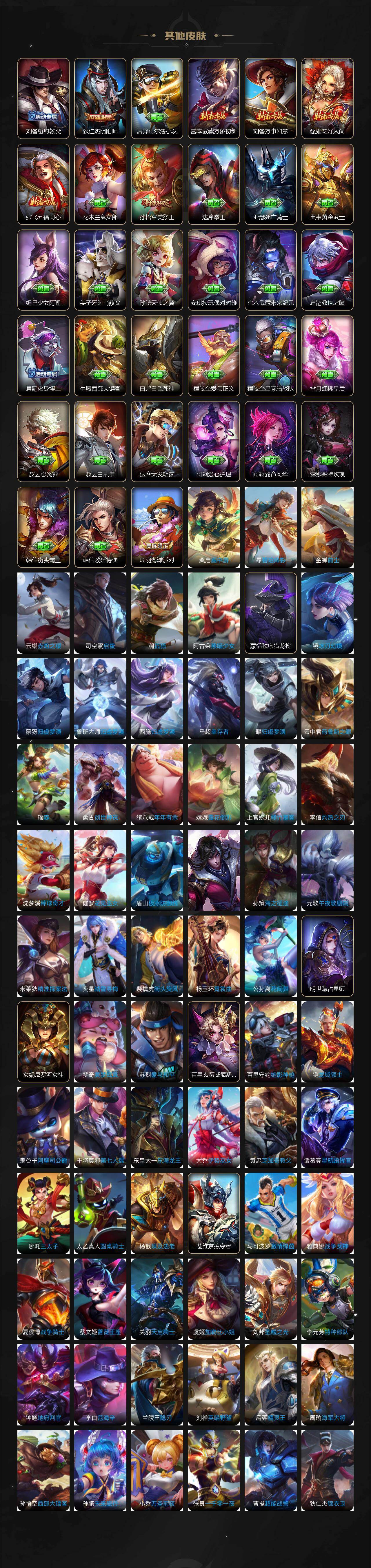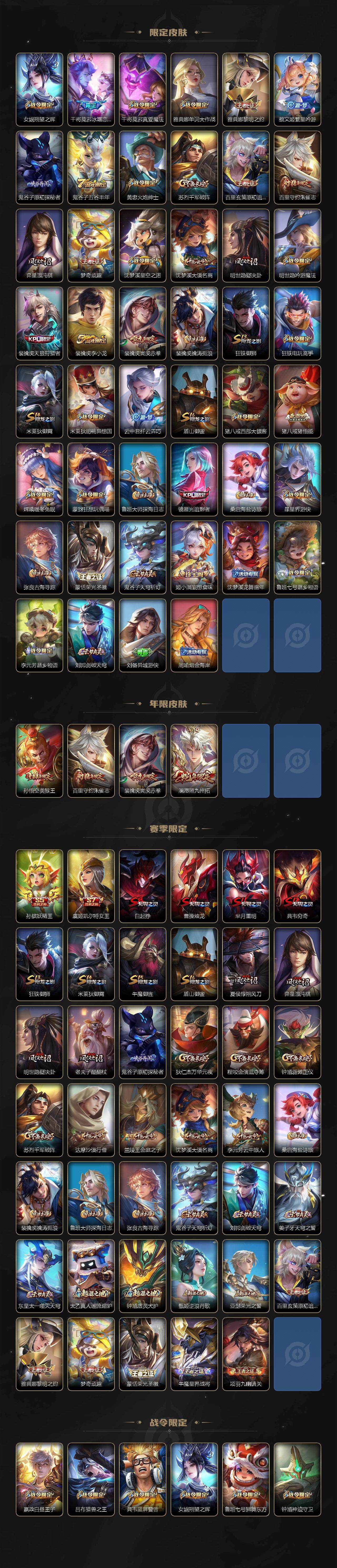 【限定皮肤】:白起狰,蔡文姬夏日便利店,虞姬夏日便利店,姜子牙天穹之誓,狄仁杰阴阳师,虞姬凯尔特女王,赵云皇家上将,墨子神迹守卫,嬴政优雅恋人,嬴政白昼王子,鲁班七号狮舞东方,高渐离死亡摇滚,高渐离玩趣恶龙,阿轲迷踪丽影,钟无艳超时空战士,孙膑妖精王,扁鹊奇幻香踪,白起夜都怪侠,芈月重明,芈月幻夜卜梦,吕布猎兽之王,周瑜赤莲之焰,元歌云间偶戏,元歌无心,夏侯惇朔风刀,甄姬落雪兰心,曹操烛龙,典韦穷奇,典韦蓝屏警告,马可波罗暗影游猎,狄仁杰魔术师,狄仁杰万华元夜,达摩星际陆战队,达摩沙漠行僧,项羽海滩派对,老夫子醍醐杖,老夫子航海奇遇记,关羽冰锋战神,关羽武圣,程咬金演武夺筹,刘邦夺宝奇兵,韩信逐梦之影,王昭君午后时光,兰陵王驯魔猎人,兰陵王金庭之子,花木兰青春决赛季,亚瑟潮玩骑士王,孙悟空美猴王,孙悟空至尊宝,孙悟空零号赤焰,牛魔御旌,后羿圣弓游侠,李元芳银河之约,李元芳云中旅人,虞姬霸王别姬,虞姬启明星使,钟馗神迹守卫,钟馗驱傩正仪,杨玉环遇见飞天,杨戬潮玩骑兵,女娲朔望之晖,干将莫邪冰霜恋舞曲,干将莫邪真爱魔法,雅典娜单词大作战,雅典娜黎明之约,蔡文姬繁星吟游,鬼谷子原初探秘者,鬼谷子五谷丰年,黄忠火炮绅士,苏烈千军破阵,百里玄策原初追逐者,百里守约朱雀志,弈星混沌棋,梦奇顽趣,沈梦溪星空之诺,沈梦溪大漠名商,明世隐疑决卦,明世隐吟游魔法,裴擒虎天狼狩猎者,裴擒虎李小龙,裴擒虎寅虎赤拳,裴擒虎擒涛扼浪,狂铁御狮,狂铁电玩高手,米莱狄御霄,米莱狄胡桃异想国,云中君纤云弄巧,盾山御銮,猪八戒西部大镖客,猪八戒猪悟能,嫦娥暖冬兔眠,蒙犽狂想玩偶喵,鲁班大师探海日志,镜匿光追影者,桑启海盐诗旅,暃星界游侠,张良古海寻踪,蒙恬荣光圣徽,鬼谷子天穹祈灯,姬小满妄想食味,沈梦溪龙舞盛年,鲁班七号蔬