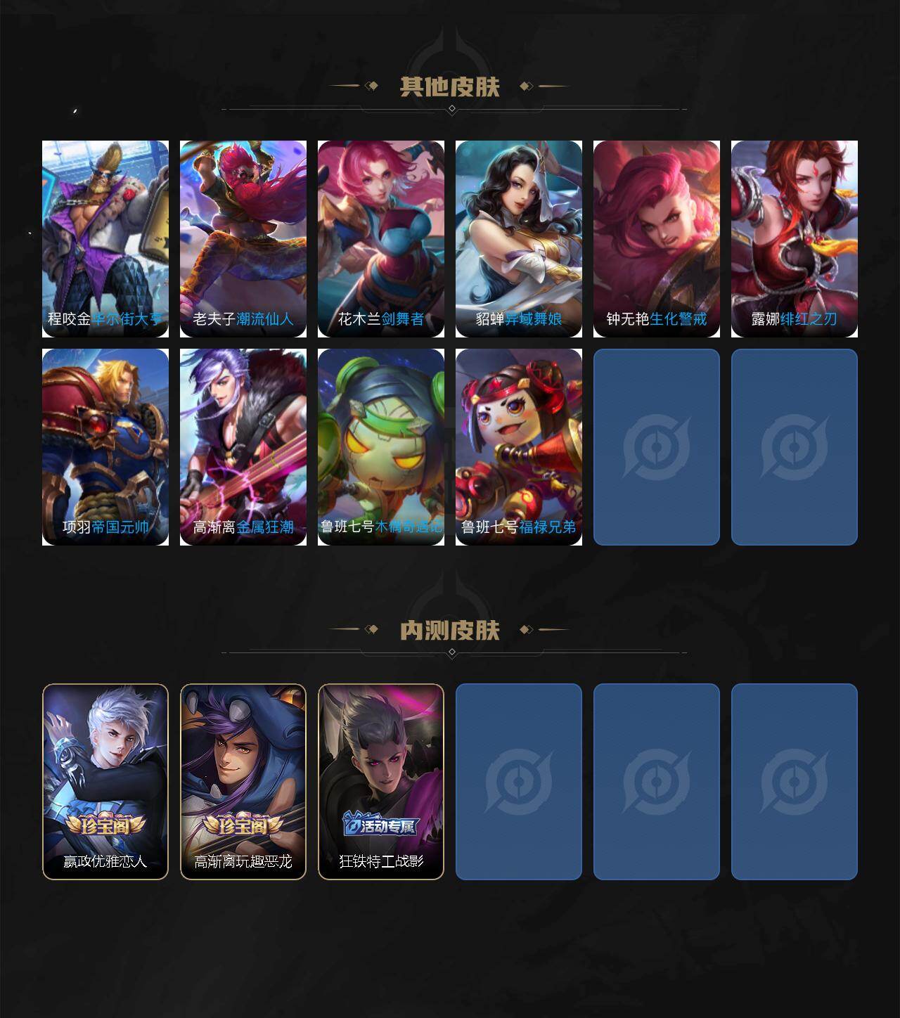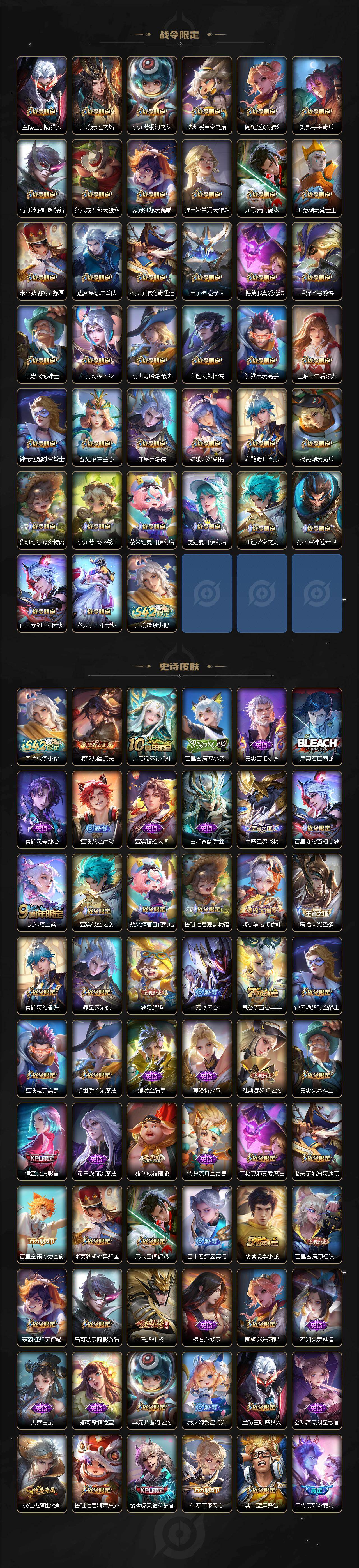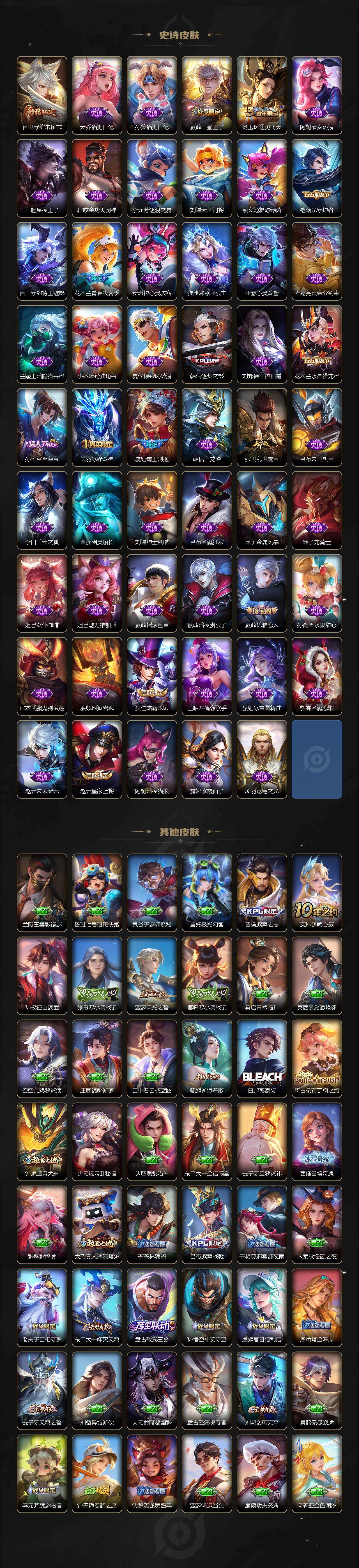 【限定皮肤】:白起狰,蔡文姬夏日便利店,虞姬夏日便利店,姜子牙天穹之誓,狄仁杰阴阳师,虞姬凯尔特女王,赵云皇家上将,墨子神迹守卫,嬴政优雅恋人,嬴政白昼王子,鲁班七号狮舞东方,高渐离死亡摇滚,高渐离玩趣恶龙,阿轲迷踪丽影,钟无艳超时空战士,孙膑妖精王,扁鹊奇幻香踪,白起夜都怪侠,芈月重明,芈月幻夜卜梦,吕布猎兽之王,周瑜赤莲之焰,元歌云间偶戏,元歌无心,夏侯惇朔风刀,甄姬落雪兰心,曹操烛龙,典韦穷奇,典韦蓝屏警告,马可波罗暗影游猎,狄仁杰魔术师,狄仁杰万华元夜,达摩星际陆战队,达摩沙漠行僧,项羽海滩派对,老夫子醍醐杖,老夫子航海奇遇记,关羽冰锋战神,关羽武圣,程咬金演武夺筹,刘邦夺宝奇兵,韩信逐梦之影,王昭君午后时光,兰陵王驯魔猎人,兰陵王金庭之子,花木兰青春决赛季,亚瑟潮玩骑士王,孙悟空美猴王,孙悟空至尊宝,孙悟空零号赤焰,牛魔御旌,后羿圣弓游侠,李元芳银河之约,李元芳云中旅人,虞姬霸王别姬,虞姬启明星使,钟馗神迹守卫,钟馗驱傩正仪,杨玉环遇见飞天,杨戬潮玩骑兵,女娲朔望之晖,干将莫邪冰霜恋舞曲,干将莫邪真爱魔法,雅典娜单词大作战,雅典娜黎明之约,蔡文姬繁星吟游,鬼谷子原初探秘者,鬼谷子五谷丰年,黄忠火炮绅士,苏烈千军破阵,百里玄策原初追逐者,百里守约朱雀志,弈星混沌棋,梦奇顽趣,沈梦溪星空之诺,沈梦溪大漠名商,明世隐疑决卦,明世隐吟游魔法,裴擒虎天狼狩猎者,裴擒虎李小龙,裴擒虎寅虎赤拳,裴擒虎擒涛扼浪,狂铁御狮,狂铁电玩高手,米莱狄御霄,米莱狄胡桃异想国,云中君纤云弄巧,盾山御銮,猪八戒西部大镖客,猪八戒猪悟能,嫦娥暖冬兔眠,蒙犽狂想玩偶喵,鲁班大师探海日志,镜匿光追影者,桑启海盐诗旅,暃星界游侠,张良古海寻踪,蒙恬荣光圣徽,鬼谷子天穹祈灯,姬小满妄想食味,沈梦溪龙舞盛年,鲁班七号蔬