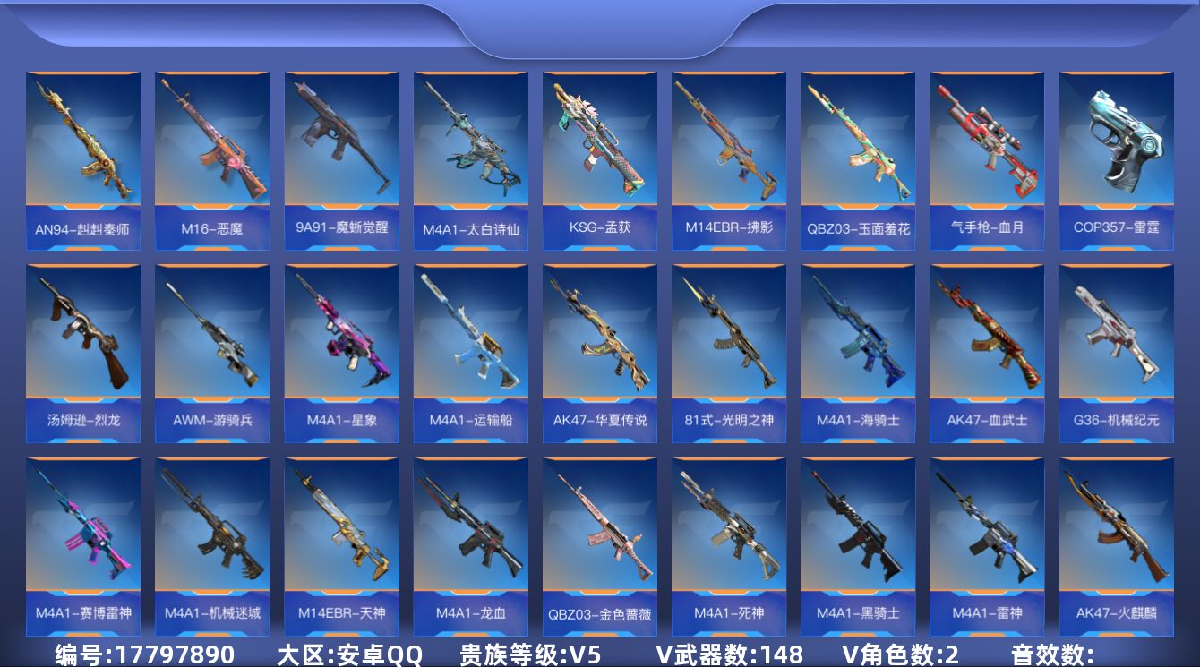 【英雄武器】:AK47-火麒麟,AK47-血武士,AK47-华夏传说,AK47-木兰*2,AK47-谜城烟火,M4A1-雷神,M4A1-黑骑士,M4A1-死神*2,M4A1-星象,M4A1-龙血,M4A1-机械迷城,M4A1-赛博雷神,M4A1-海骑士,M4A1-运输船,M4A1-太白诗仙,SCAR-探星者,SCAR-心动PICK,AN94-赳赳秦师,FAMAS-湮灭,9A91-天神,9A91-魔蜥觉醒,M14EBR-天神,M14EBR-拂影,M16-恶魔,QBZ03-金色蔷薇,QBZ03-玉面羞花,81式-光明之神,G36-机械纪元,QBZ191-封神榜,AWM-游骑兵*2,AWM-裁决,AWM-指南针觉醒,AWM-指南针,AWM-大湾溢彩,巴雷特-毁灭*2,巴雷特-极光*2,09式狙-天神,QBB95-极光,汤姆逊-烈龙,CZS2-心动次元,PP19野牛-造纸术,地狱火,KSG-孟获,USP-机械迷城,沙鹰-修罗*2,沙鹰-火麒麟,沙鹰-天神,气手枪-血月,沙鹰-宇航兔兔,改装GLOCK-木兰*2,双持GLOCK18-本初,GLOCK18-猎神,COP 357-雷霆,QSZ92-华夏传说,女皇利刃-铁胆虎魄,炽芒蝶刃,匕首-浩瀚征途,血阳,手斧-机械迷城,秋逸,屠龙,尼泊尔-竞界荣光,麒麟刺*3,马来剑-毁灭,唐刀-华夏传说*2,唐刀-大唐荣耀*2,擎天,斩魔刀,破邪蛇棍觉醒,马来剑-耀金伯爵,火麒麟手雷,手雷-竞界荣光*3,雷神手雷,高爆手雷-无限,闪光弹-游骑兵*2,黑骑士闪光弹,火麒麟闪光弹,雷神闪光弹,烟雾弹-游骑兵*2,火麒麟烟雾弹,雷神烟雾弹,烟雾弹-星际宇航,燃烧弹-游骑兵