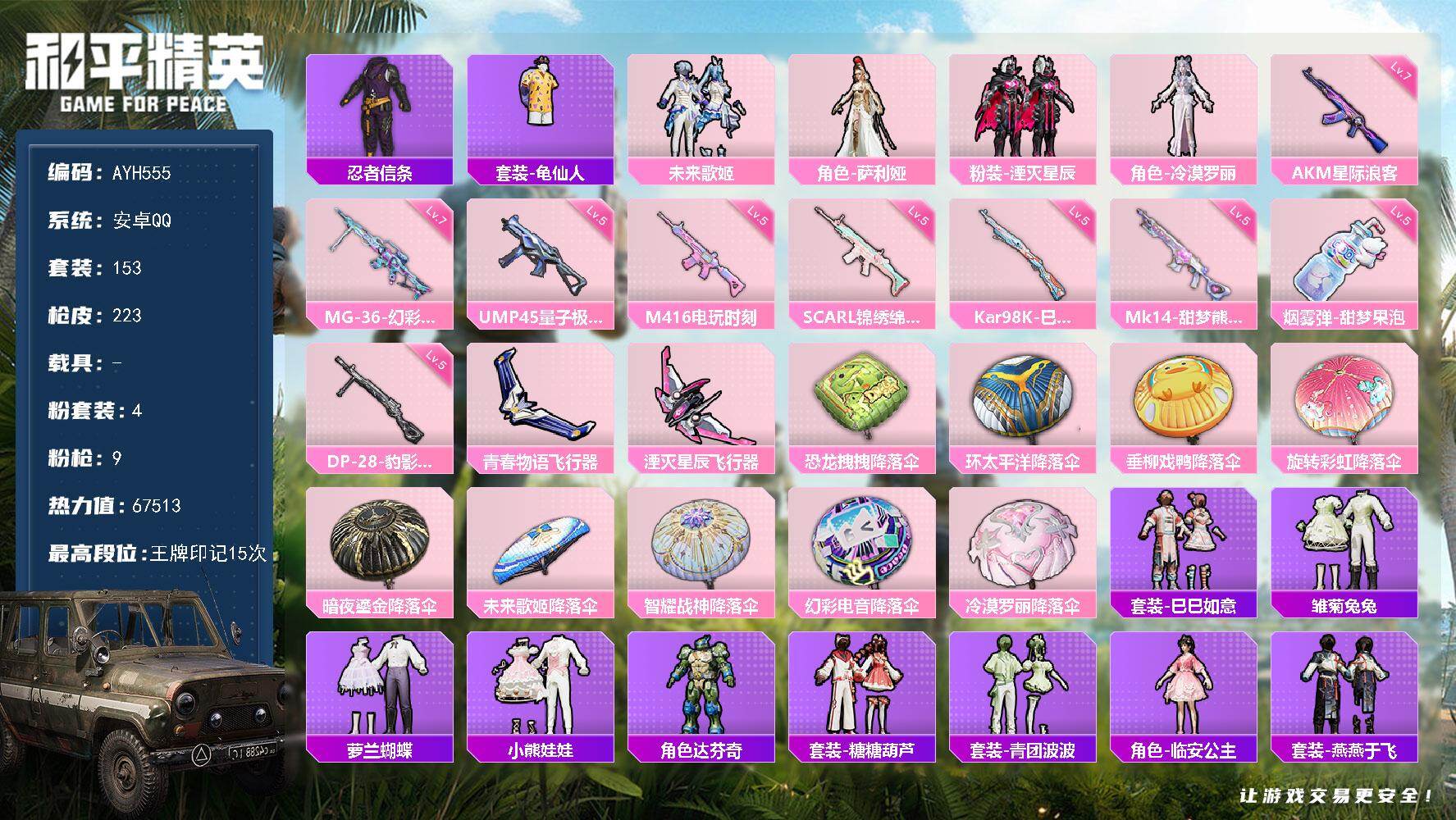 [17799235]安卓 手Q-4粉装-9特效枪-0载具-2粉色飞行器-67513热力值-15王牌印记-153套装-223枪皮