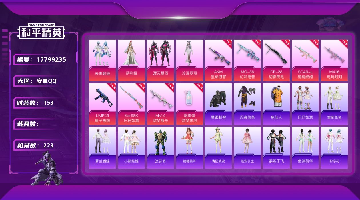 [17799235]安卓 手Q-4粉装-9特效枪-0载具-2粉色飞行器-67513热力值-15王牌印记-153套装-223枪皮 【热门品类】:套装-忍者信条,套装-龟仙人 【粉色套装】:粉装-未来歌姬,角色-萨利娅,粉装-湮灭星辰,角色-冷漠罗丽 【粉色枪皮等级】:AKM-星际浪客(七级),SCAR-L-锦绣绵绵(五级),M416-电玩时刻(五级),UMP45-量子极限(五级),Kar98K-巳巳如意(五级),Mk14-甜梦熊击(五级),DP-28-豹影疾电(五级),MG-36-幻彩电音(七级),烟雾弹-甜梦果泡(五级) 【粉色枪皮】:AKM-星际浪客,SCAR-L-锦绣绵绵,M416-电玩时刻,UMP45-量子极限,Kar98K-巳巳如意,Mk14-甜梦熊击,DP-28-豹影疾电,MG-36-幻彩电音,烟雾弹-甜梦果泡 【粉色飞行器】:青春物语飞行器,湮灭星辰飞行器 【粉色降落伞】:恐龙拽拽降落伞,环太平洋降落伞,垂柳戏鸭降落伞,旋转彩虹降落伞,暗夜鎏金降落伞,未来歌姬降落伞,智耀战神降落伞,幻彩电音降落伞,冷漠罗丽降落伞 【稀有套装】:套装-龟仙人,套装-巳巳如意,套装-雏菊兔兔,套装-萝兰蝴蝶,套装-小熊娃娃,角色-达芬奇,套装-糖糖葫芦,套装-青团波波,角色-临安公主,套装-燕燕于飞,套装-鱼渊荷华,套装-粉恋花,套装-紫幽梦,套装-蓝冰羽,套装-霓虹热舞,套装-极速光影,套装-彩虹兔,套装-云朵鹅,套装-雪绒豹,角色-灵公主 【稀有枪皮】:AKM-彩虹符号,AKM-影袭,AKM-王牌投手,AKM-萌趣颜团子,AKM-霓虹街区,AKM-龙的传人,M16A4-幻世战舞者,M16A4-甜心亚梦,M16A4-最终圣卫者,SCAR-L-夜灯,SCAR-L-玉兔迎春,SCAR-L-碧影闪光,SCAR-L-红色方程式,SCAR-L-银碳小老虎,SCAR-L-黄金龙骨,M416-糯团青竹,M416-蓝色火焰,GROZA-彩虹符号,GROZA-影袭,GROZA-懵萌河马,GROZA-田园牧歌,GROZA-紫翼圣骑,AUG-天降萌叽,AUG-耀粉歌者,AUG-闲梦青缨,AUG-青春冒险家,QBZ-彩虹符号,QBZ-飞驰魅影,M762-天降萌叽,M762-彩虹符号,M762-快乐主宰,M762-诡娃娃,M762-云朵鹅,Mk47-妙红点点,Mk47-炫光之旅,G36C-懵萌河马,AC-VAL-天